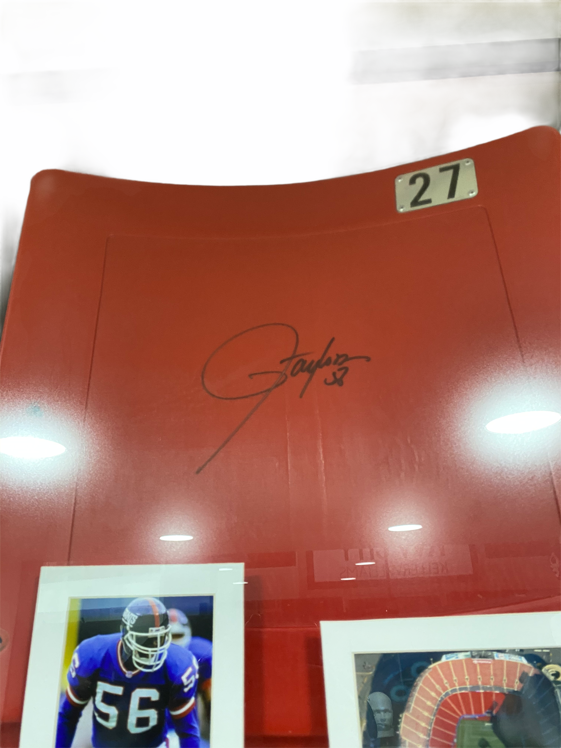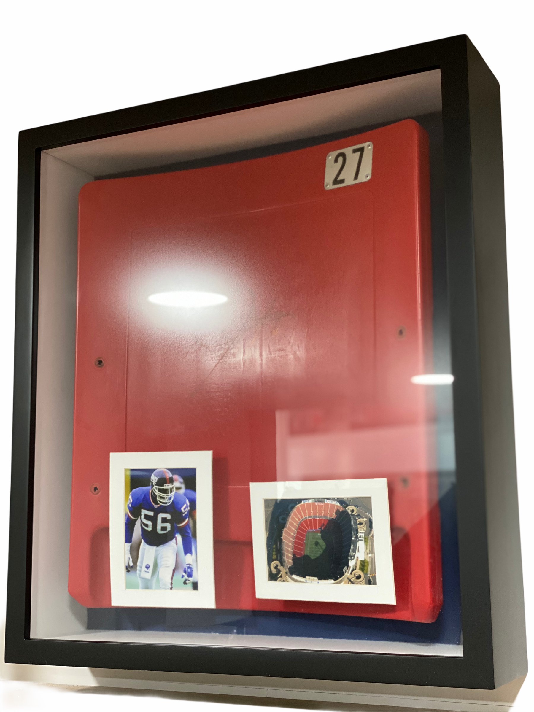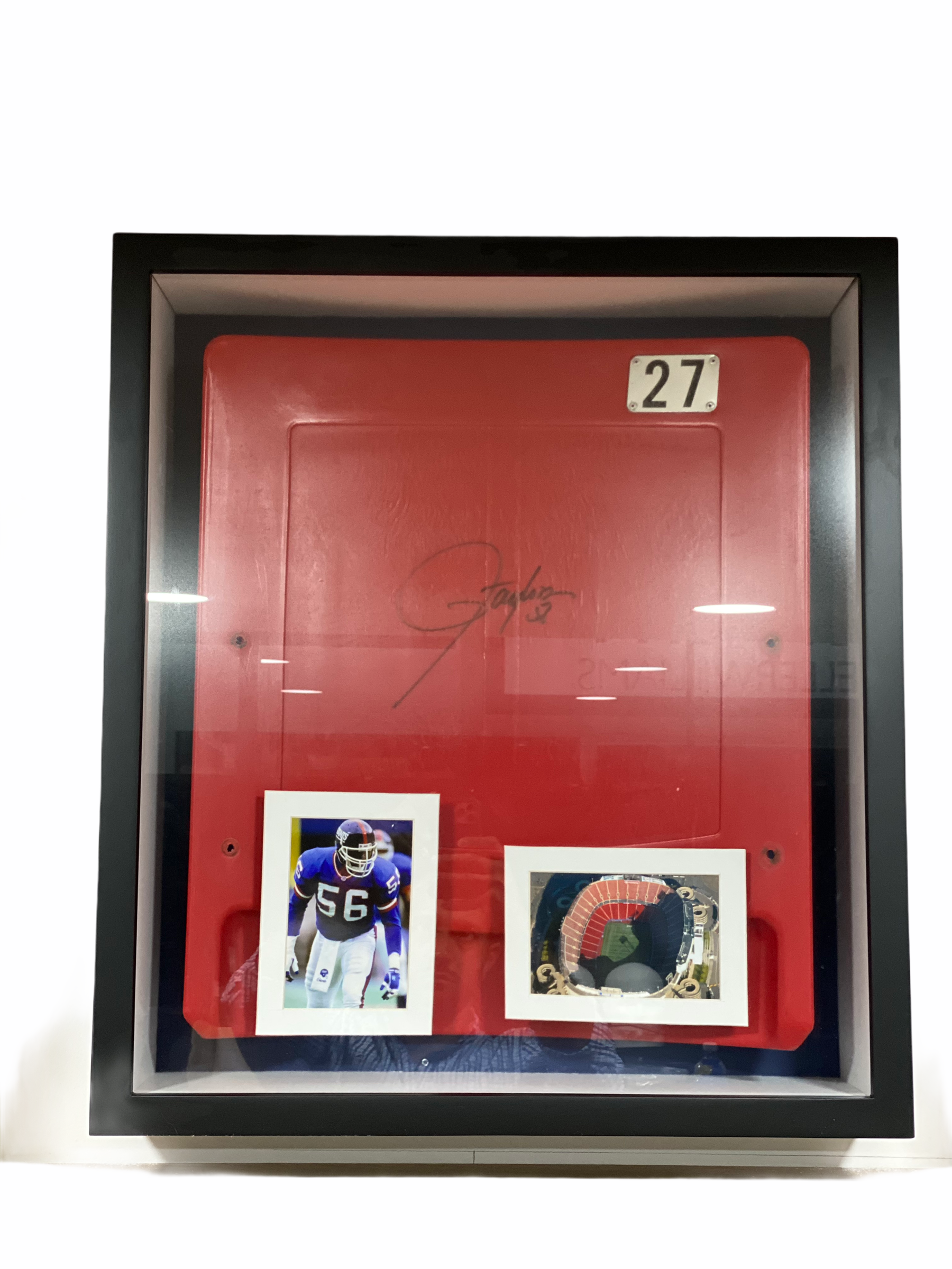 Asiento del estadio de los Giants enmarcado, autografiado por Lawrence Taylor.