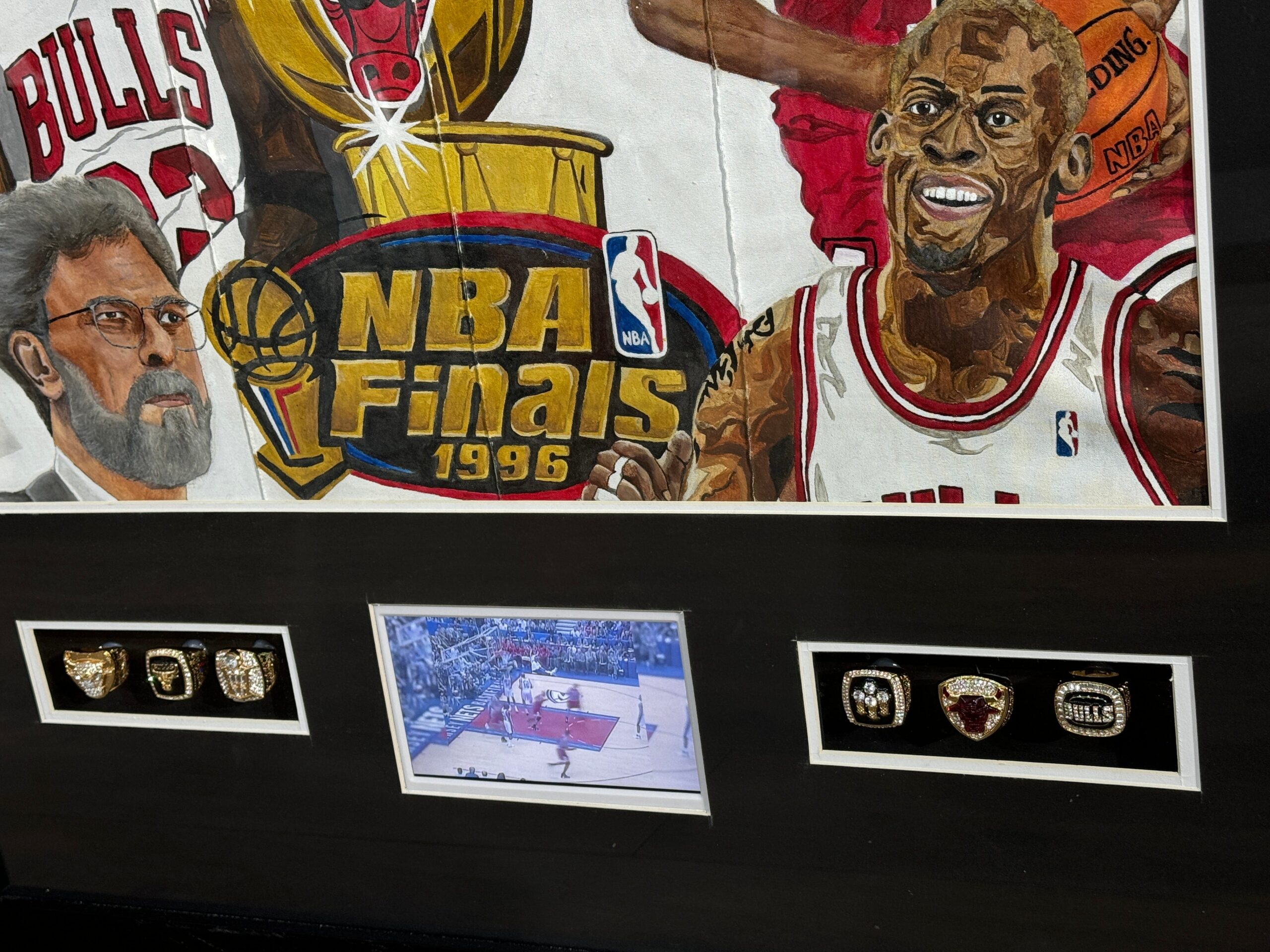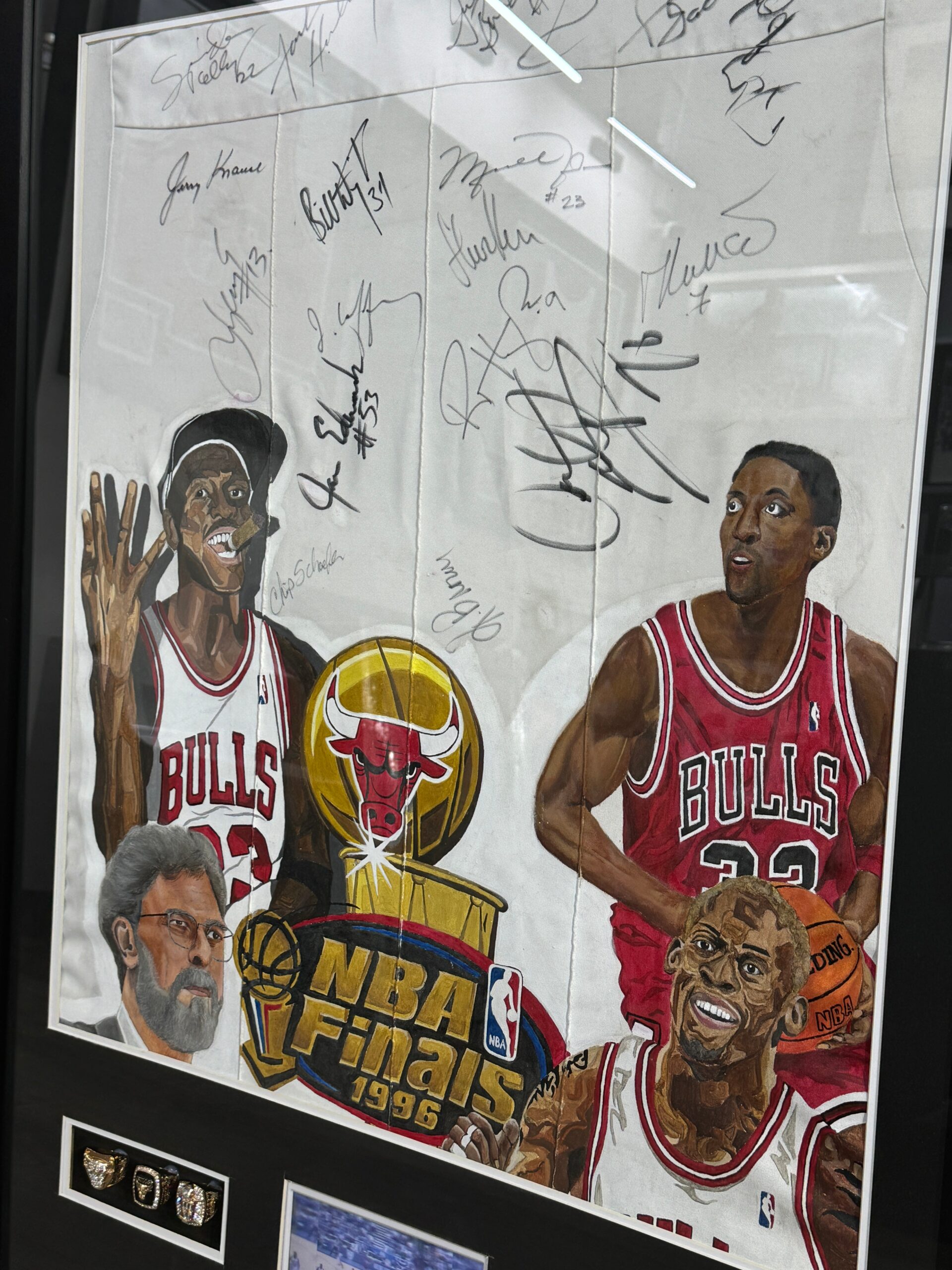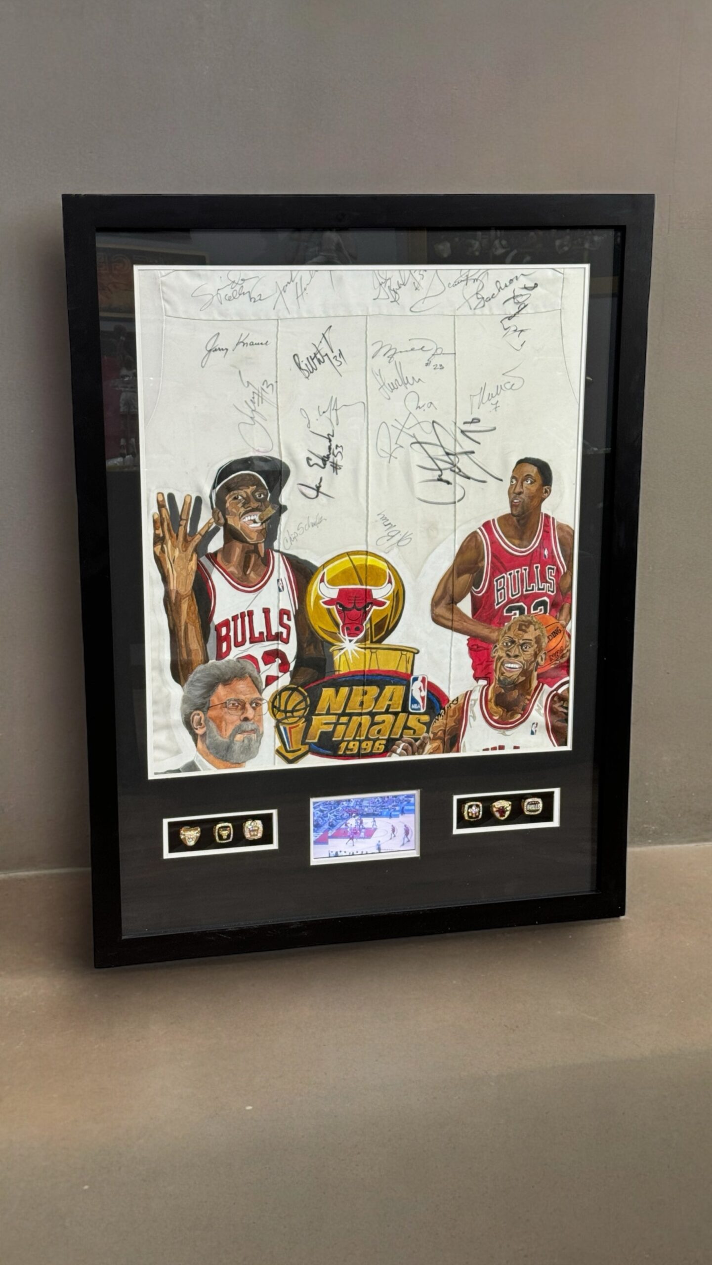 Camisa intervenida por uno de los artistas mas reconocidos a nivel mundial y autografiado por jugadores de los Bulls de 1991.