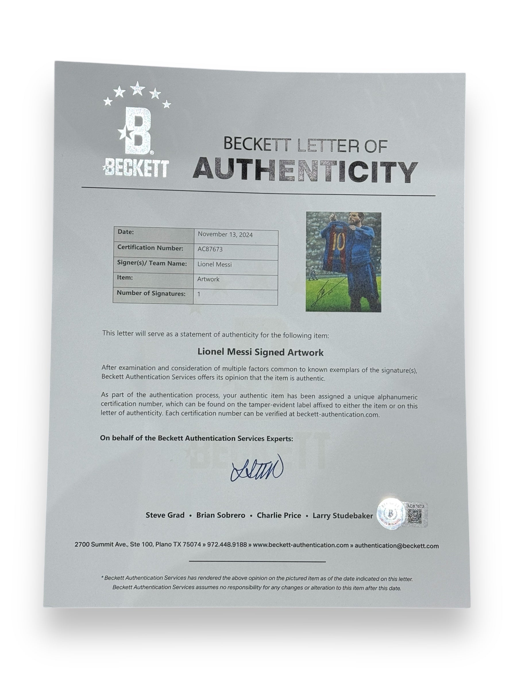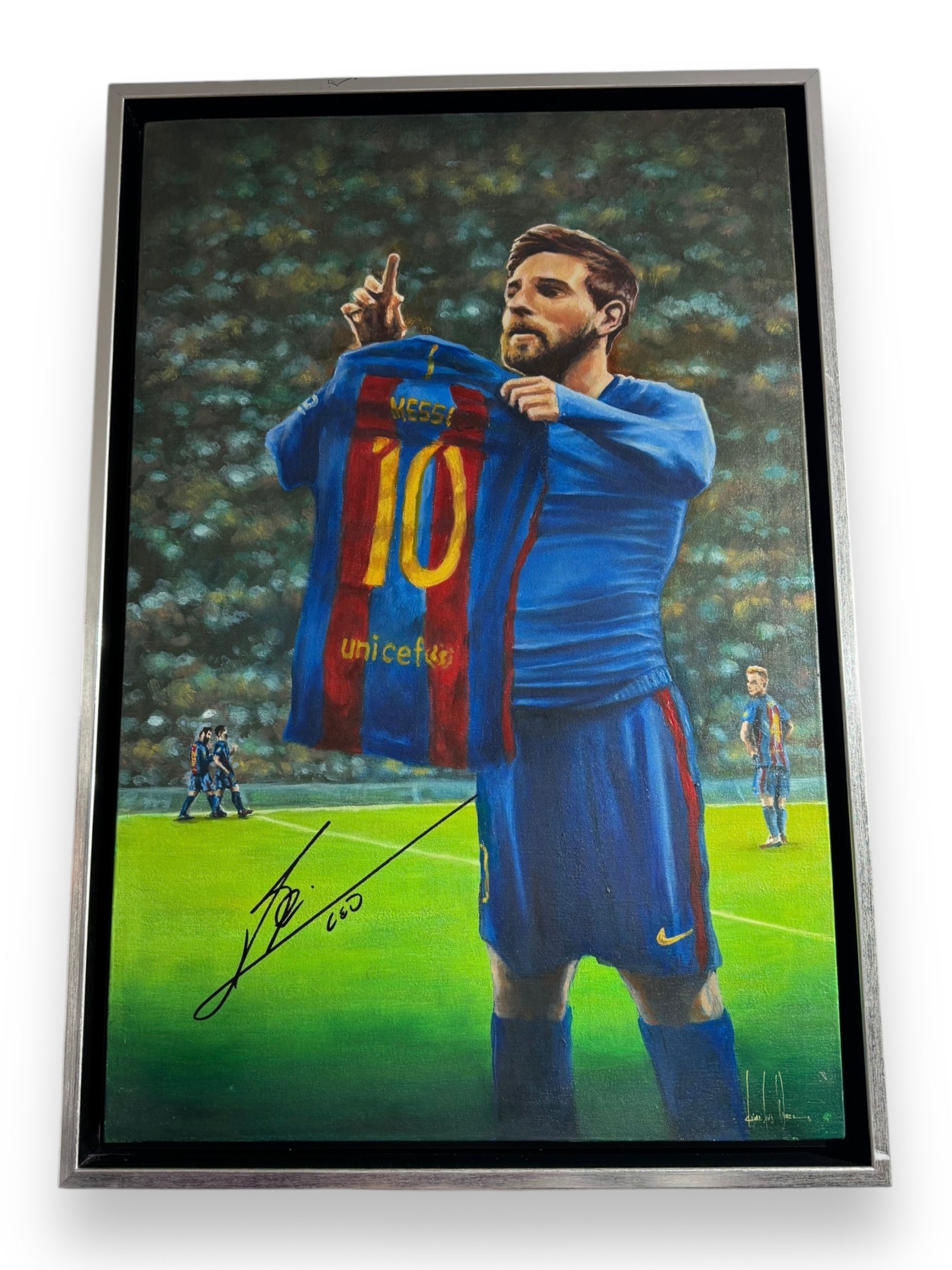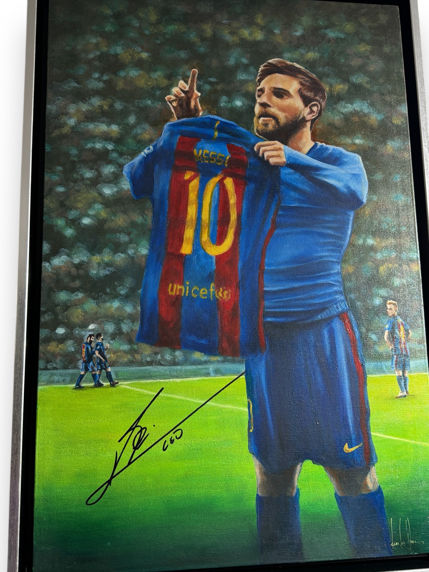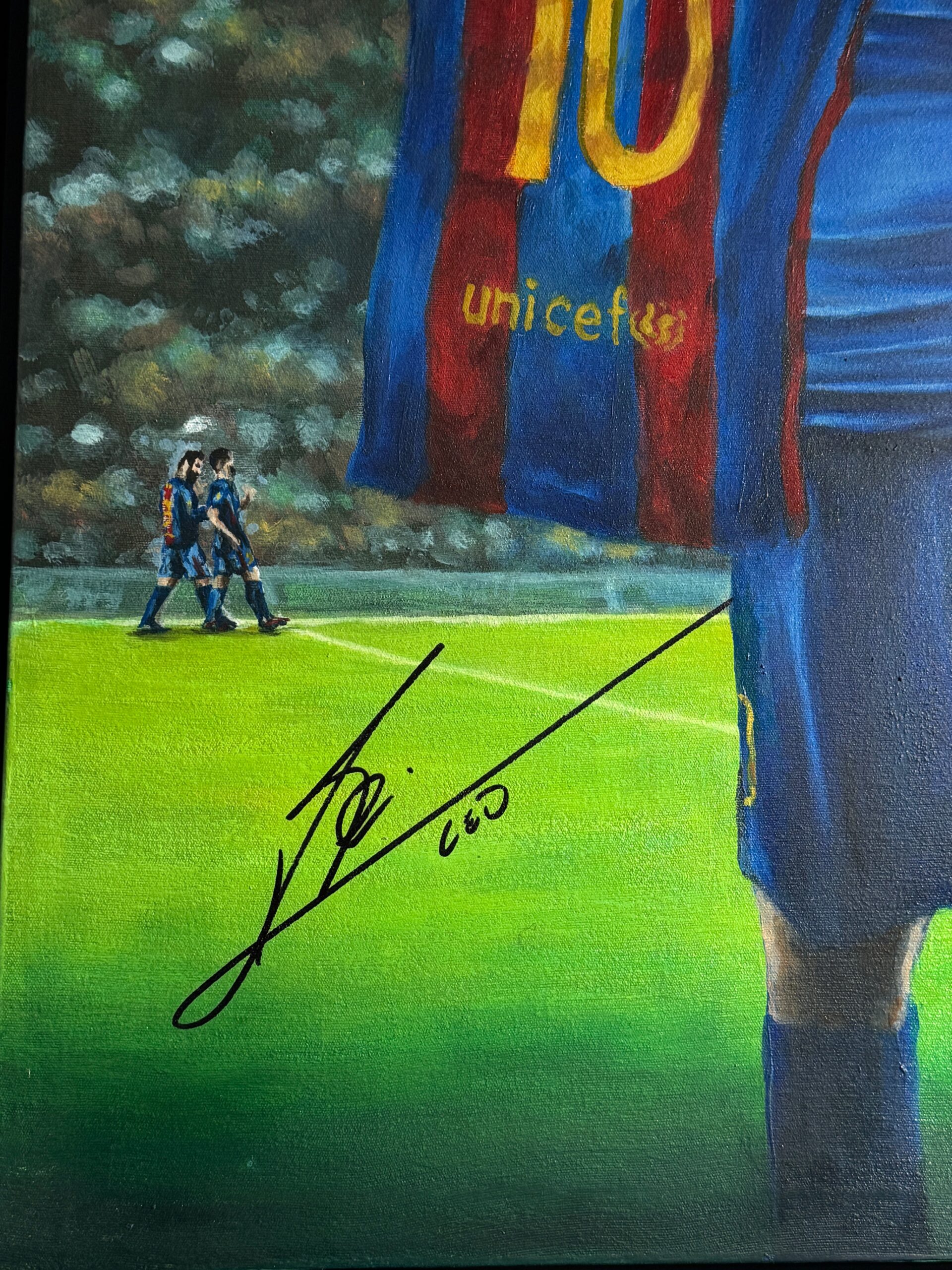 Canvas pintado a mano, autografiado por el jugador leyenda del Futbol, Lionel Messi