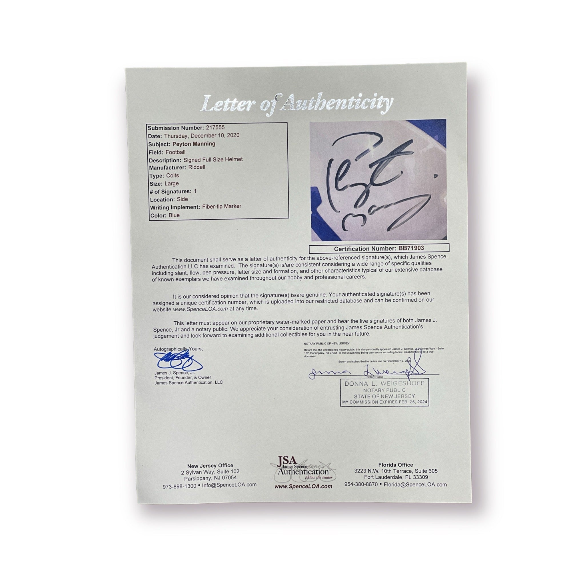 Casco PROFESIONAL autografiado por el jugador de los Colts Peyton Maning