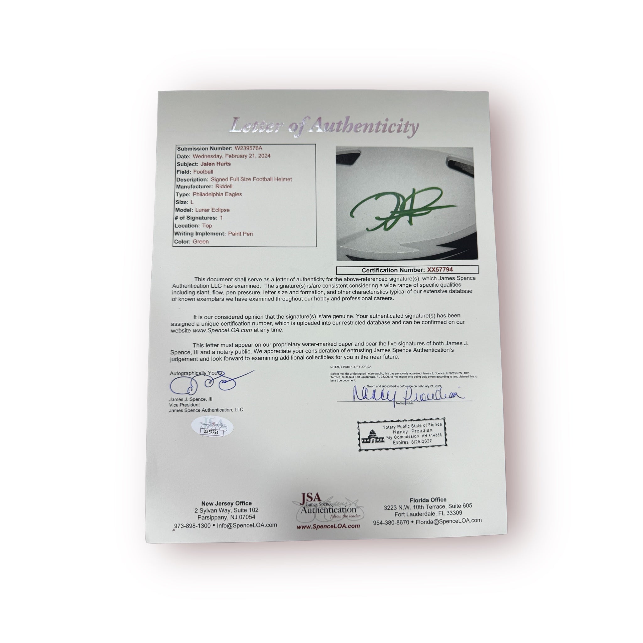Casco proline autografiado por el jugador de los Eagles Jalen Hurts