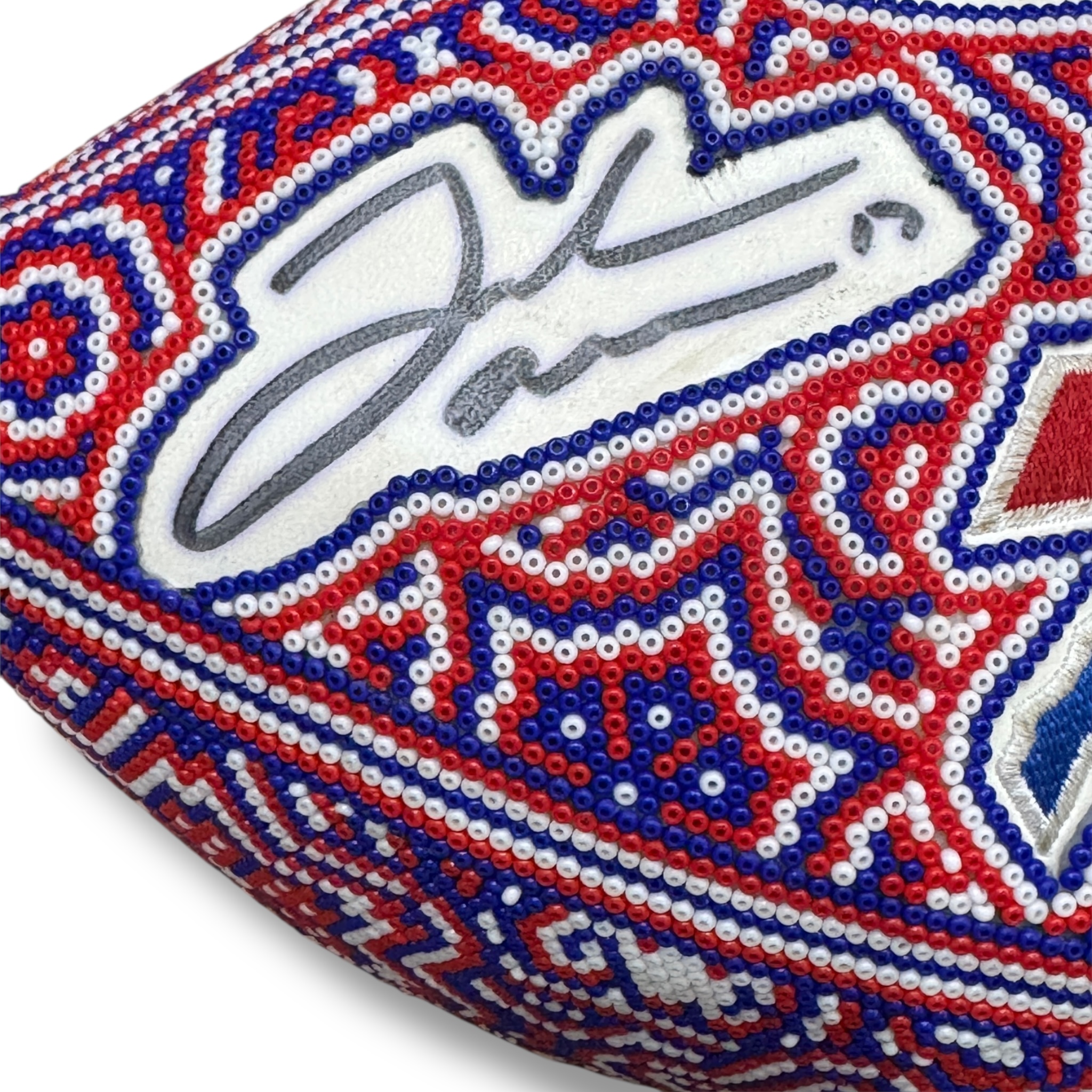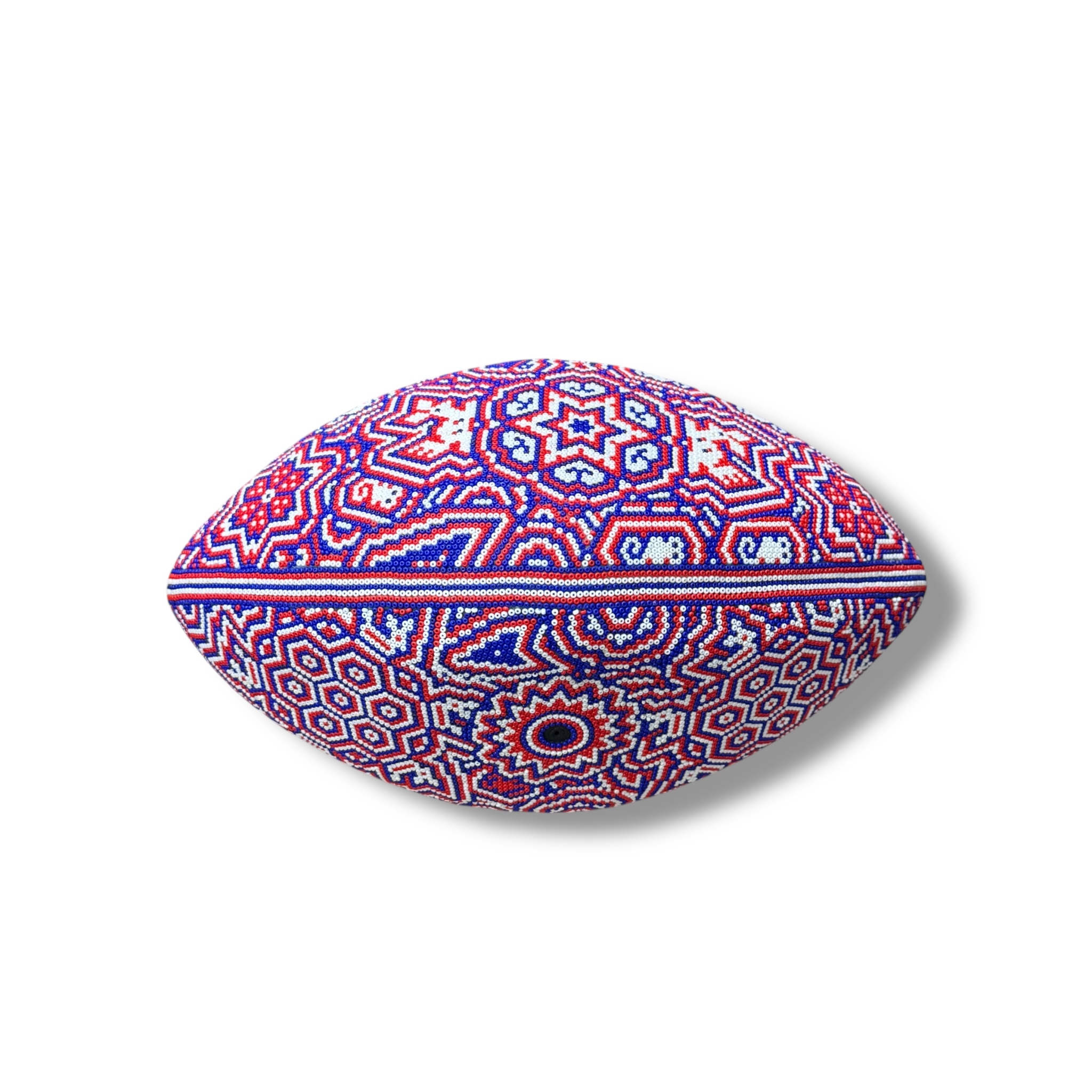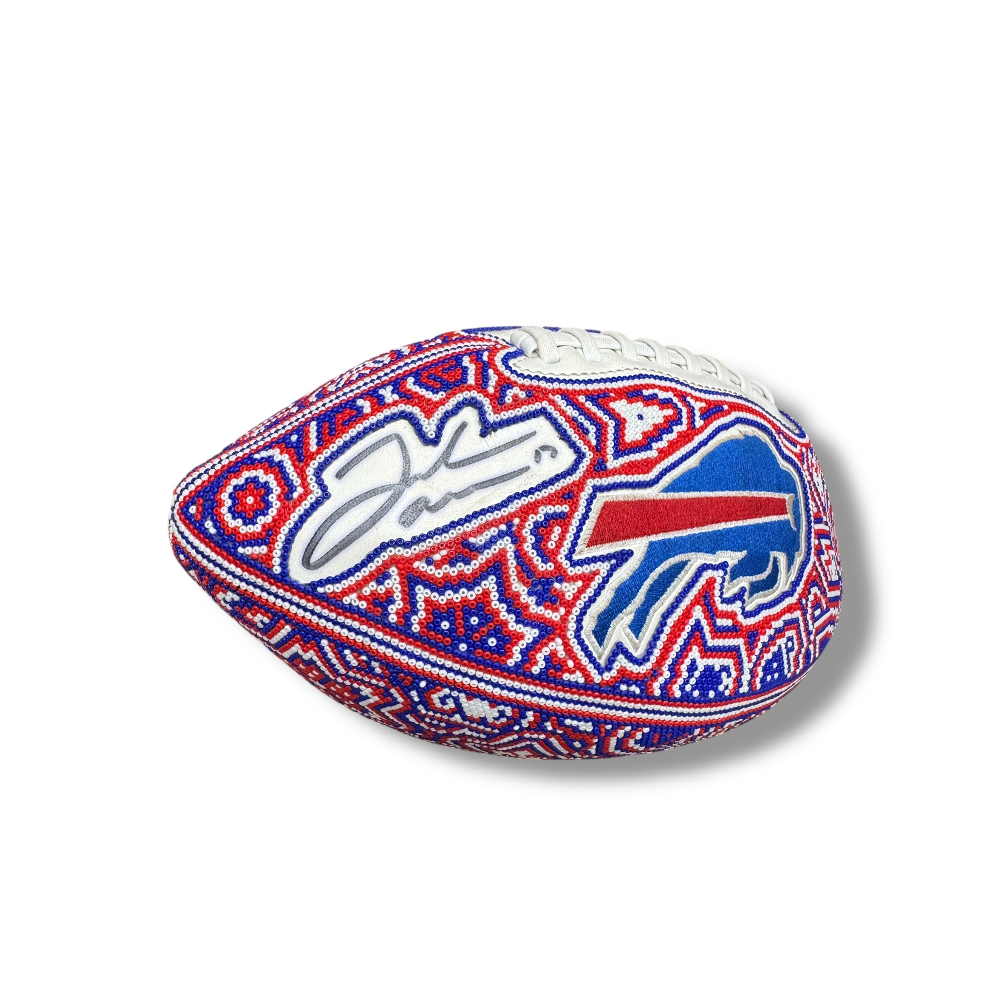 Balon con arte huichol, autografiado por el jugador de los Bills, Josh Allen. Una verdadera obra de arte que envuelve la firma de uno de los mejores jugadores de la actualidad en la NFL.