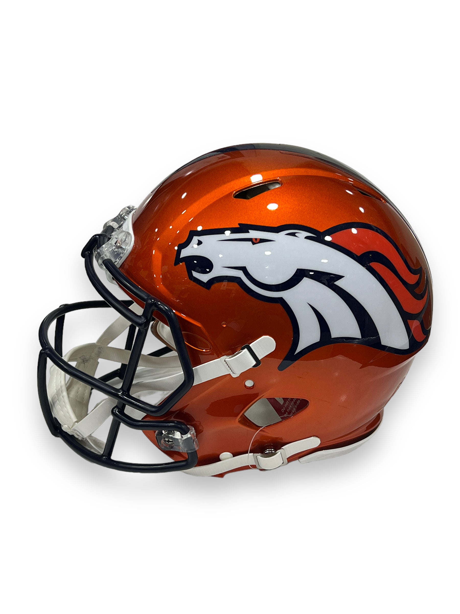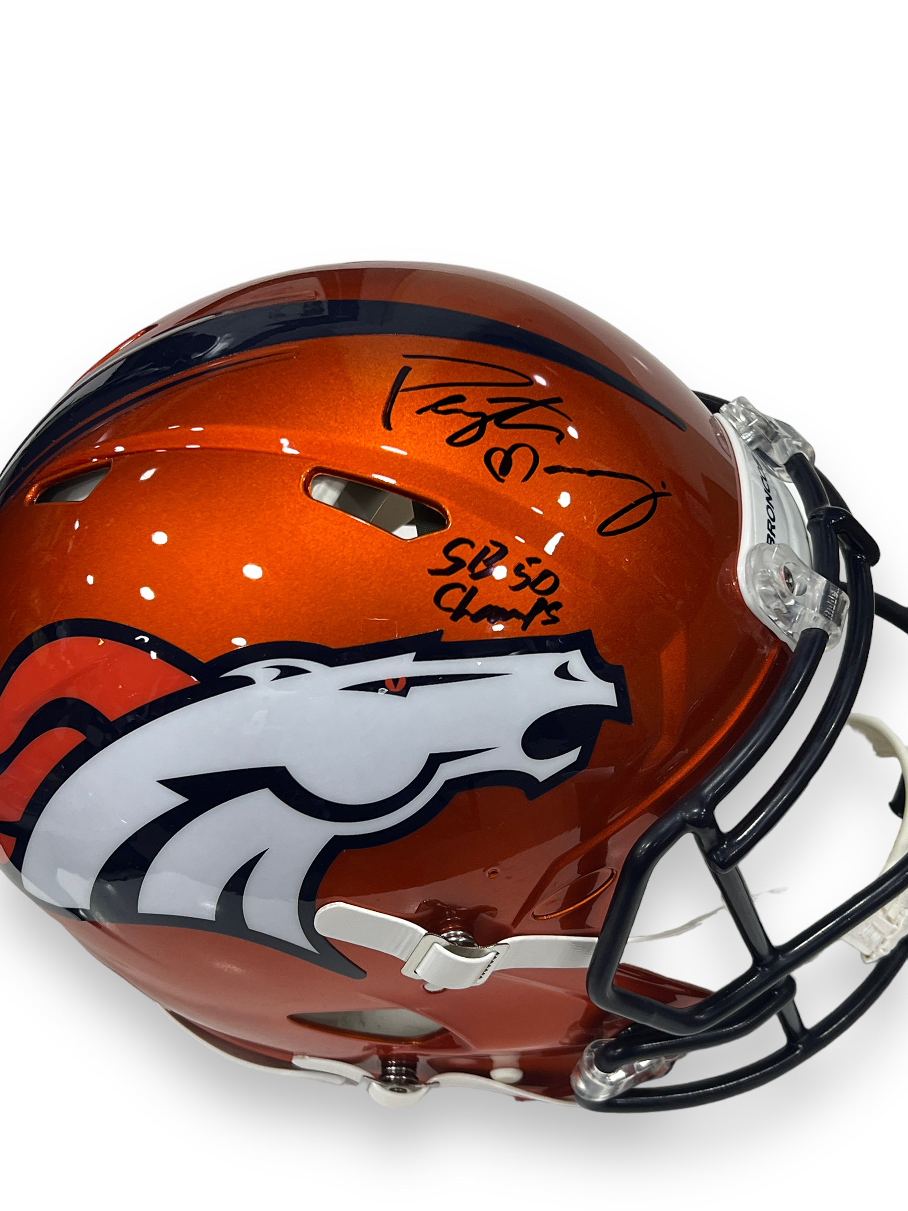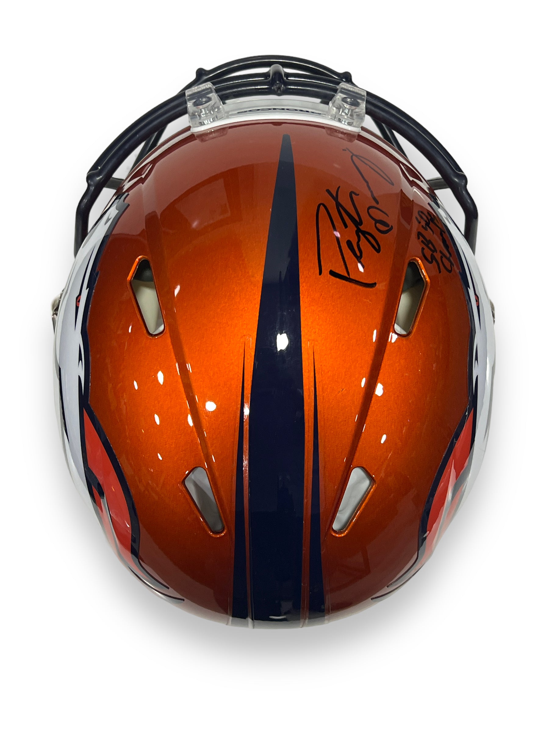 Casco PROFESIONAL autografiado por el jugador de los Broncos Peyton Manning versión retiro. Este casco es muy especial, pues muestra todas las estadísticas de Manning durante su carrera tanto en los Colts como en los Broncos. En los dos equipos fue campeón del Super Bowl.