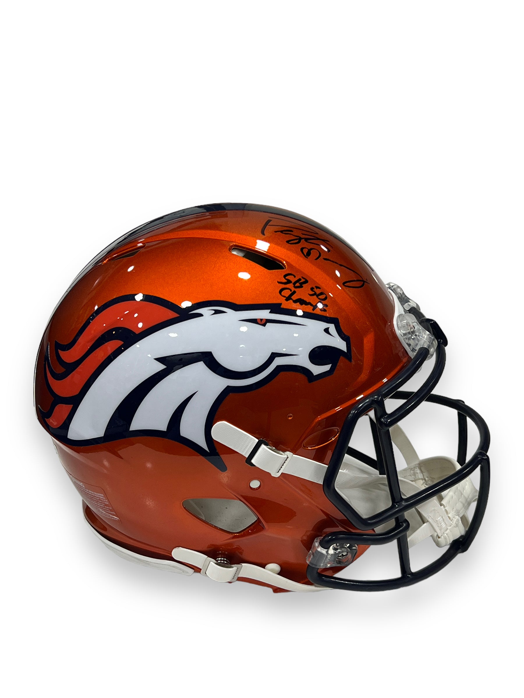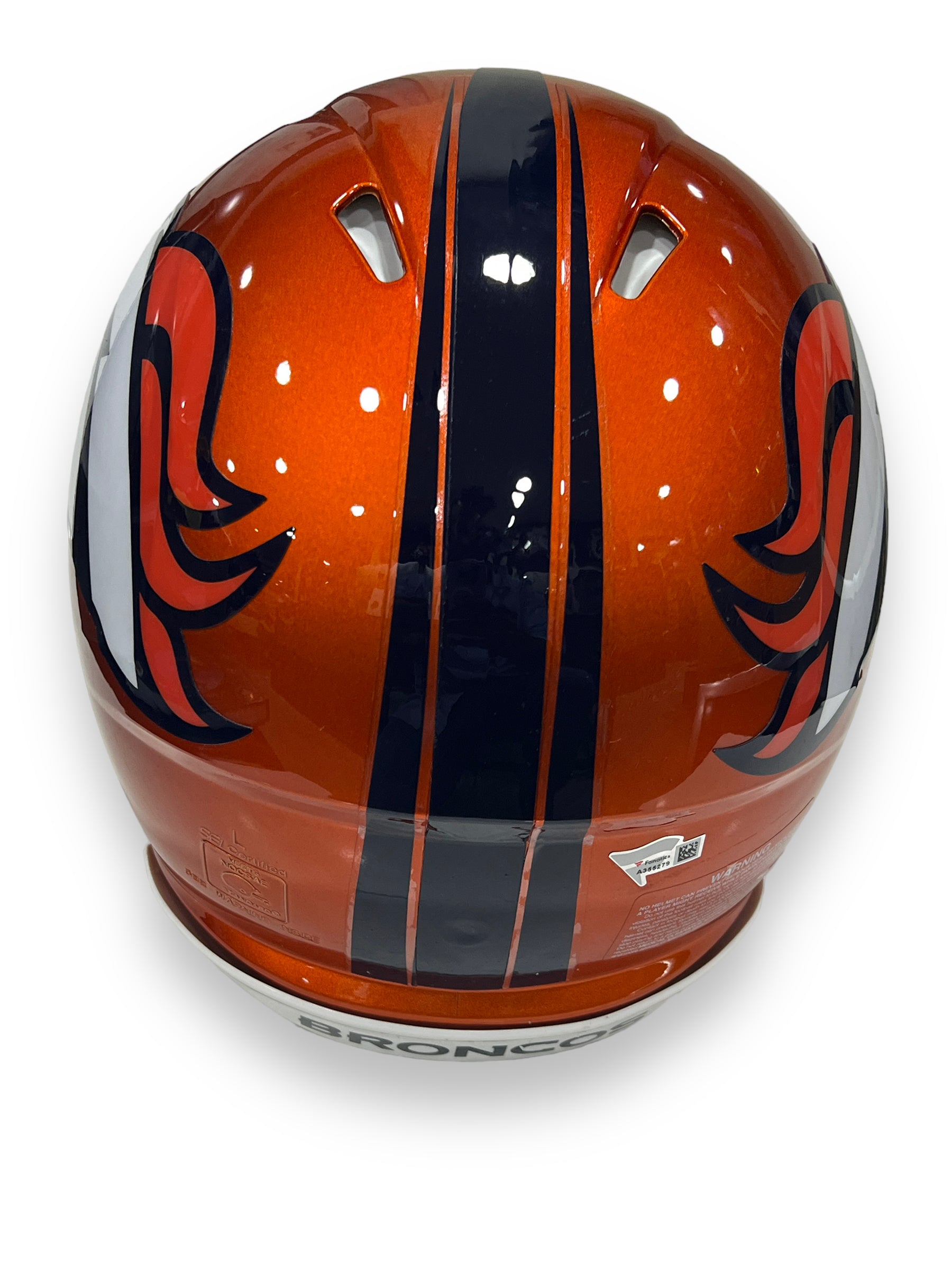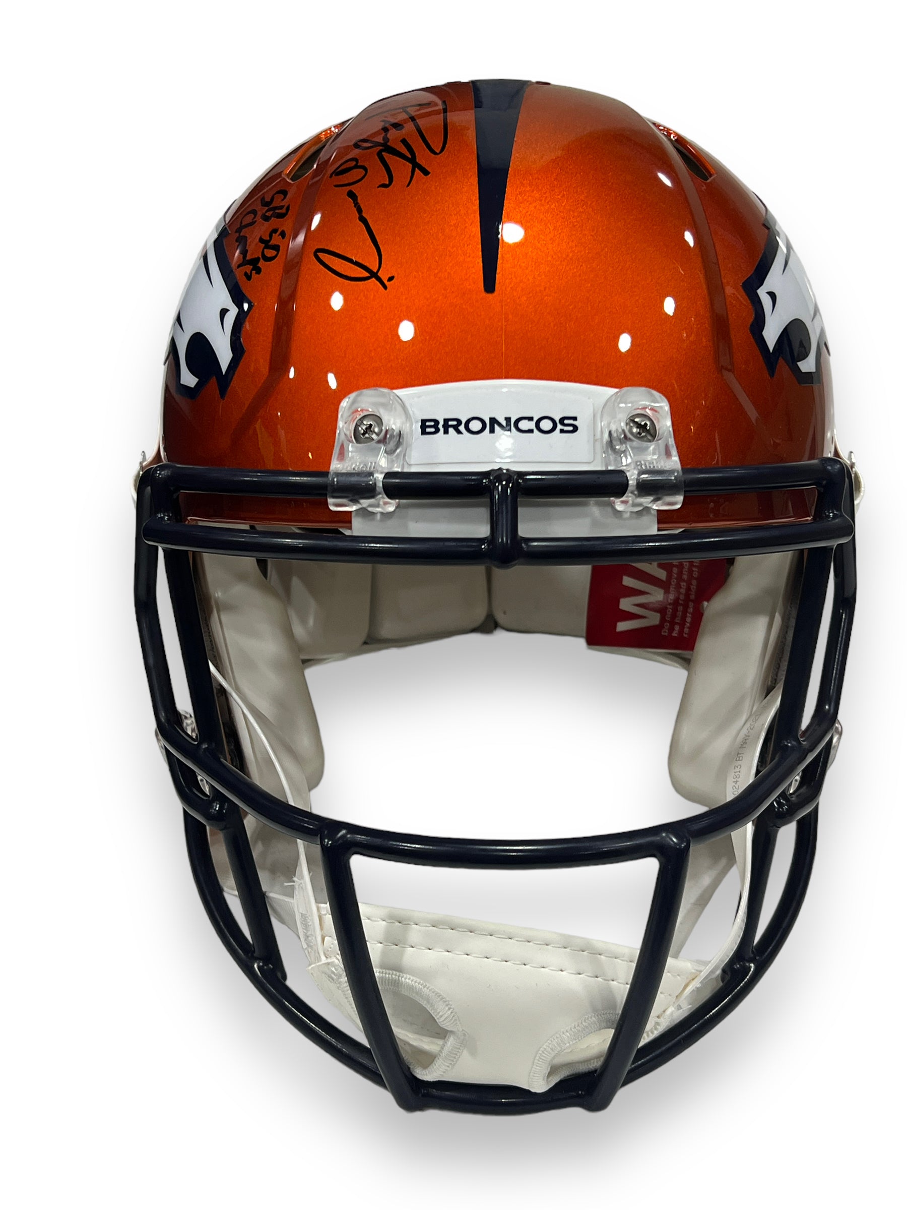 Casco PROFESIONAL autografiado por el jugador de los Broncos Peyton Manning versión retiro. Este casco es muy especial, pues muestra todas las estadísticas de Manning durante su carrera tanto en los Colts como en los Broncos. En los dos equipos fue campeón del Super Bowl.