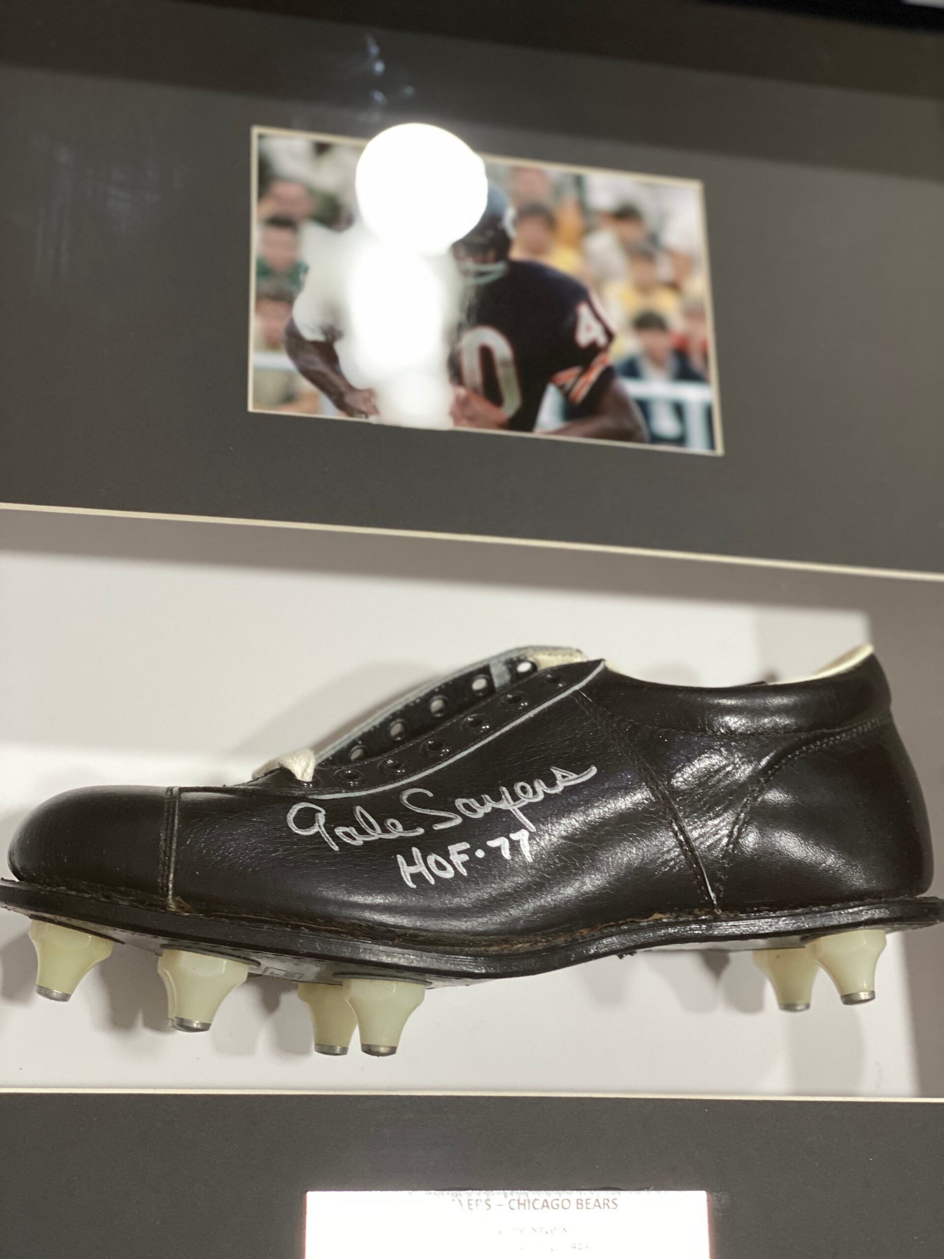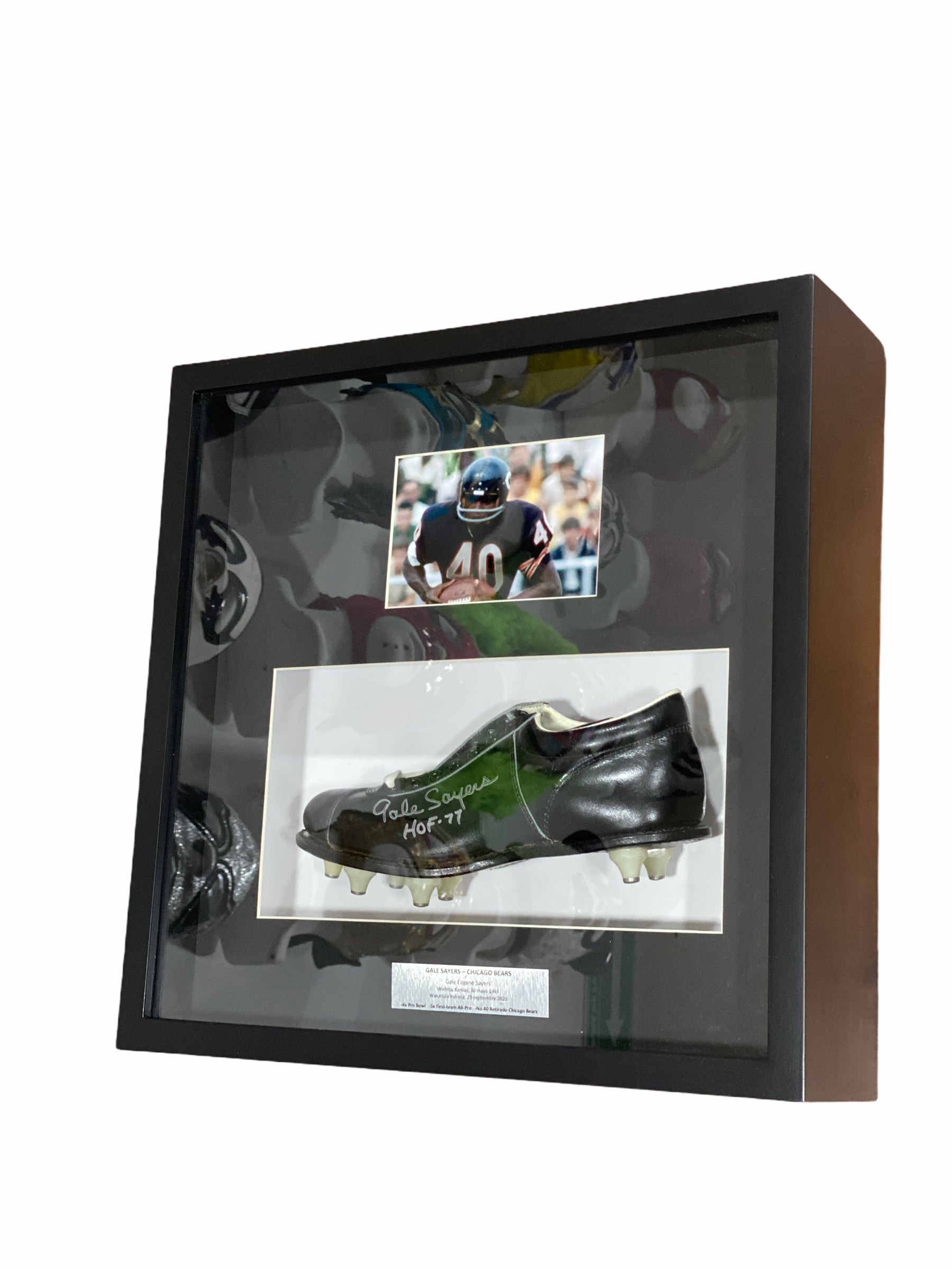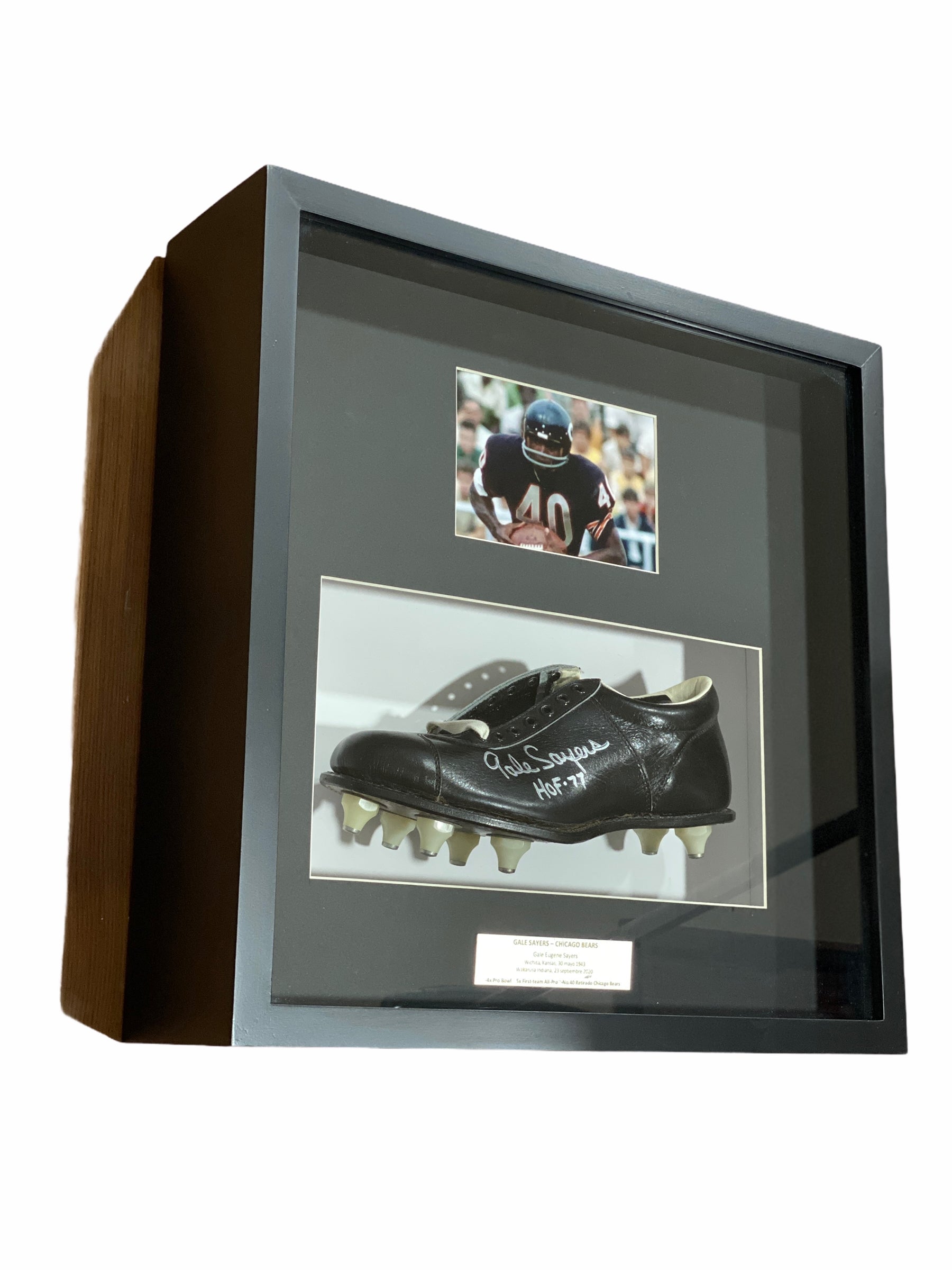 Cleat tenis enmarcado autografiado por el jugador de los Bears, Gale Sayers este producto cuenta con certificado