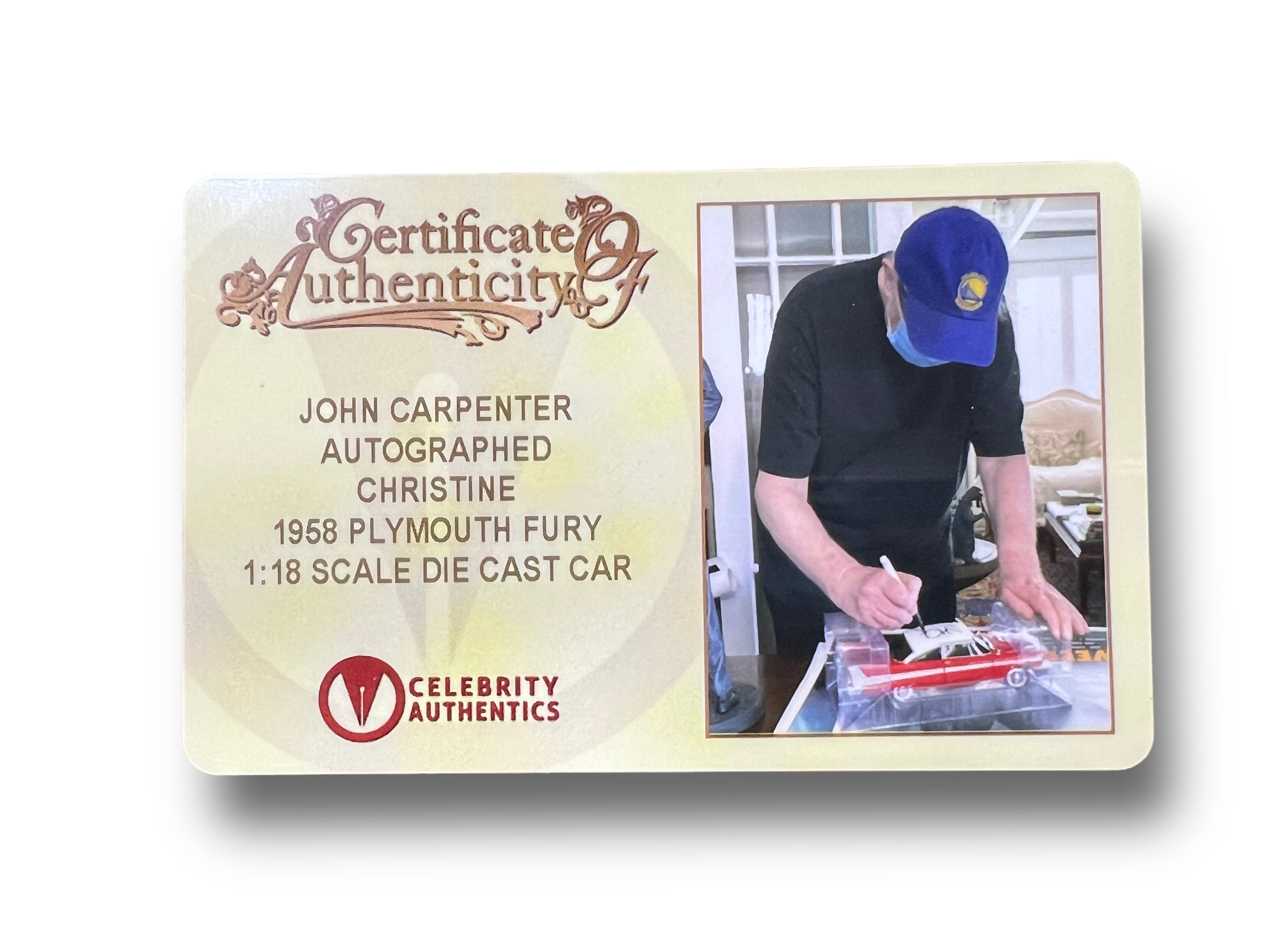 Coche a escala 1:18 autografiado por el director de cine, guionista y compositor John Carpenter de bandas sonoras estadounidense. Es calificado, junto con David Cronenberg y Wes Craven, como uno de los realizadores del género de terror más importantes, especialmente en las décadas de 1970 y 1980