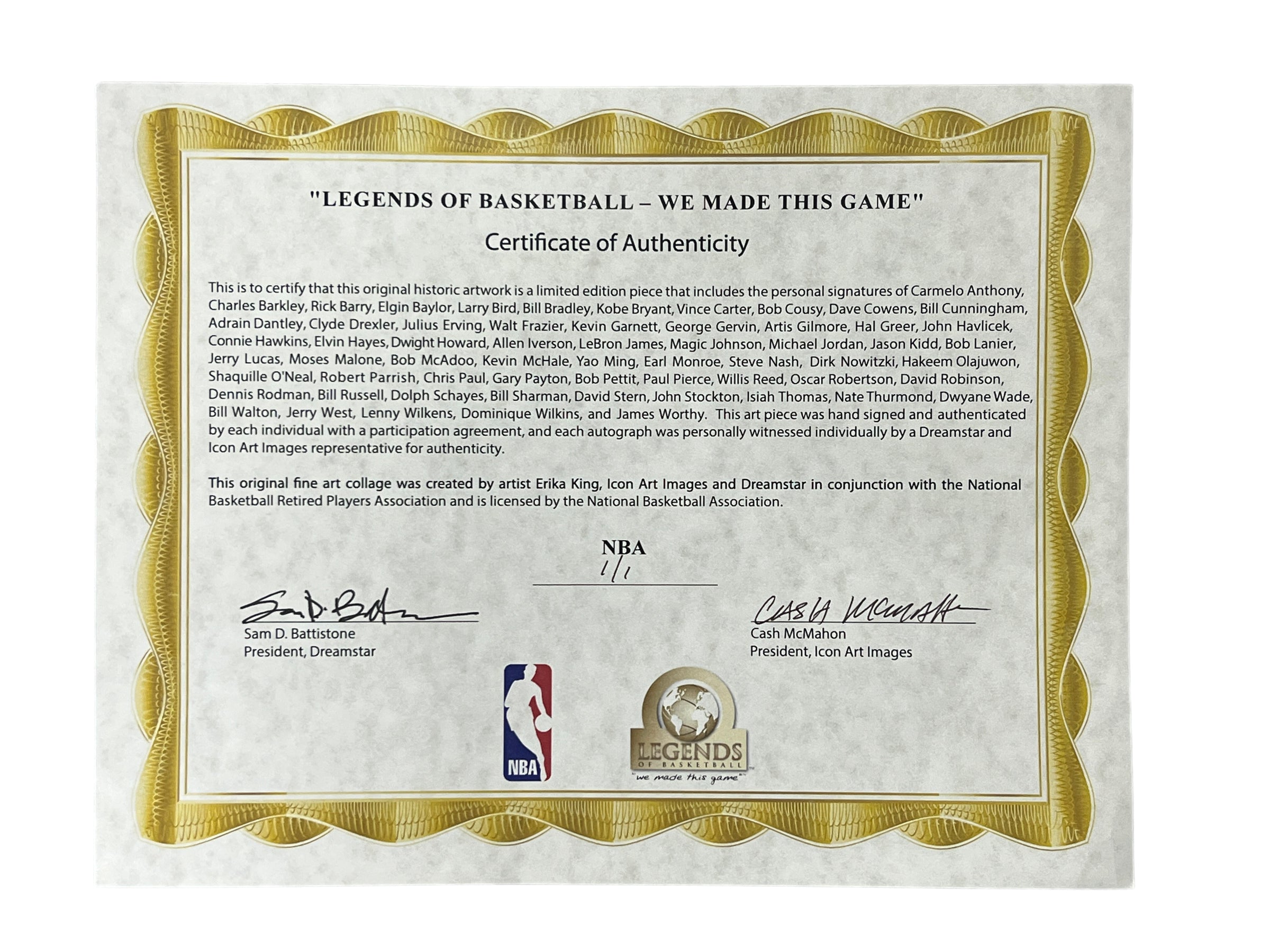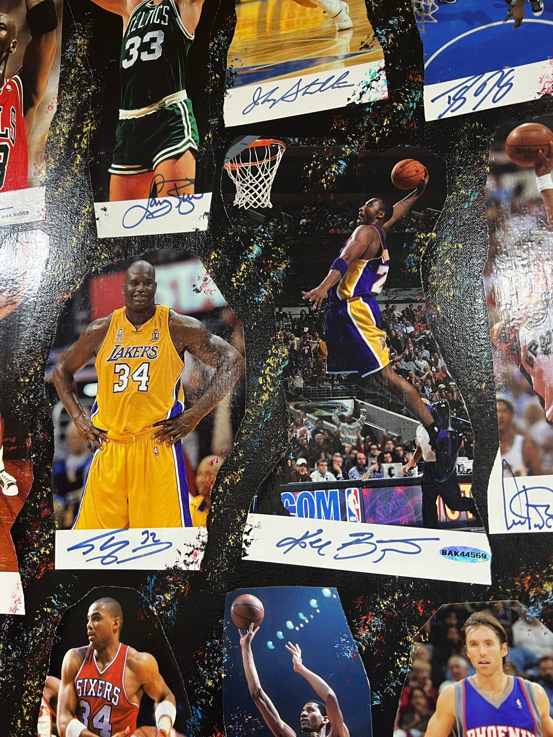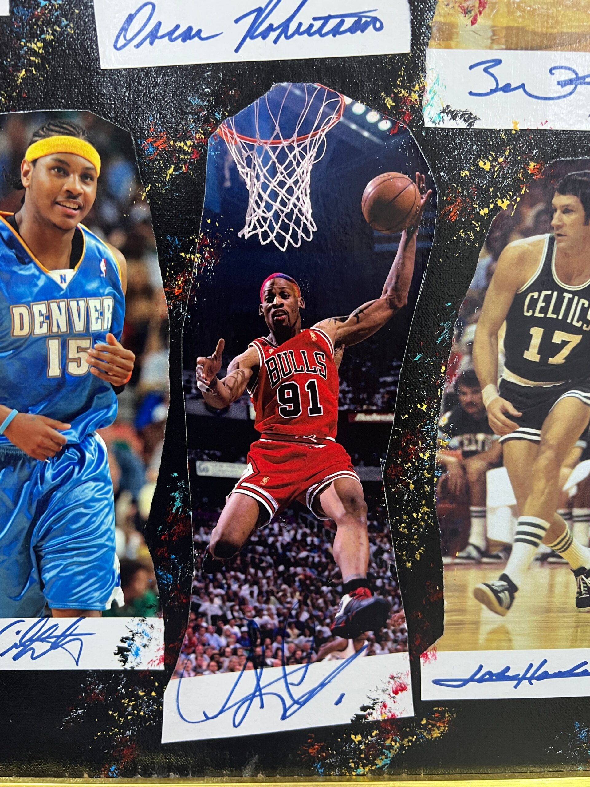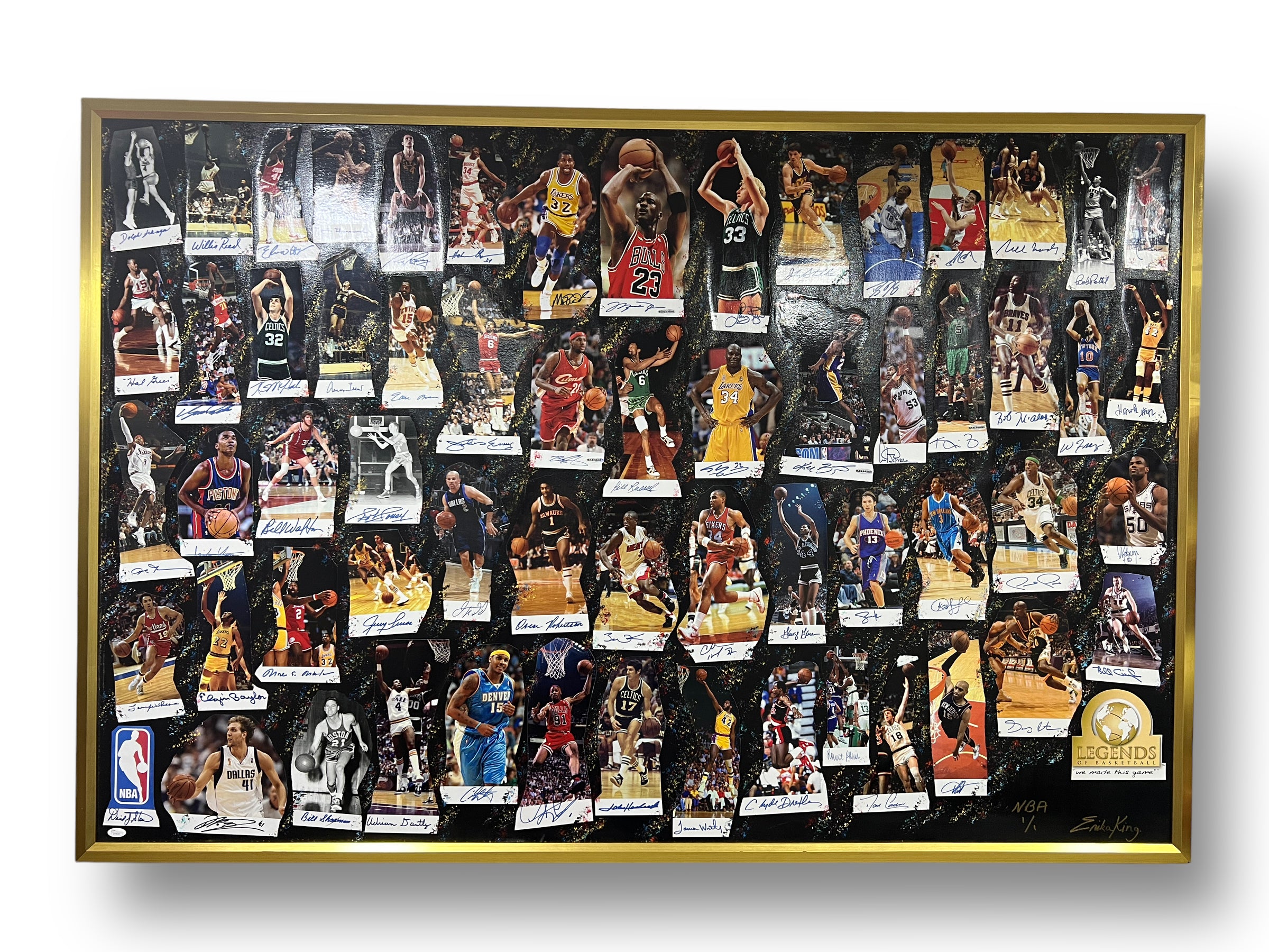 Cuadro autografiado por las leyendas históricas del Basketball. Esta obra de arte fué hecha por Erika king y certificada por Upper Deck y JSA.