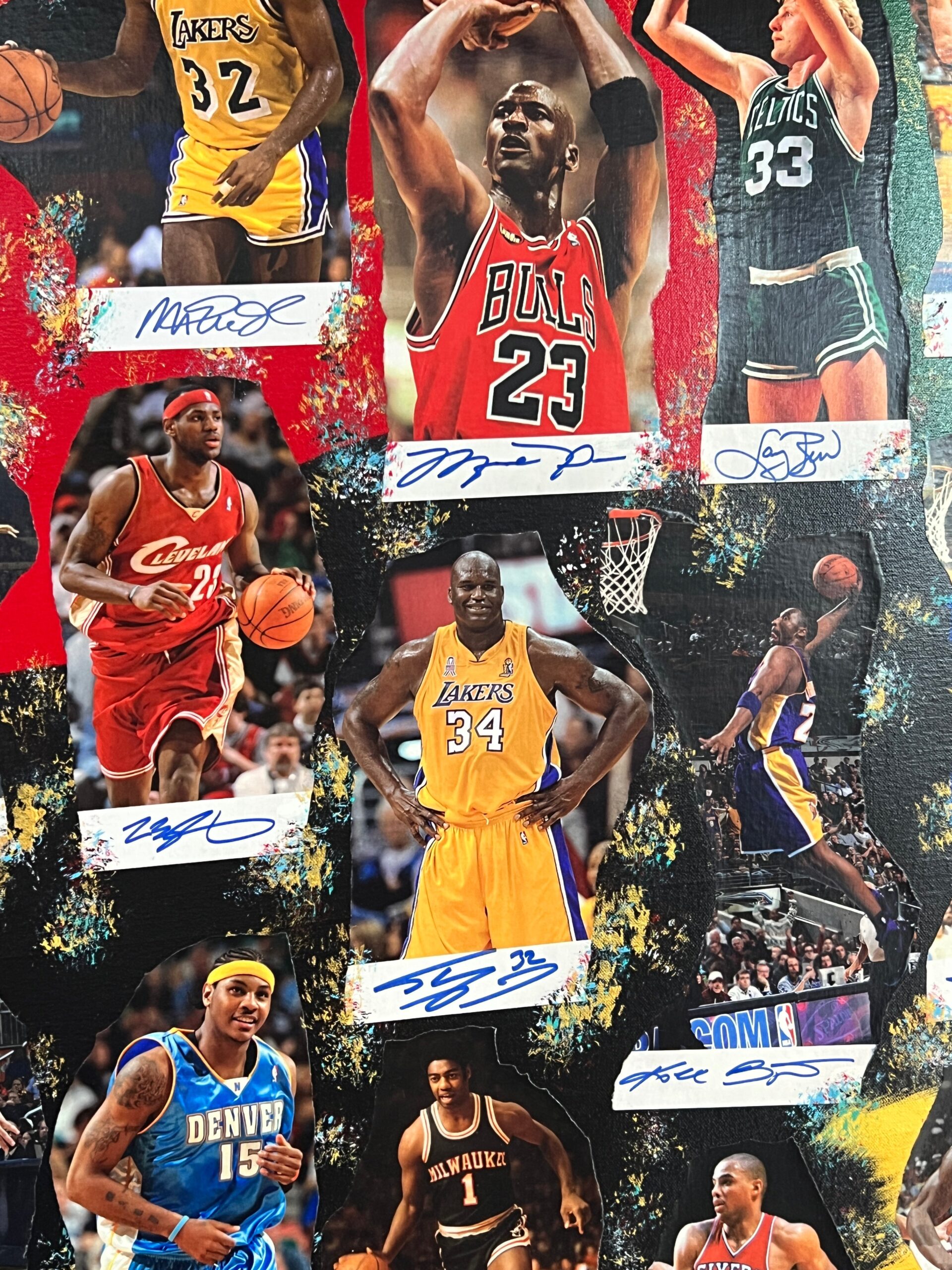 Cuadro autografiado por las leyendas históricas del Basketball. Esta obra de arte fue hecha por Erika king y certificada por y NBA.