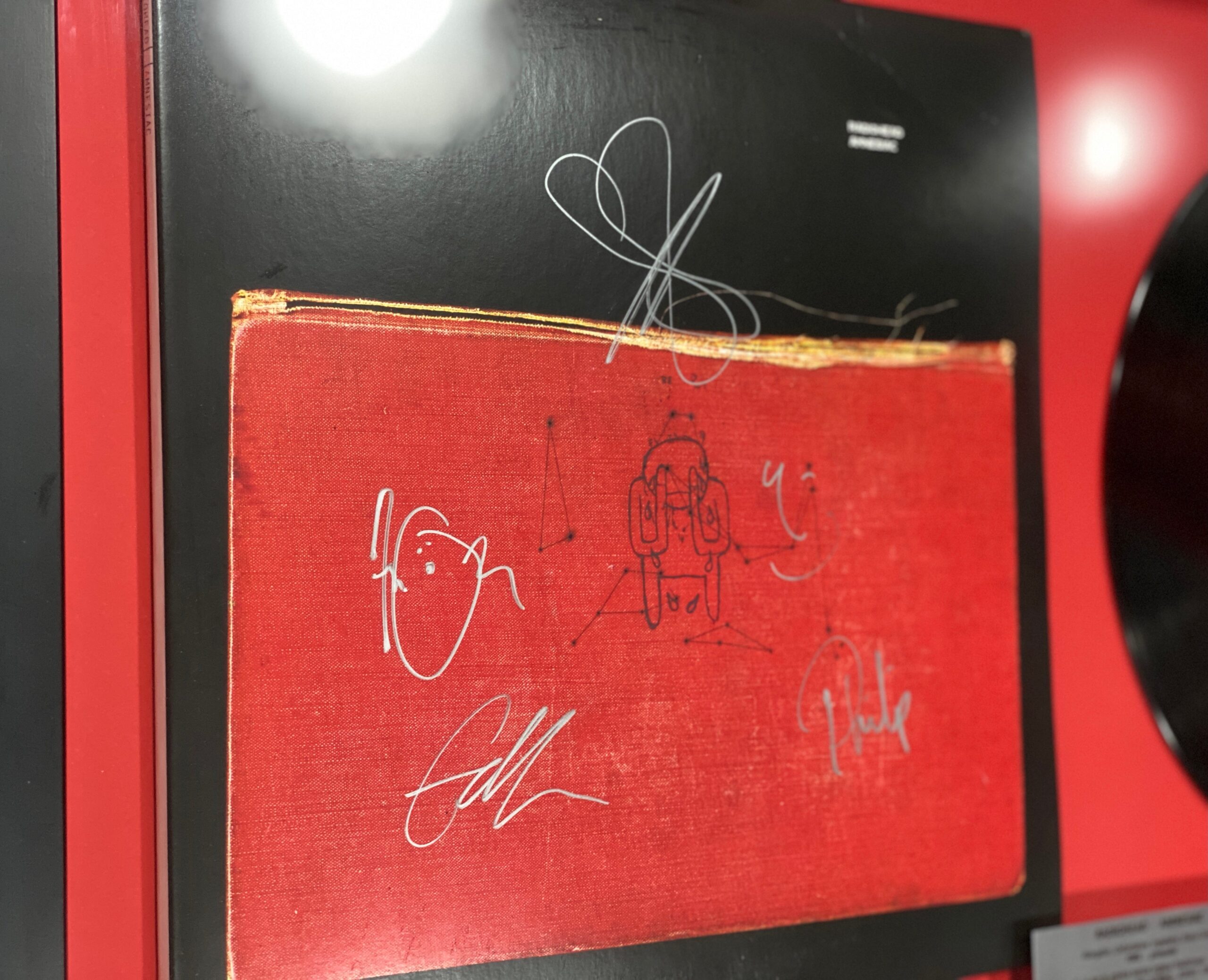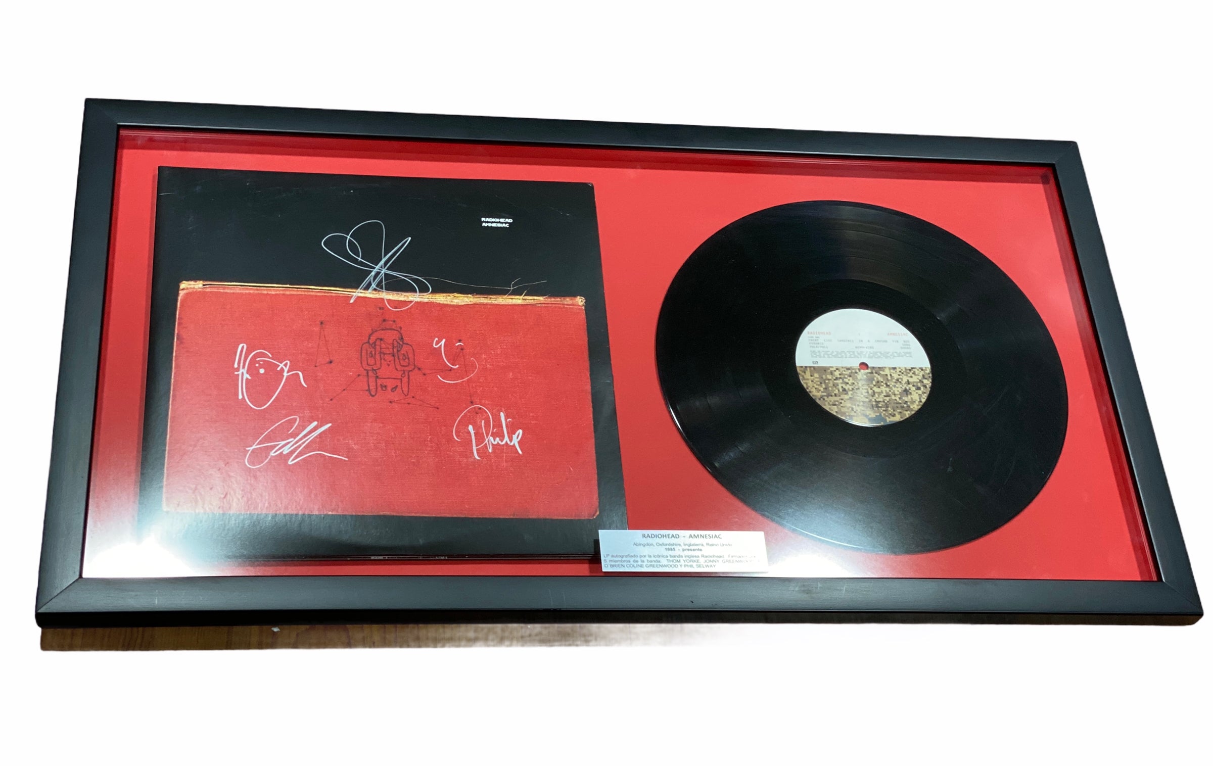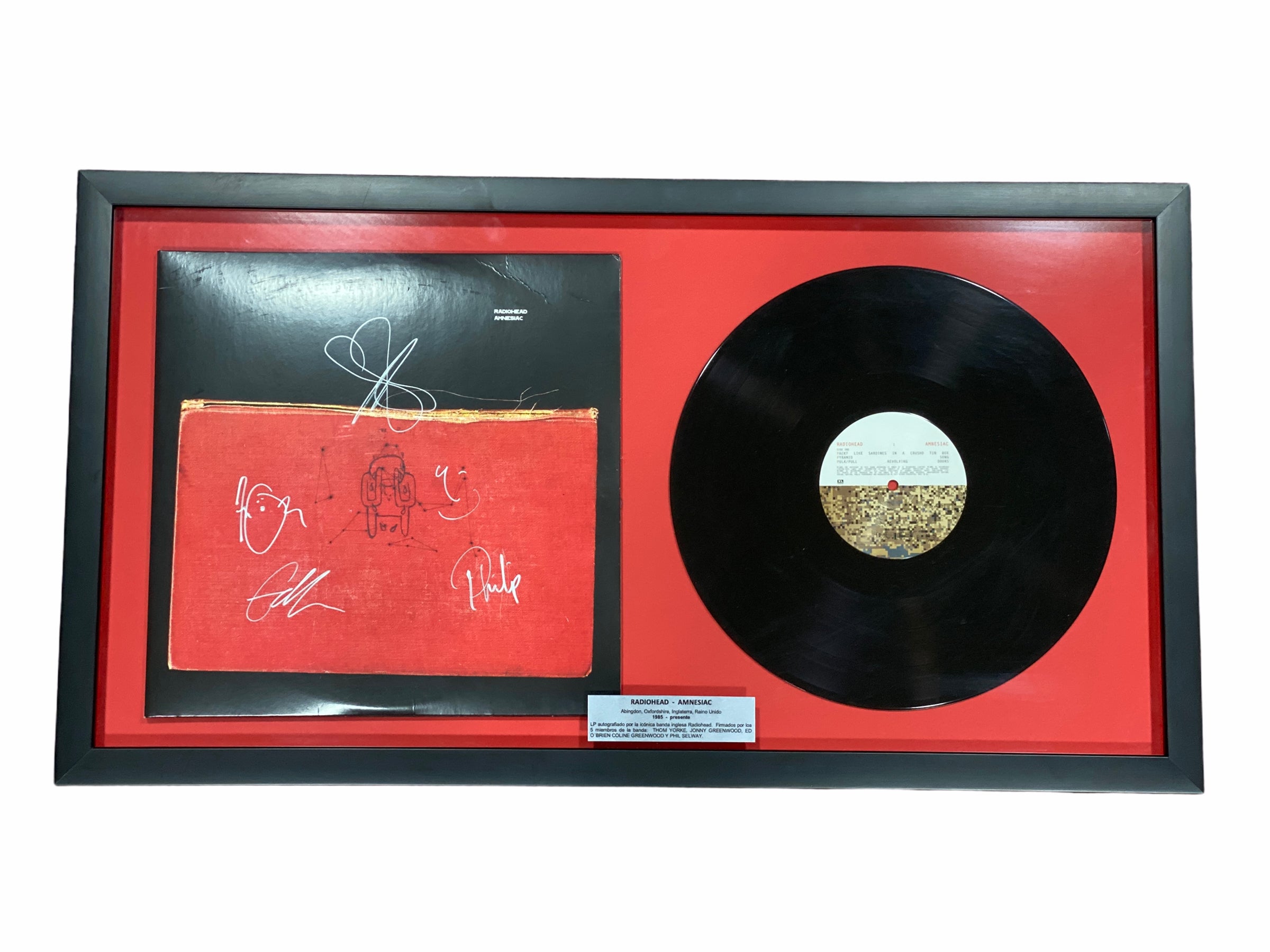 Disco LP enmarcado por los integrantes del grupo Radiohead Thom Yorke , Jonny Greenwood, Ed Orien, Colin Greenwood, Phil Selway