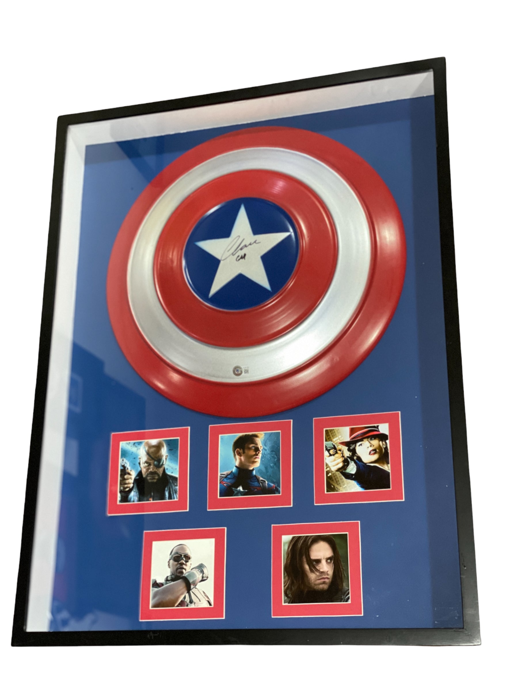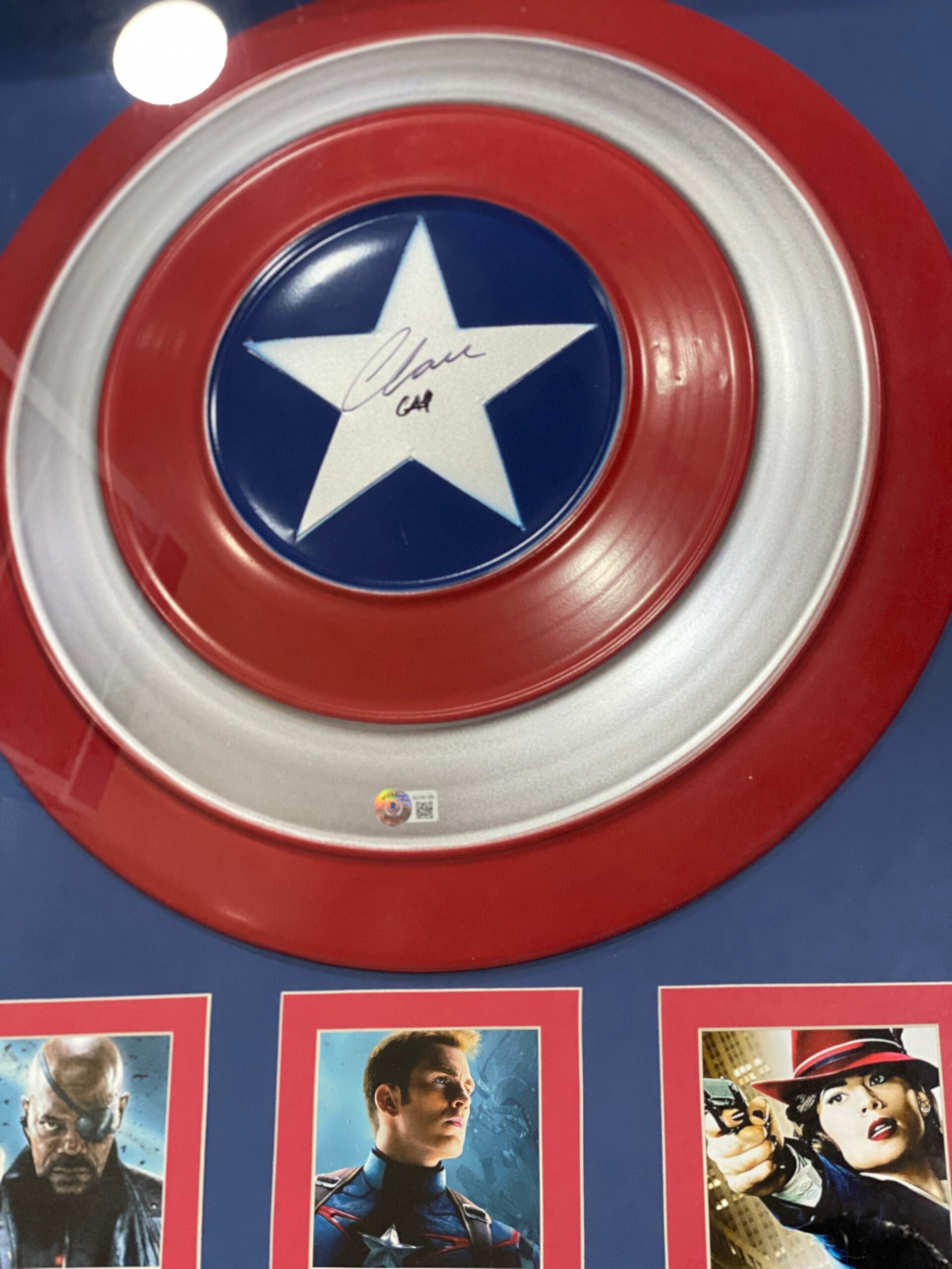 Escudo del capitán américa enmarcado por el actor Chris Evans