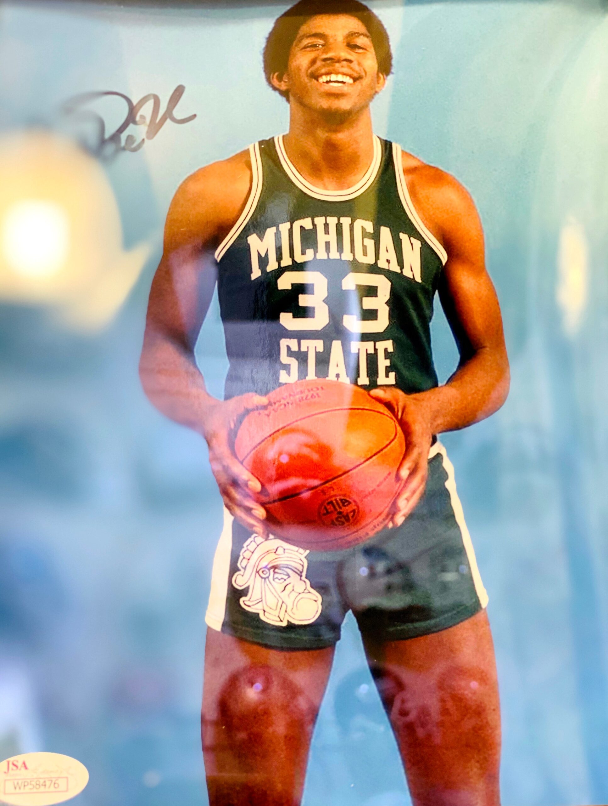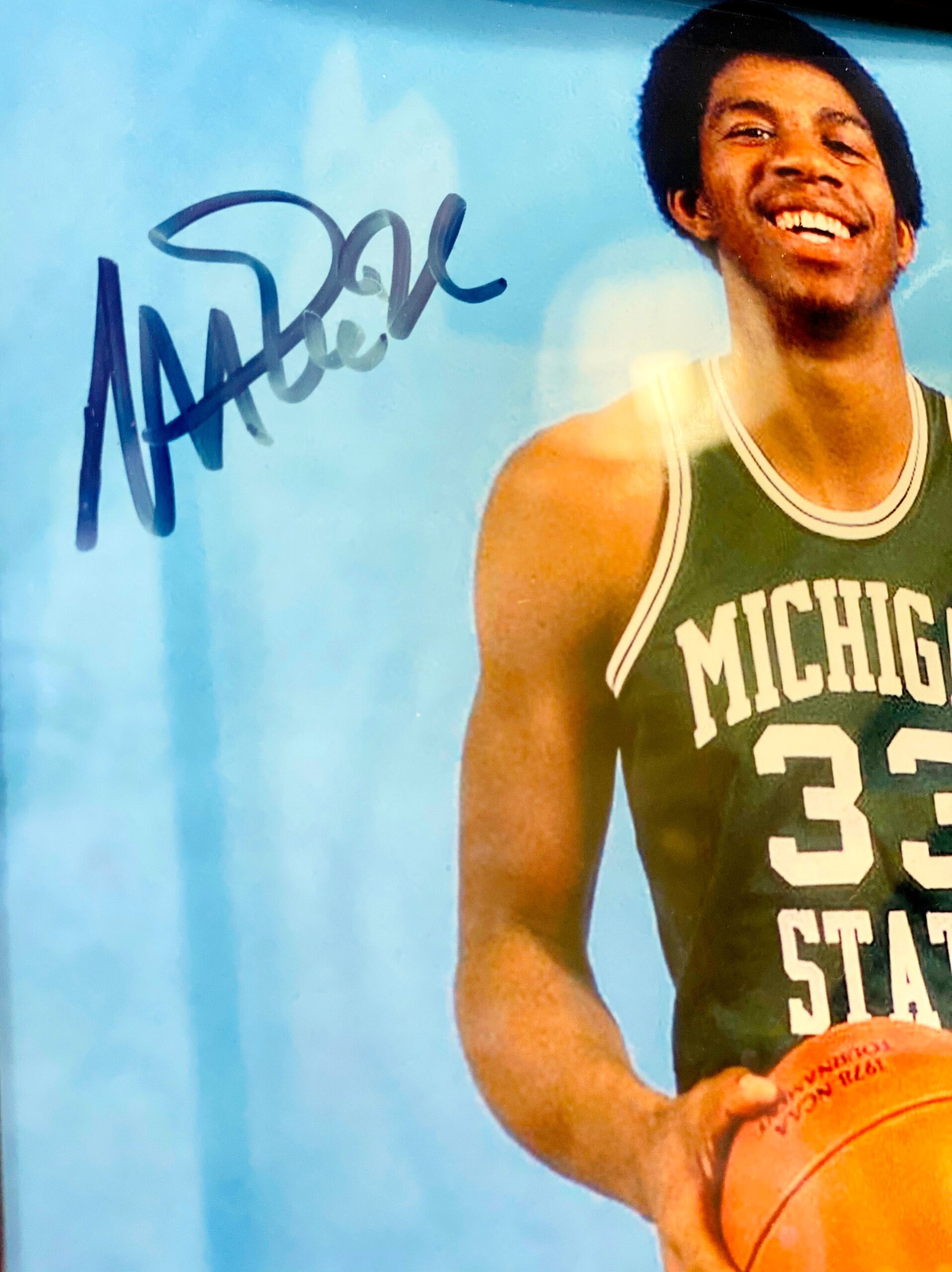 Fotografía de basketball autografiada por Magic Johnson, de Los Ángeles Lakers.  “El Magic”, fue un gran basketbolista en la época de Jordan, Bird, Pippen, Rodman etc.  Gran emblema de Los Lakers, que a la fecha su opinión se toma en cuenta para el equipo angelino y su futuro en la NBA.