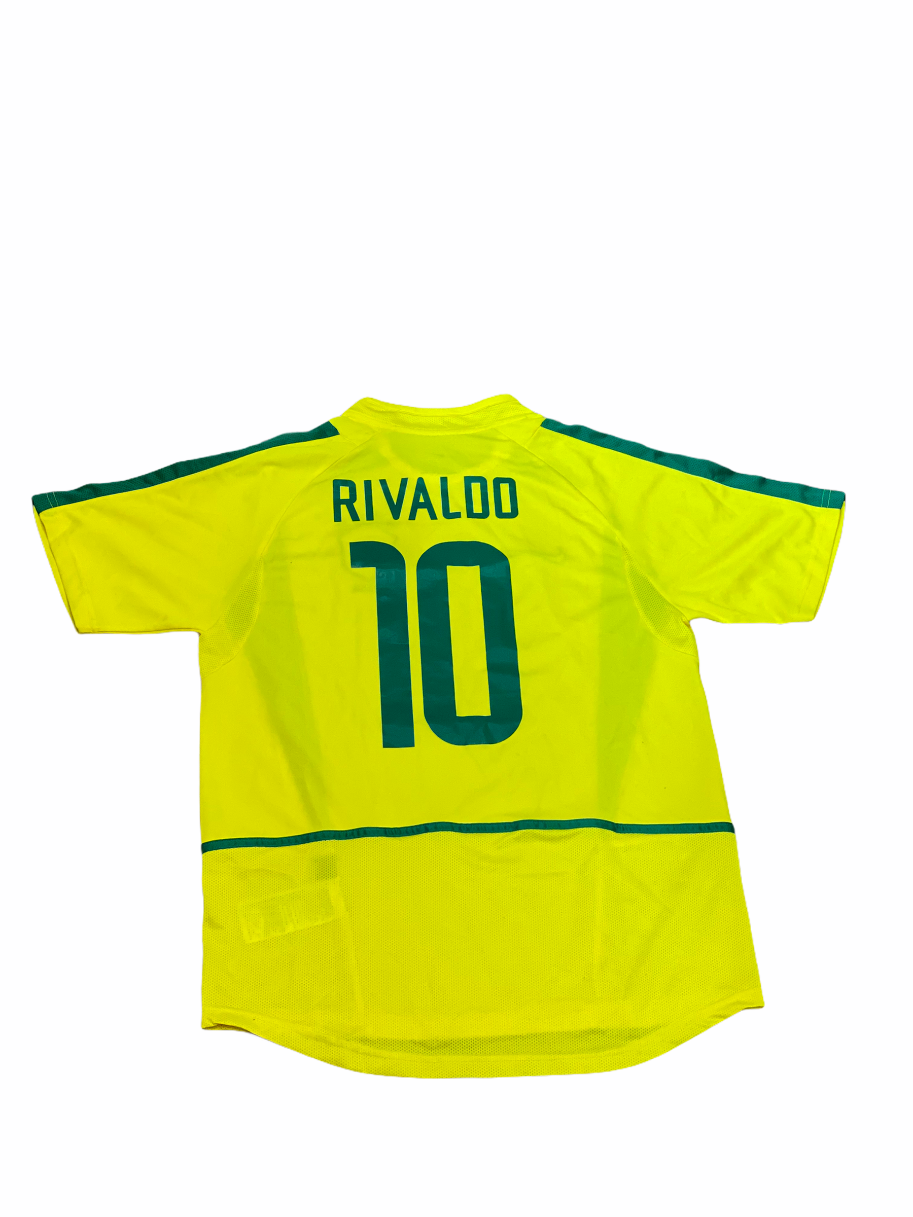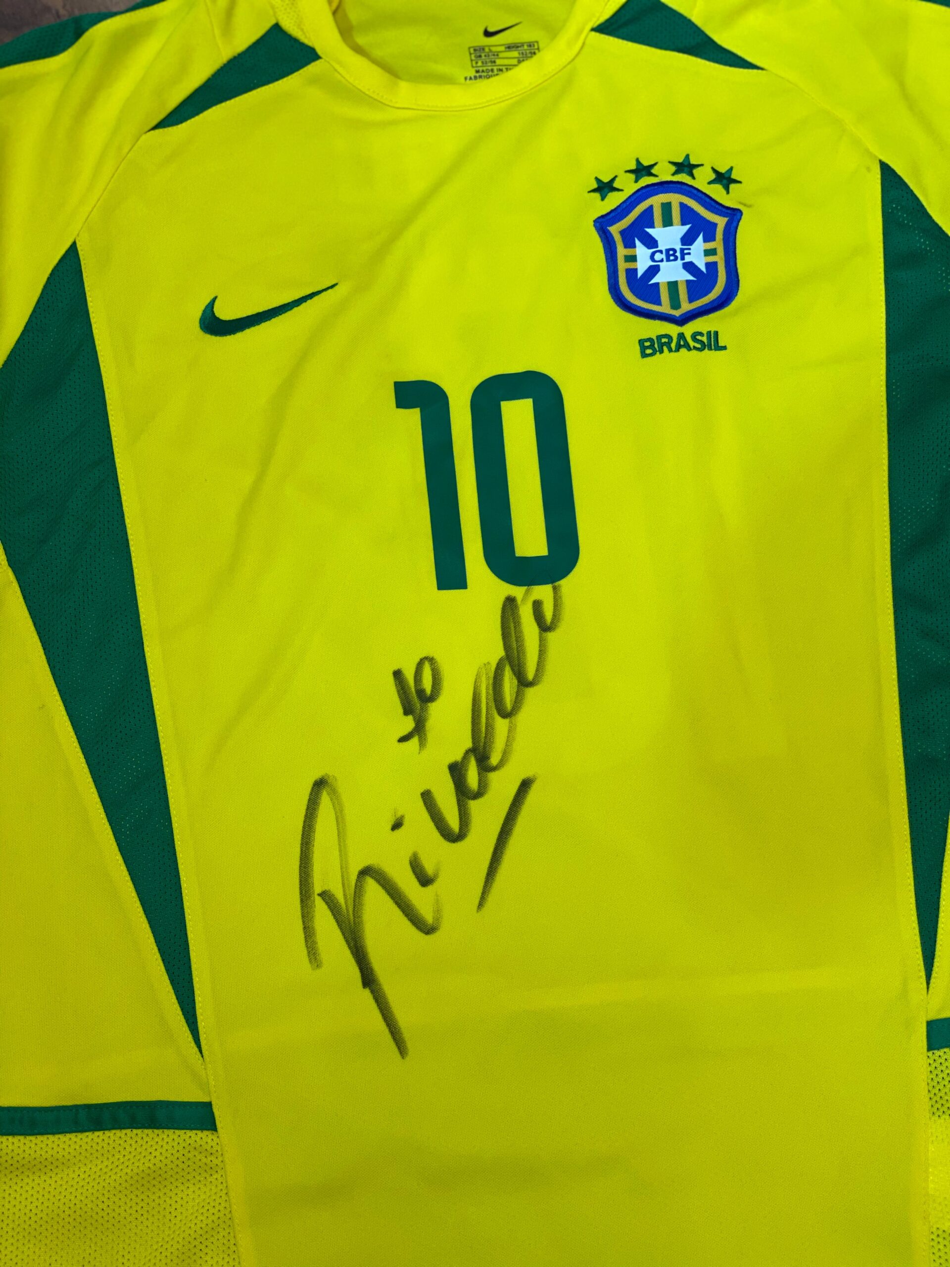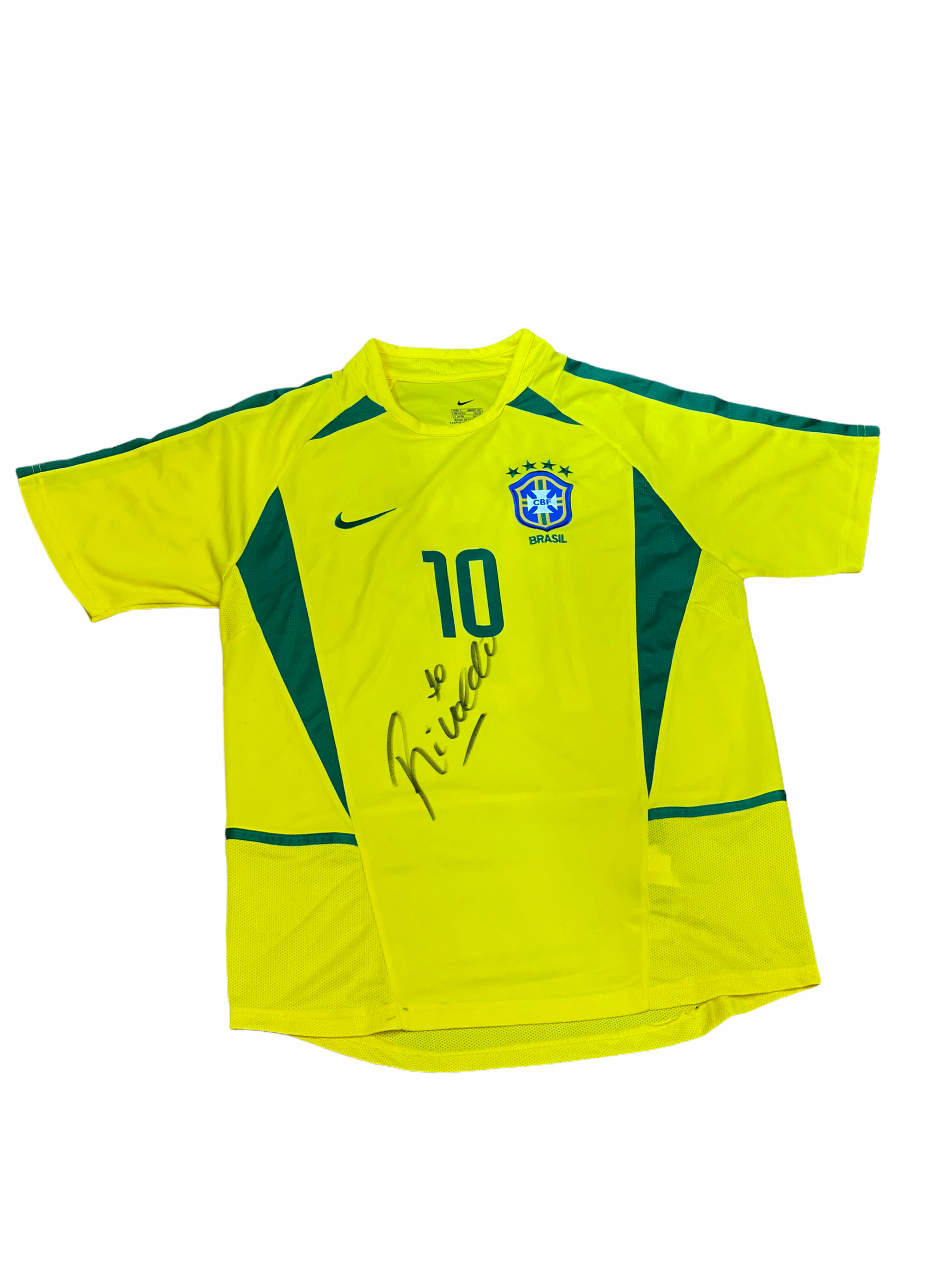 Jersey de Brasil autografiado por Rivaldo. Vítor Borba Ferreira Gomes, más conocido como Rivaldo, es un exfutbolista brasileño. Fue considerado como uno de los mejores futbolistas del mundo de entre finales de los años 1990 y principios de los años 2000. Con la Selección Brasileña ganó la Copa América de 1999 y la Copa Mundial Corea del Sur-Japón 2002.
