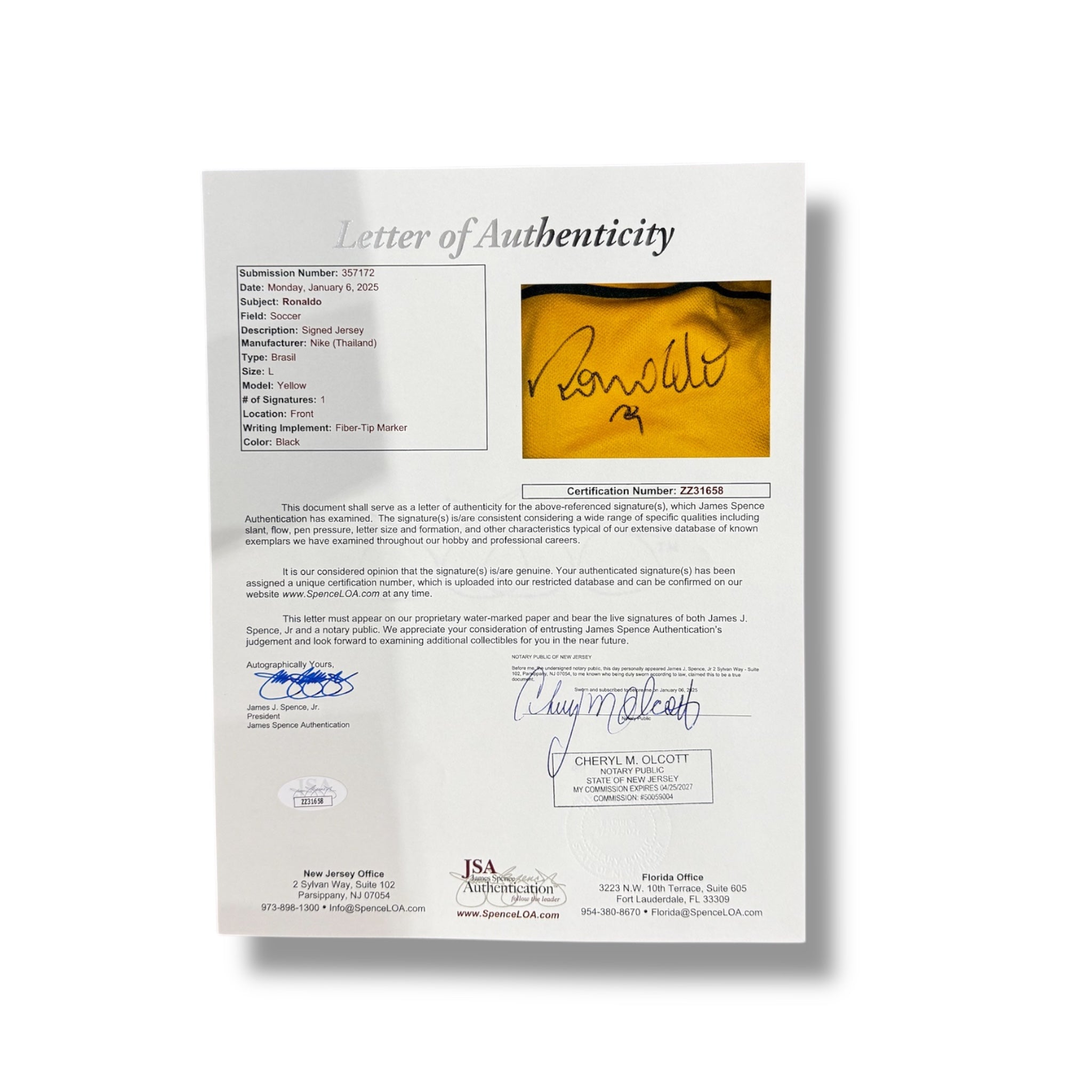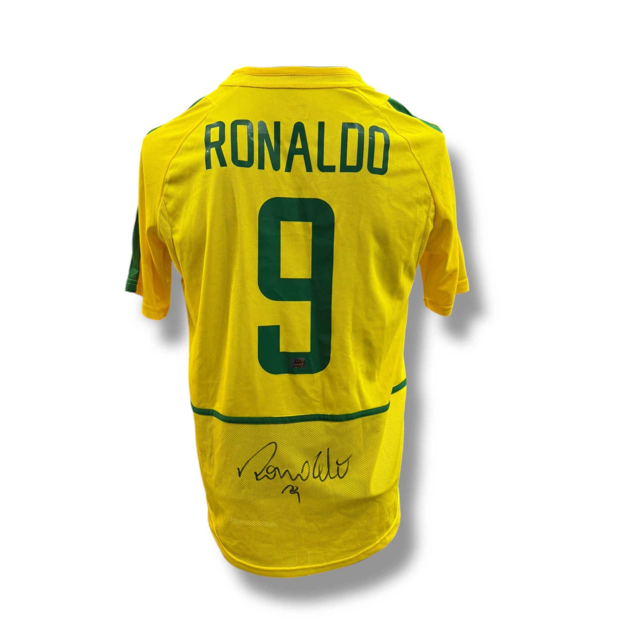 Jersey del Brasil autografiada por Ronaldo Nazario “Fenómeno”. El autografo se hizo en el jersey y no en el numero.