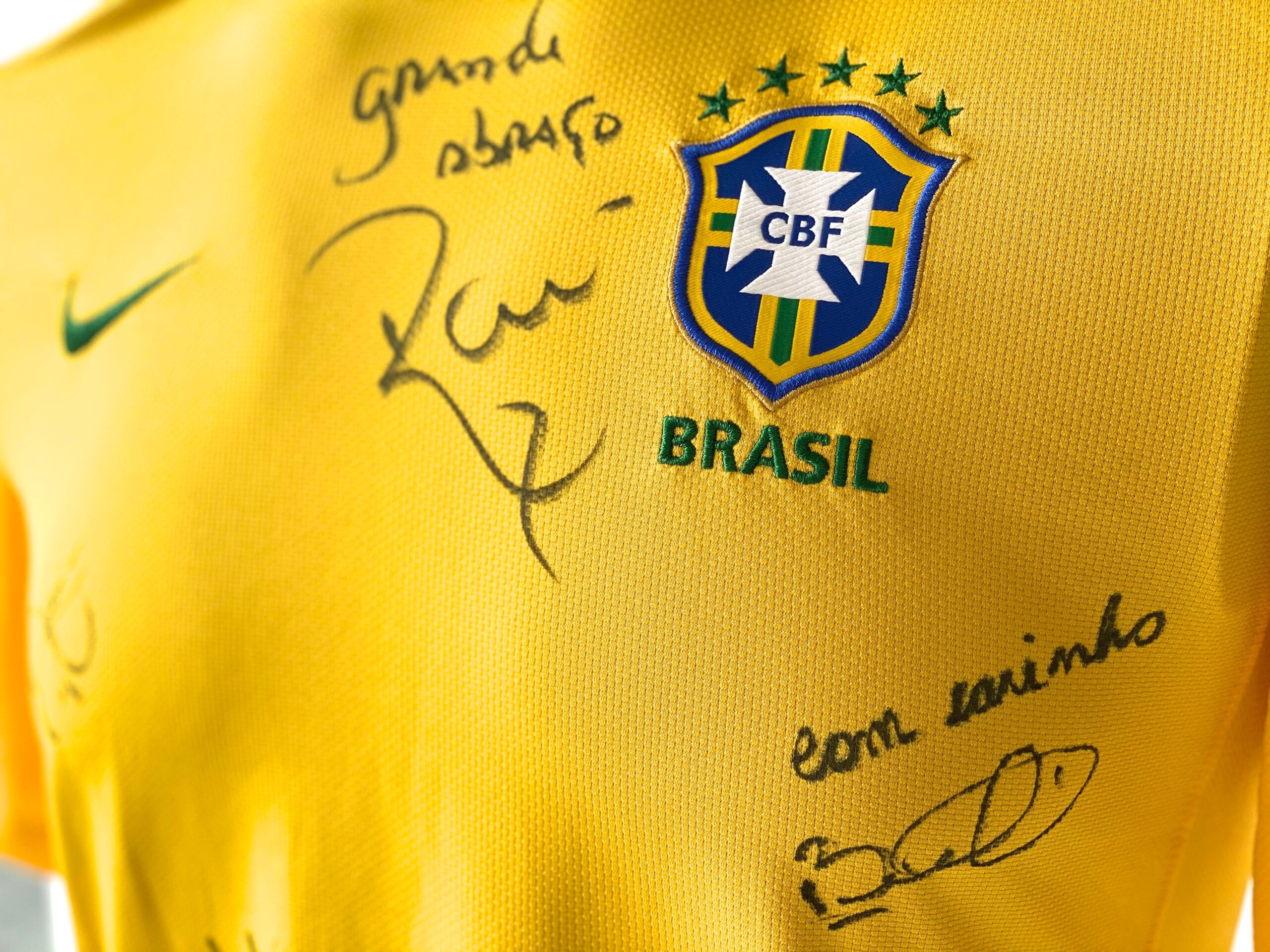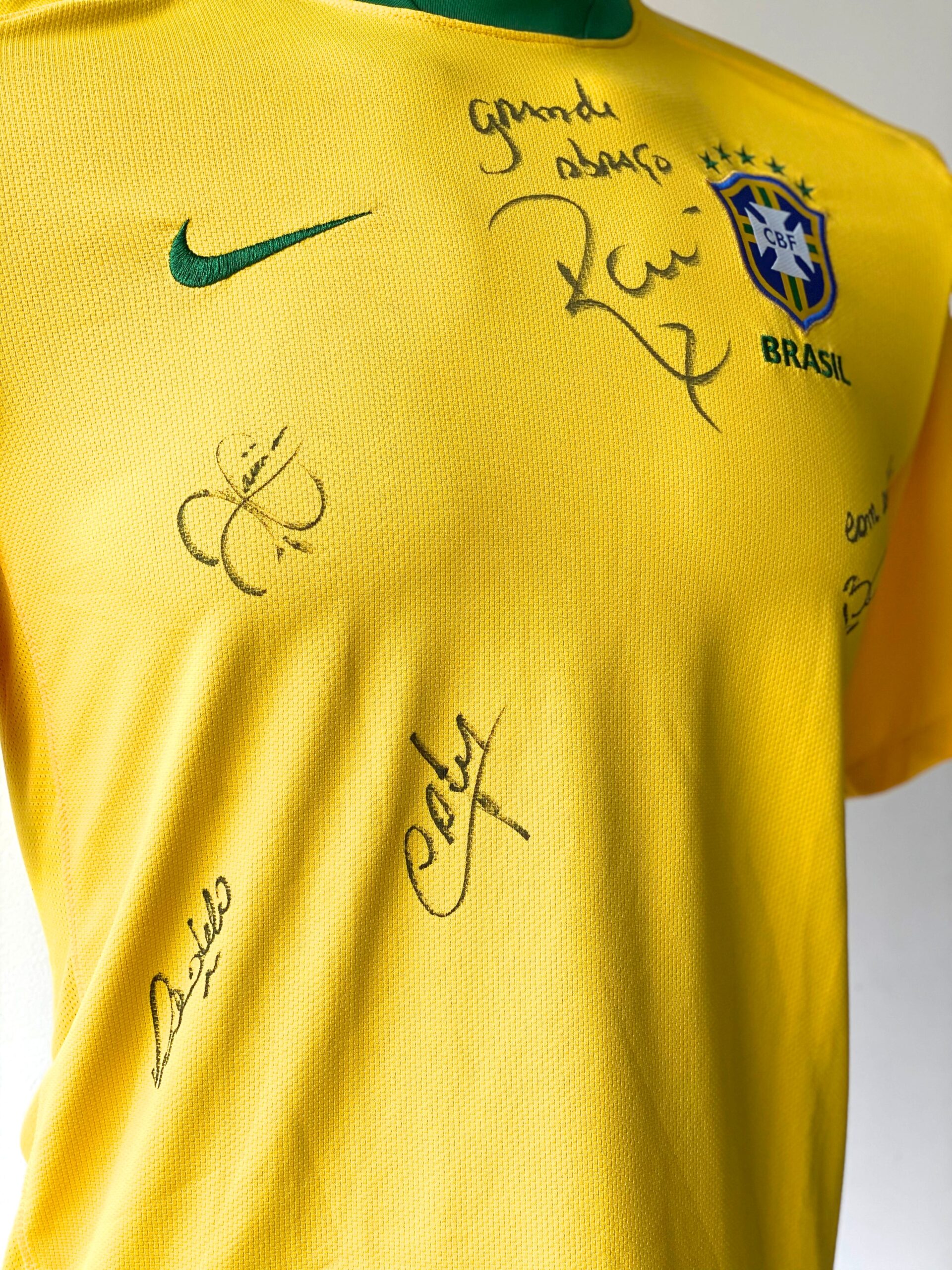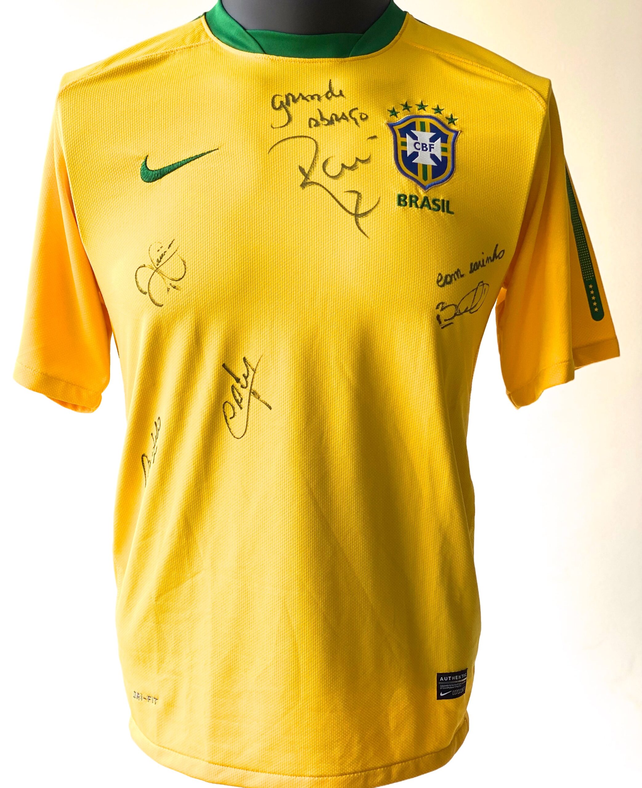 Jersey autografiada por RAI, BEBETO, CAFU, ROMARIO Y RONALDO, del equipo de Brasil 1994. Este equipo fué campeón en aquella justa mundialista en Estados Unidos, superando a Italia en tanda de penales.