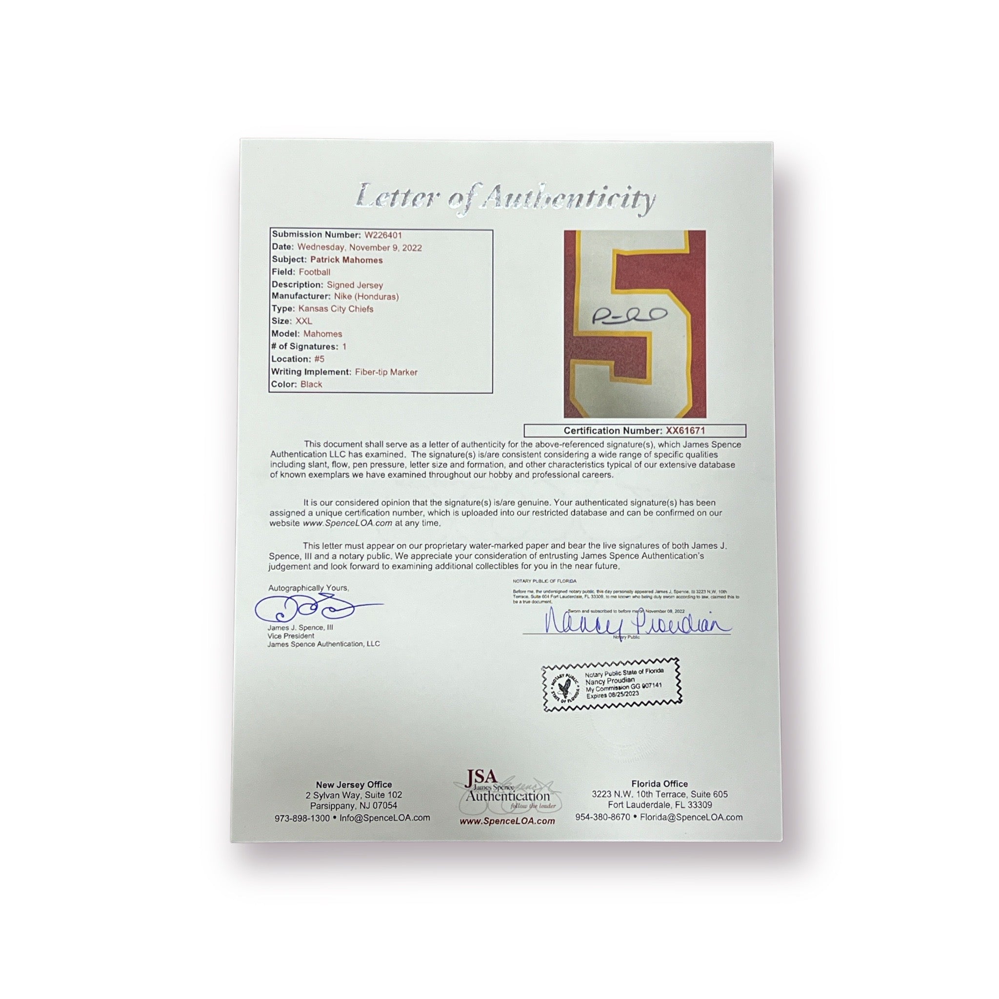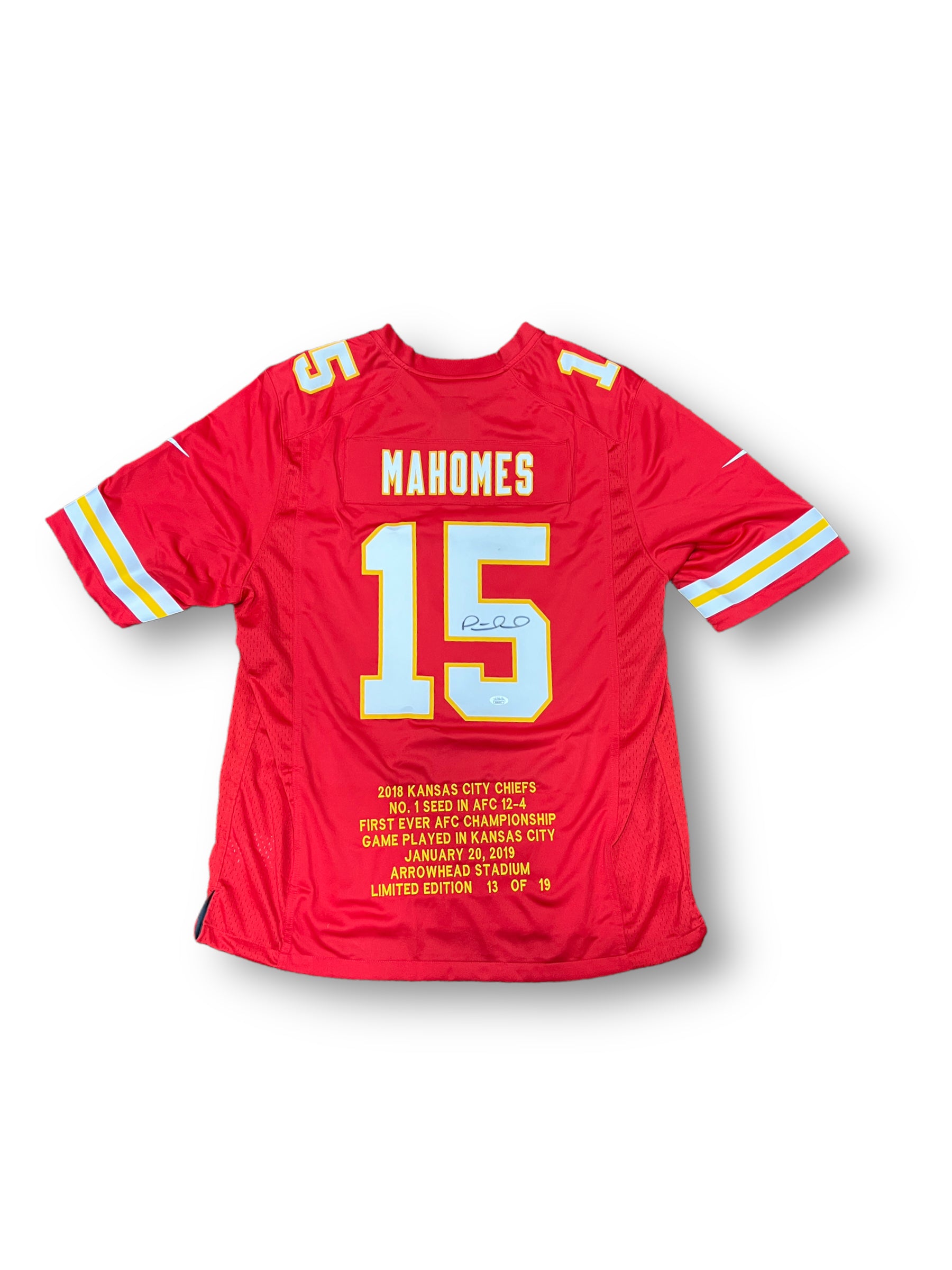 Jersey autografiado por el jugador de los Chiefs Patrick Mahomes edición limitada a 19 piezas en el mundo.