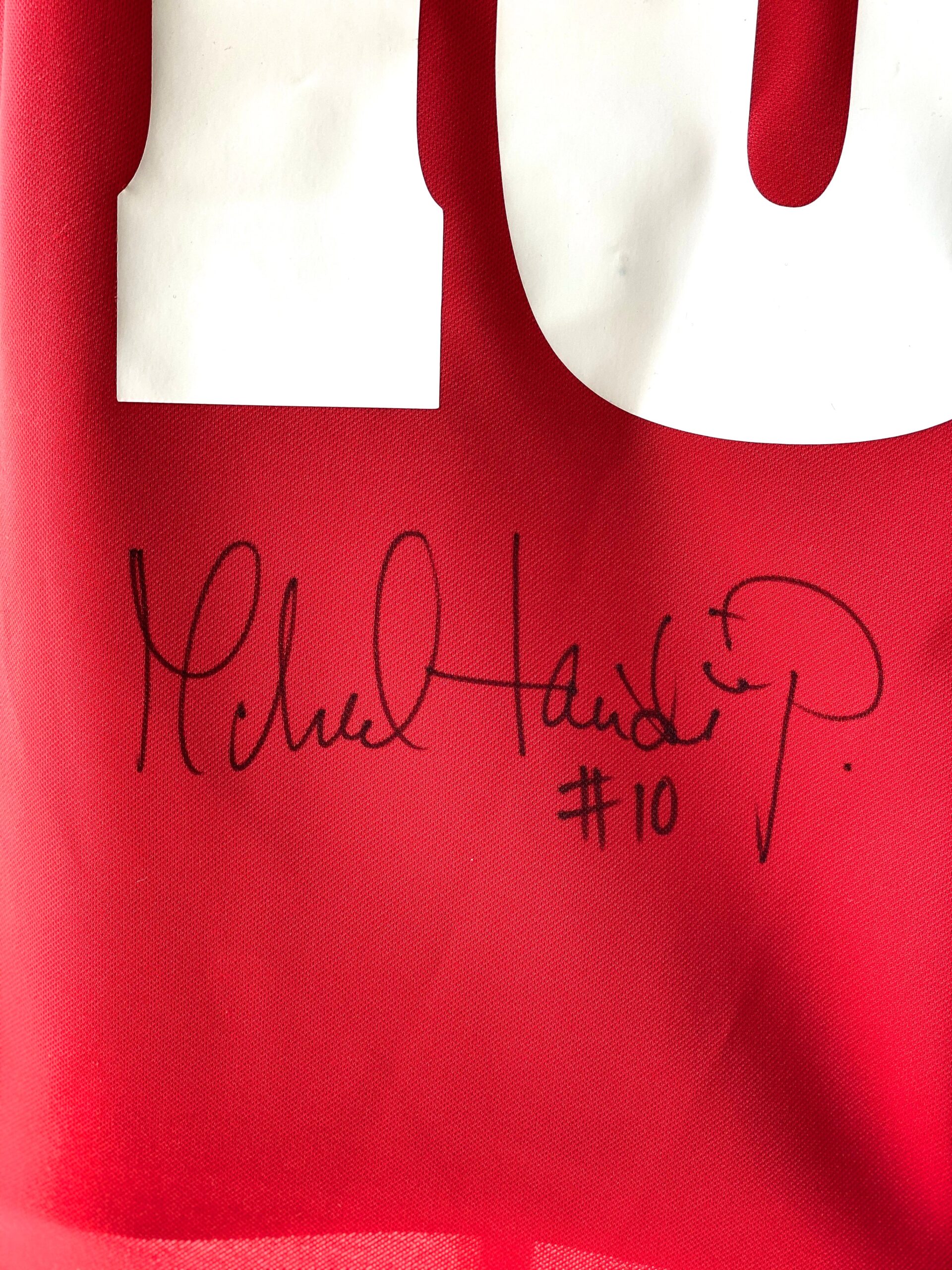 Jersey autografiada por Michael Laudrup, de la Selección de Dinamarca. Michael Laudrup es un exfutbolista y entrenador danés. Es considerado uno de los mejores futbolistas europeos entre mediados de las décadas de los ochenta y noventa. Ocupaba la demarcación de centrocampista, principalmente mediapunta, aunque su versatilidad le permitía desenvolverse como delantero o extremo.