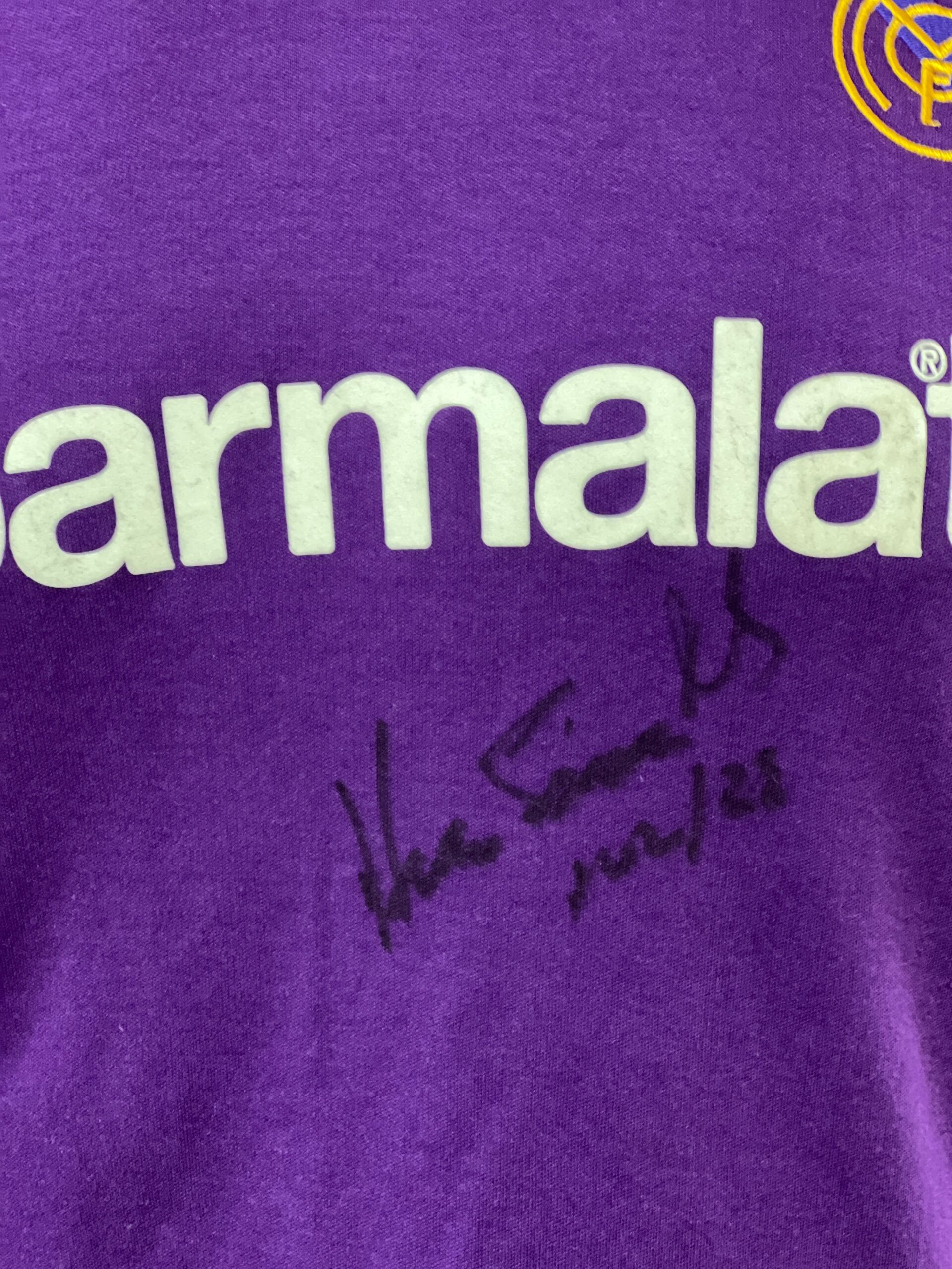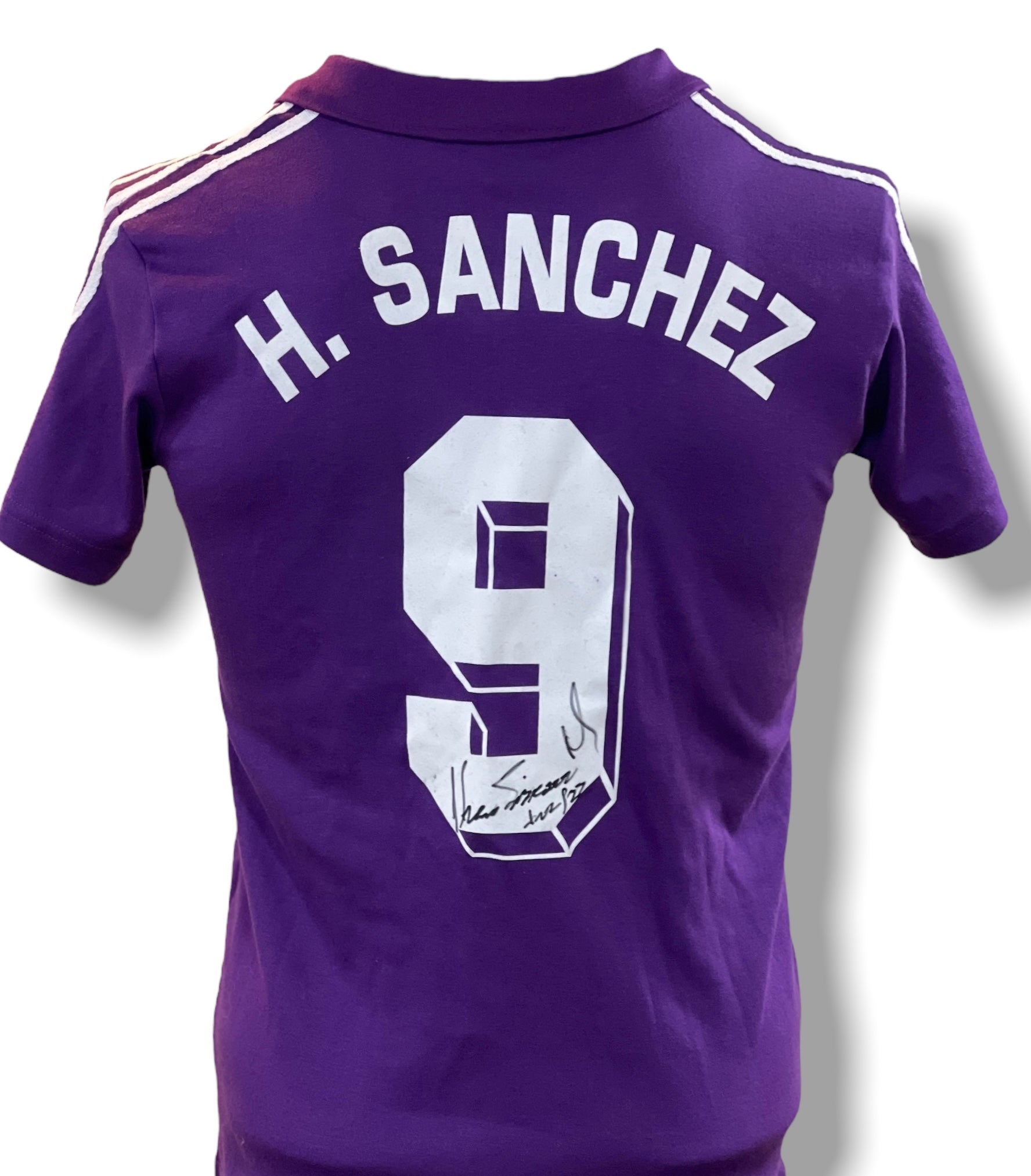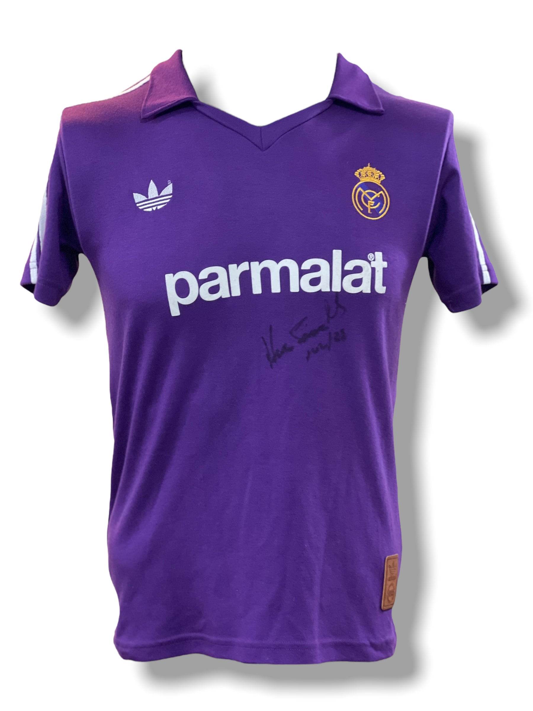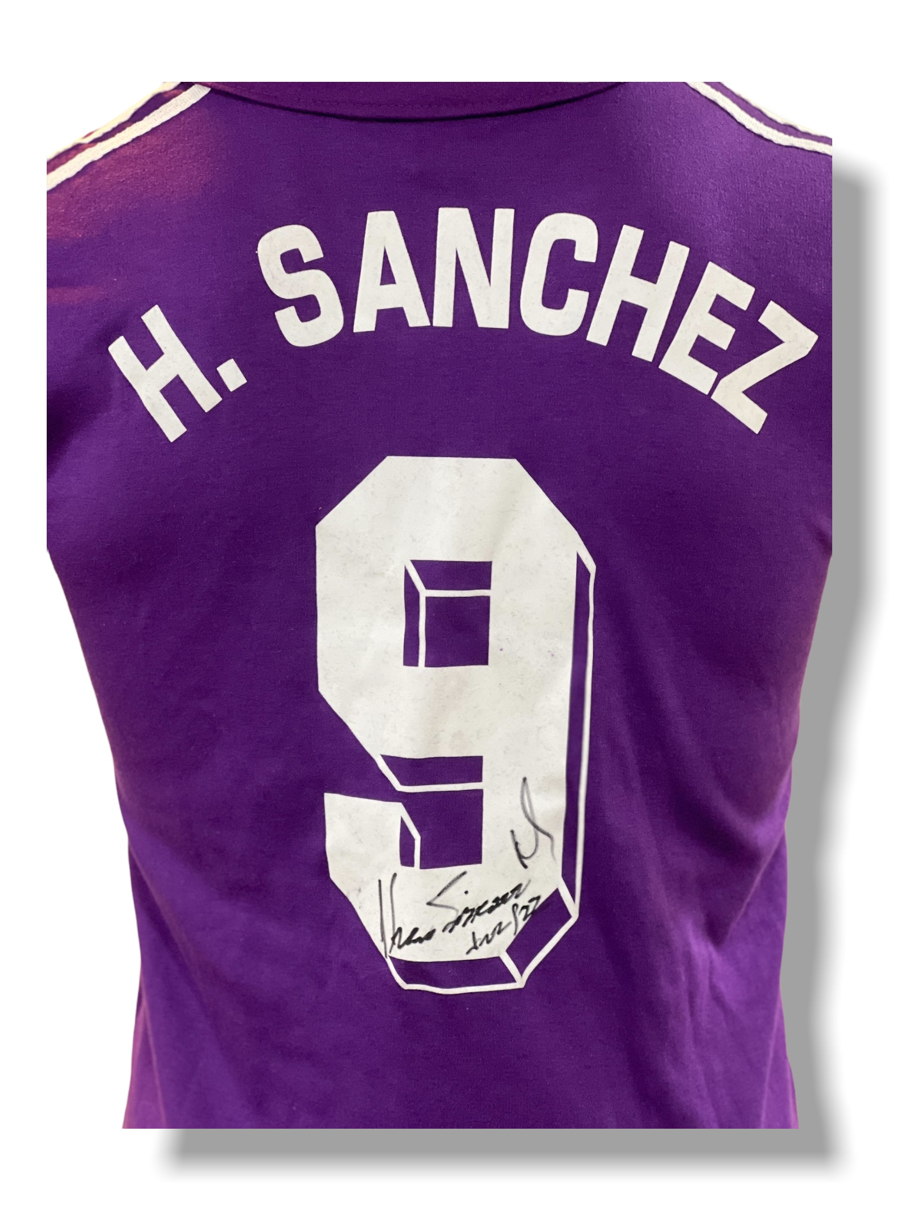 Jersey autografiado por el jugador del Real Madrid Hugo Sánchez (Morada Retro Doble Firma )