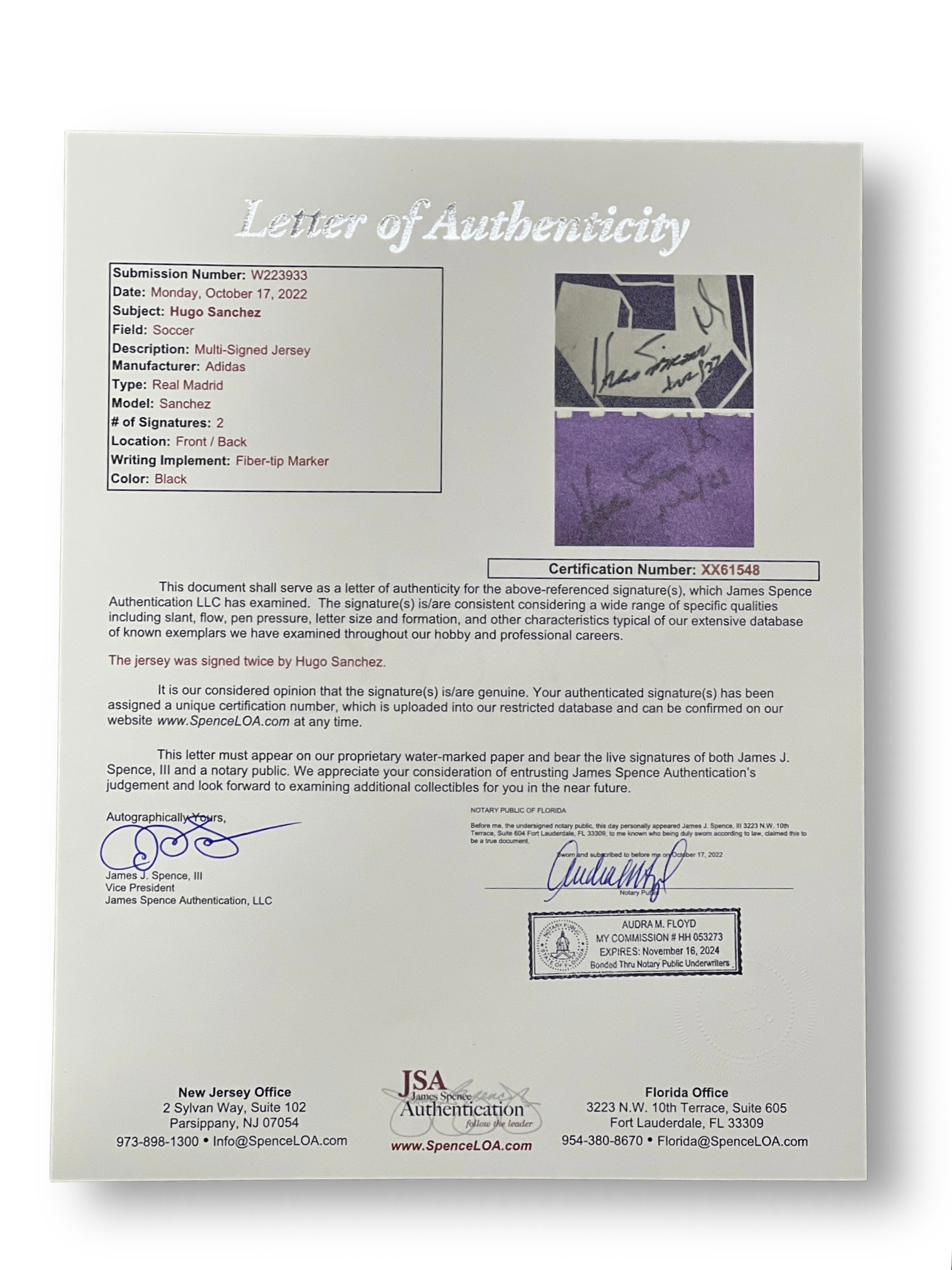 CERTIFICADO DE AUTENTICIDAD JSA (CARTA NOTARIADA)