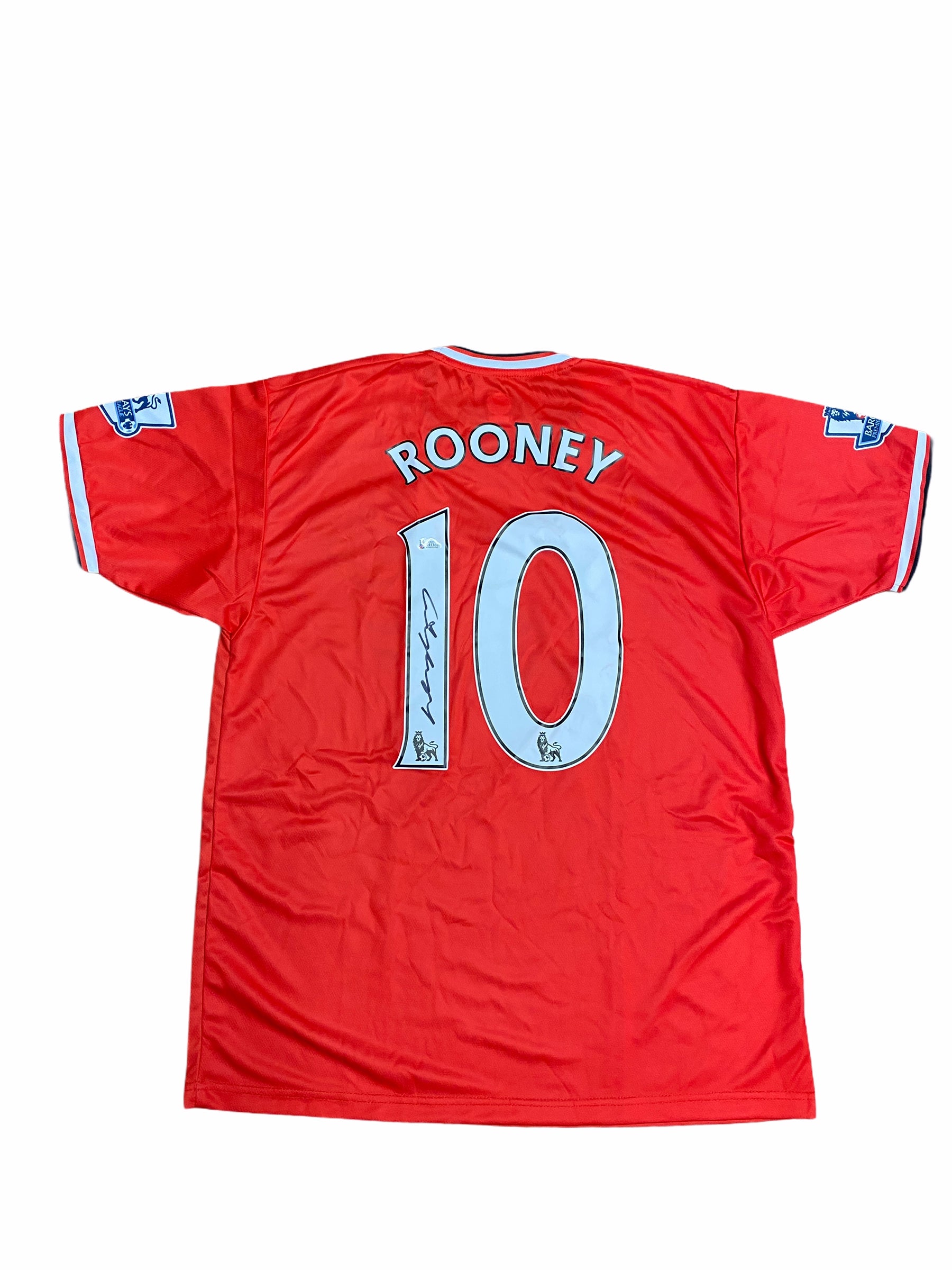 Jersey autografiado por Wayne Rooney, del Manchester United. Rooney inició su carrera deportiva en el Everton, después de unirse a sus categorías inferiores a la edad de 10 años. Debutó profesionalmente en 2002 después de su ascenso al primer equipo.