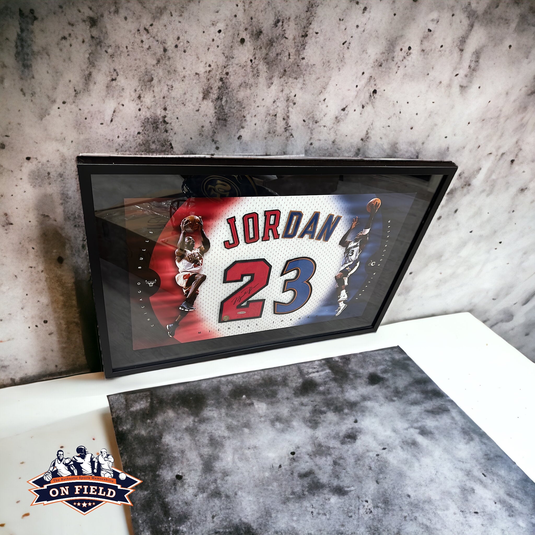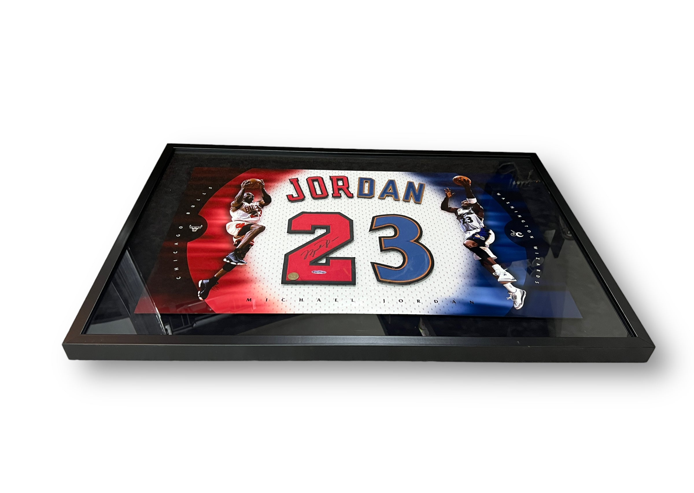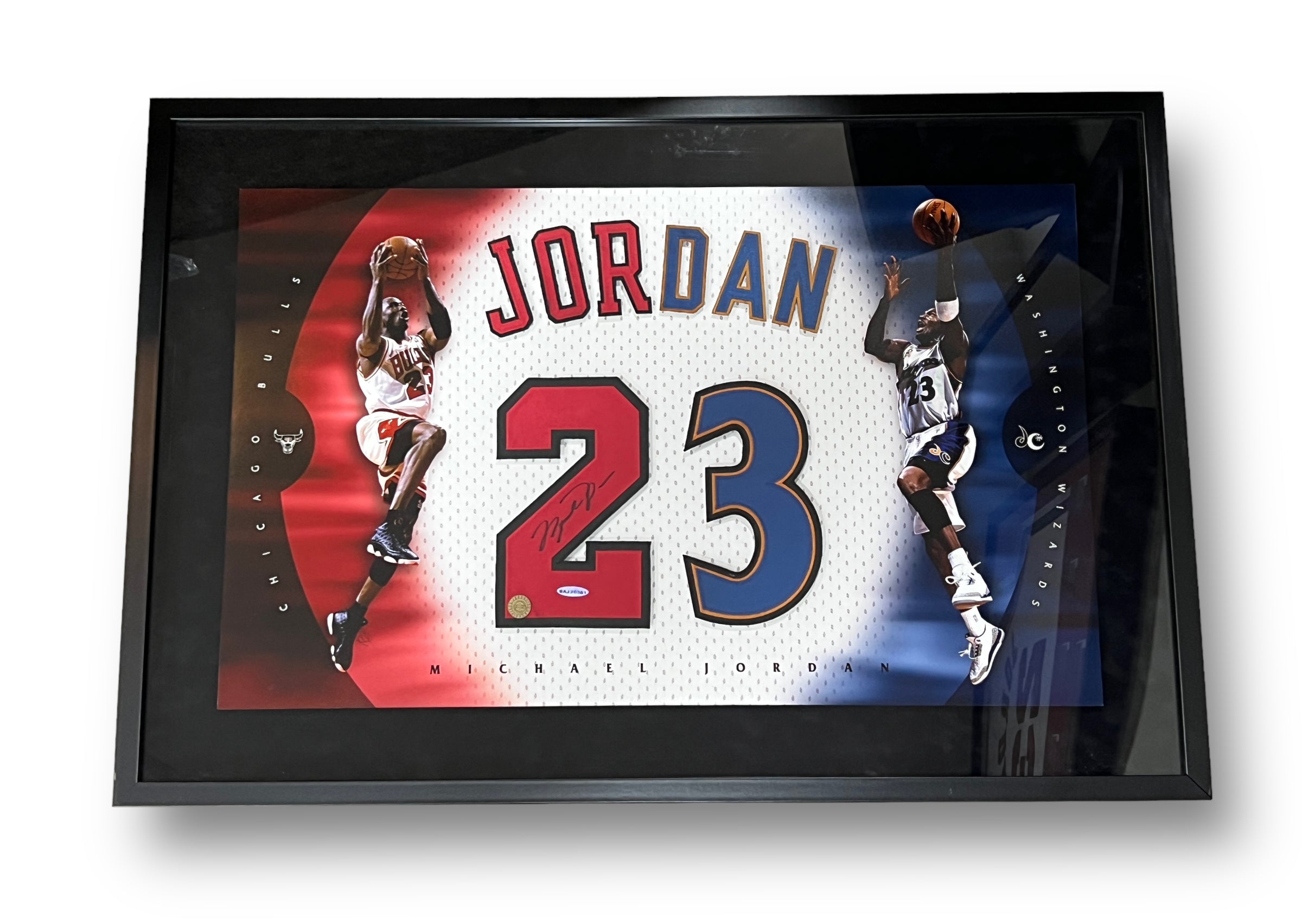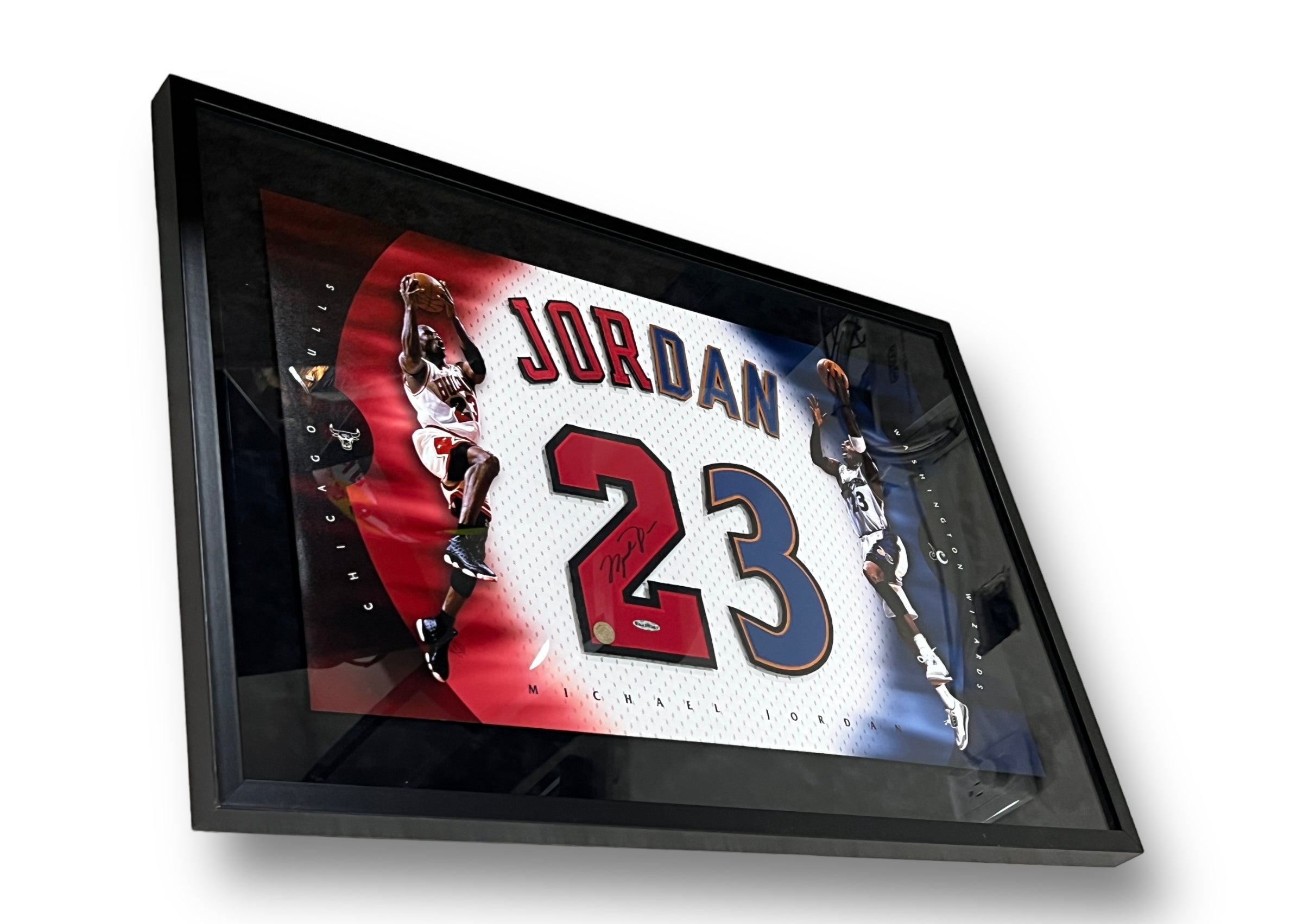 Jersey number autografiado por el jugador de los Bulls Michael Jordan. Esta pieza es muy especial en el mundo del coleccionismo, ya que salieron muy pocas piezas en el mundo en los años 90. El numero es el autentico de Jordan cuando representó a Chicago Bulls y a los Wizards.