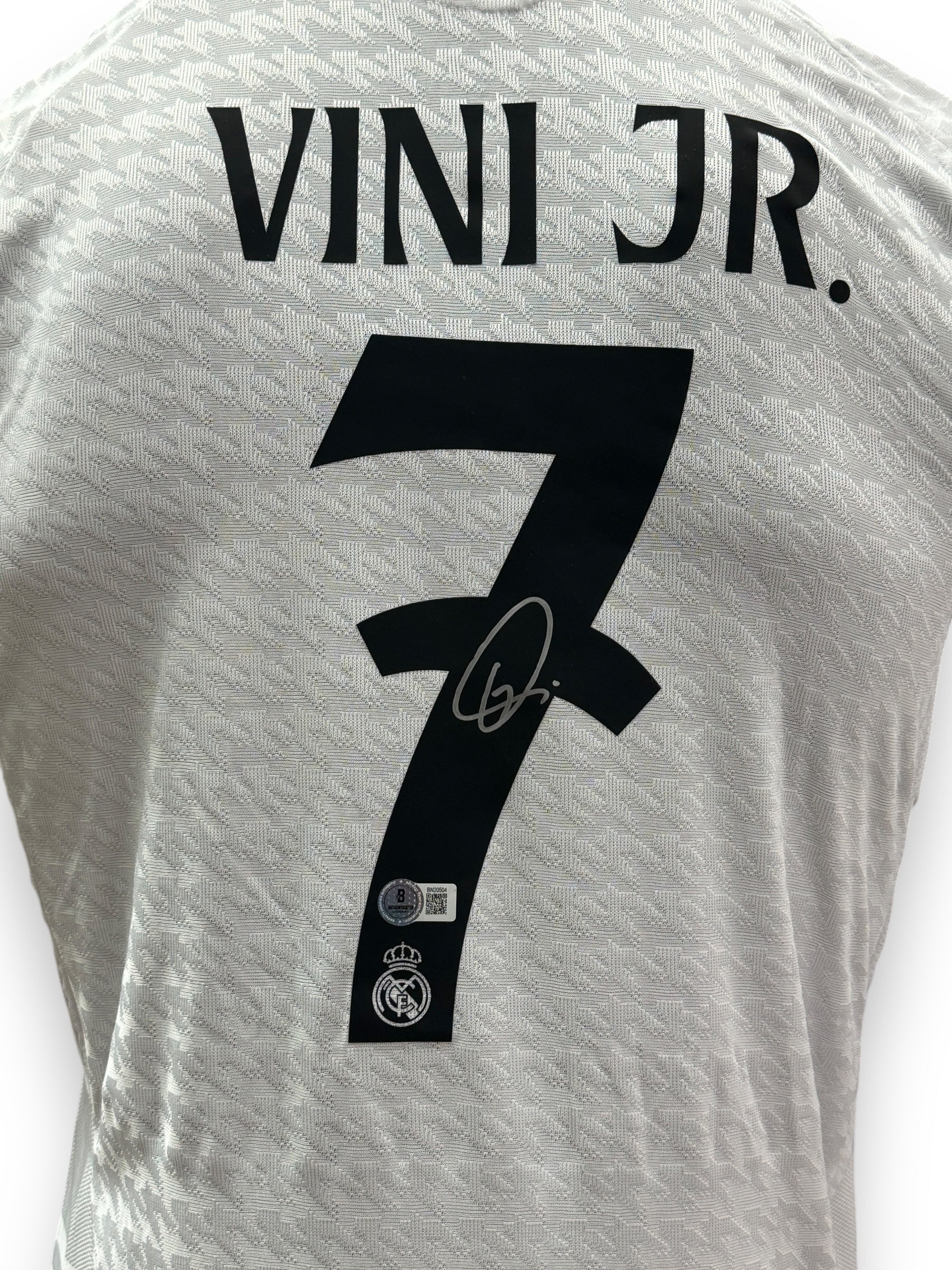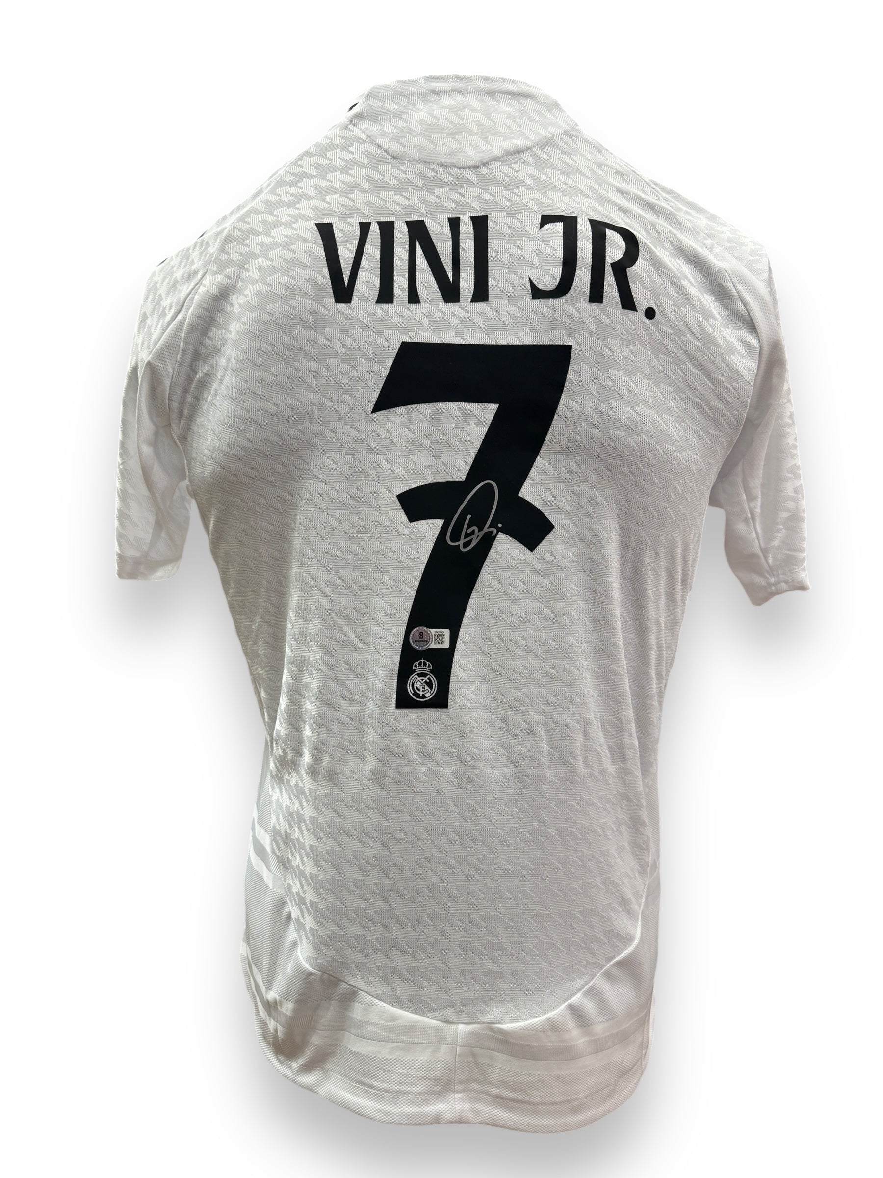 Jersey autografiado por Vinicius Jr., estrella del Real Madrid.