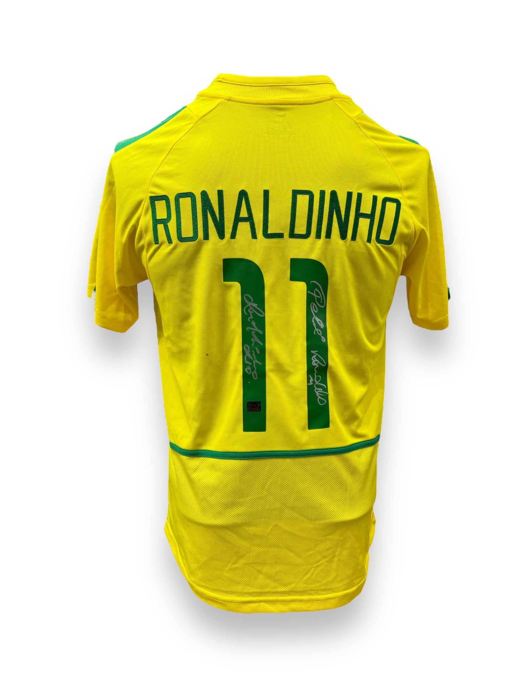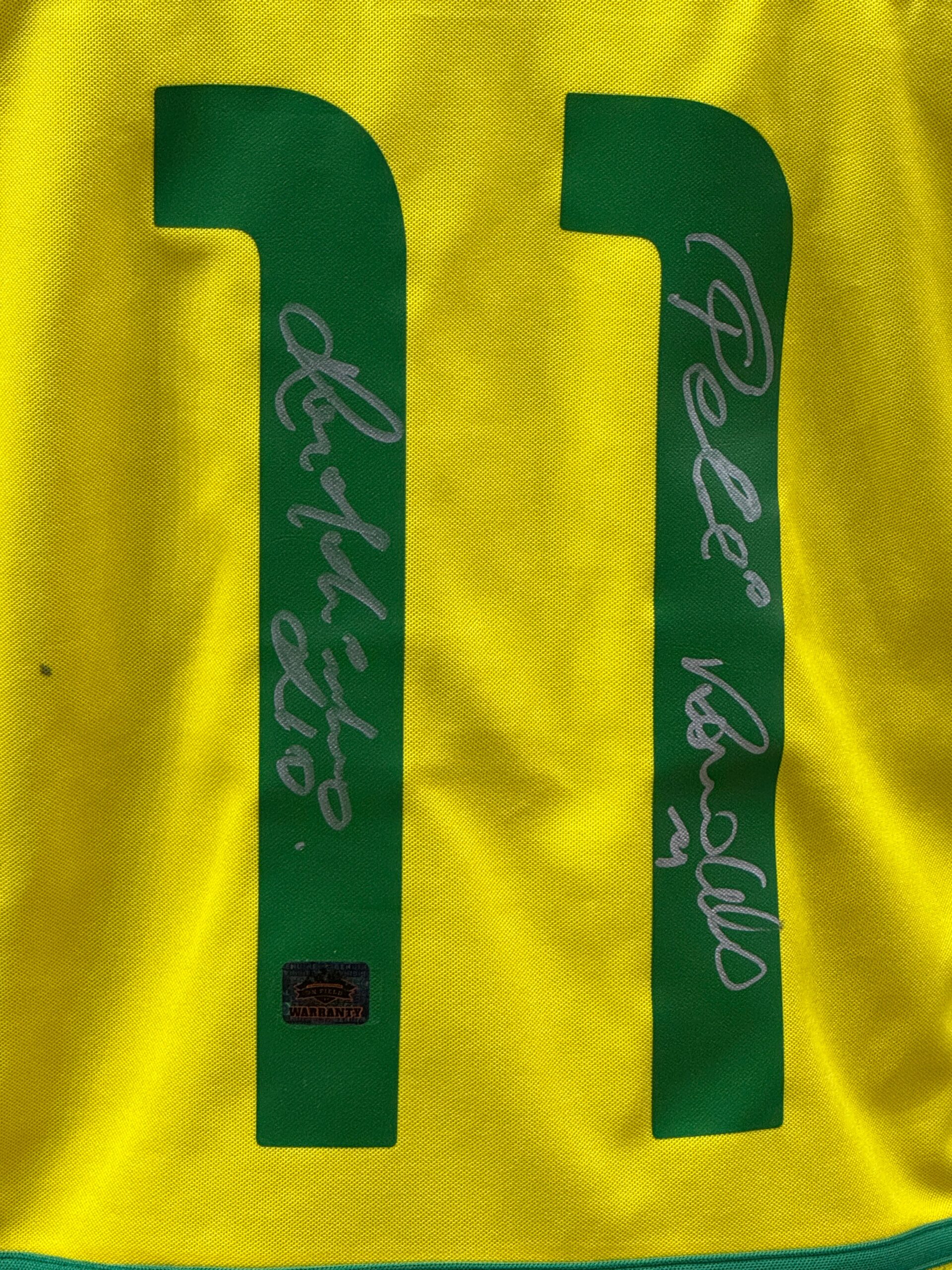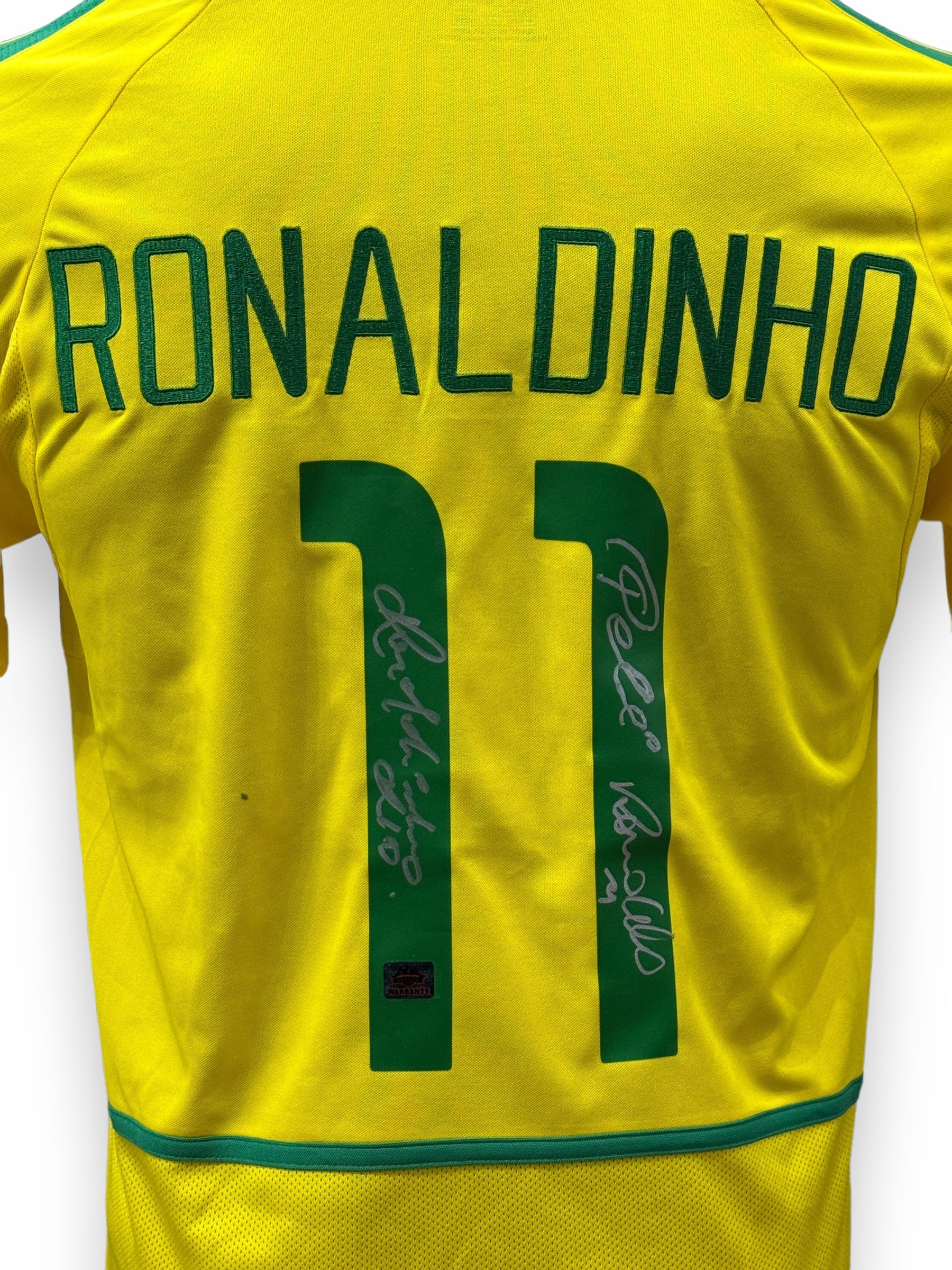 Jersey autografiada por Ronaldinho, Pele y Ronaldo Nazario de la selección de Brasil. Muchos dicen que fue el mejor de todos los tiempos, otros dicen que el más técnico, lo que si es seguro es que dió el Fútbol más alegre de la historia. Su magia fue una cosa impresionante y siempre será recordado por cualquier aficionado a este deporte.