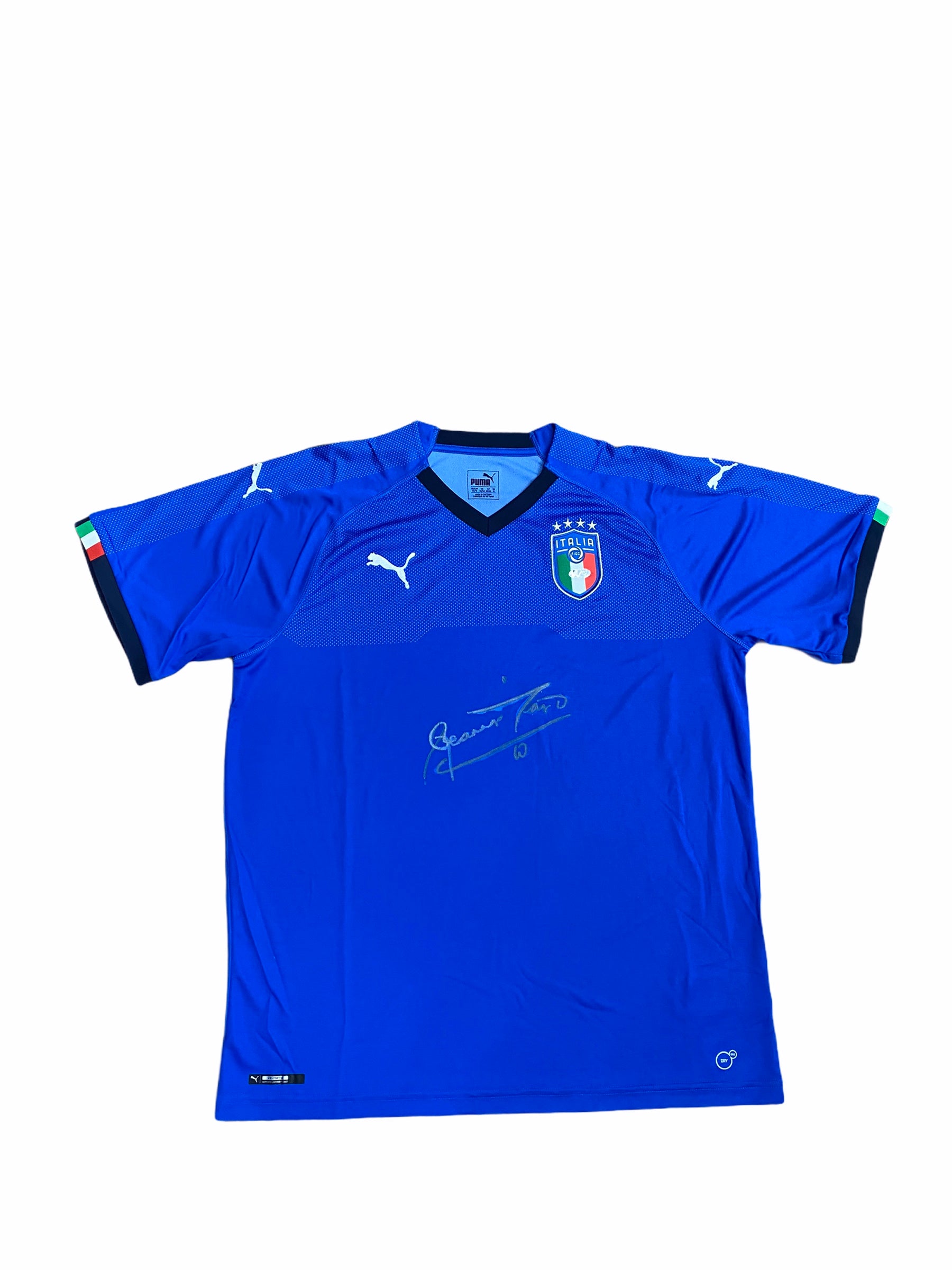 Jersey de la Roma autografiado por Francesco Totti. Francesco Totti, es un exfutbolista italiano que jugaba de centrocampista ofensivo o delantero y actual representante de jugadores, se le destaca por haber jugado toda su carrera en la Associazione Sportiva Roma y también por ser su máximo goleador con 307 goles.