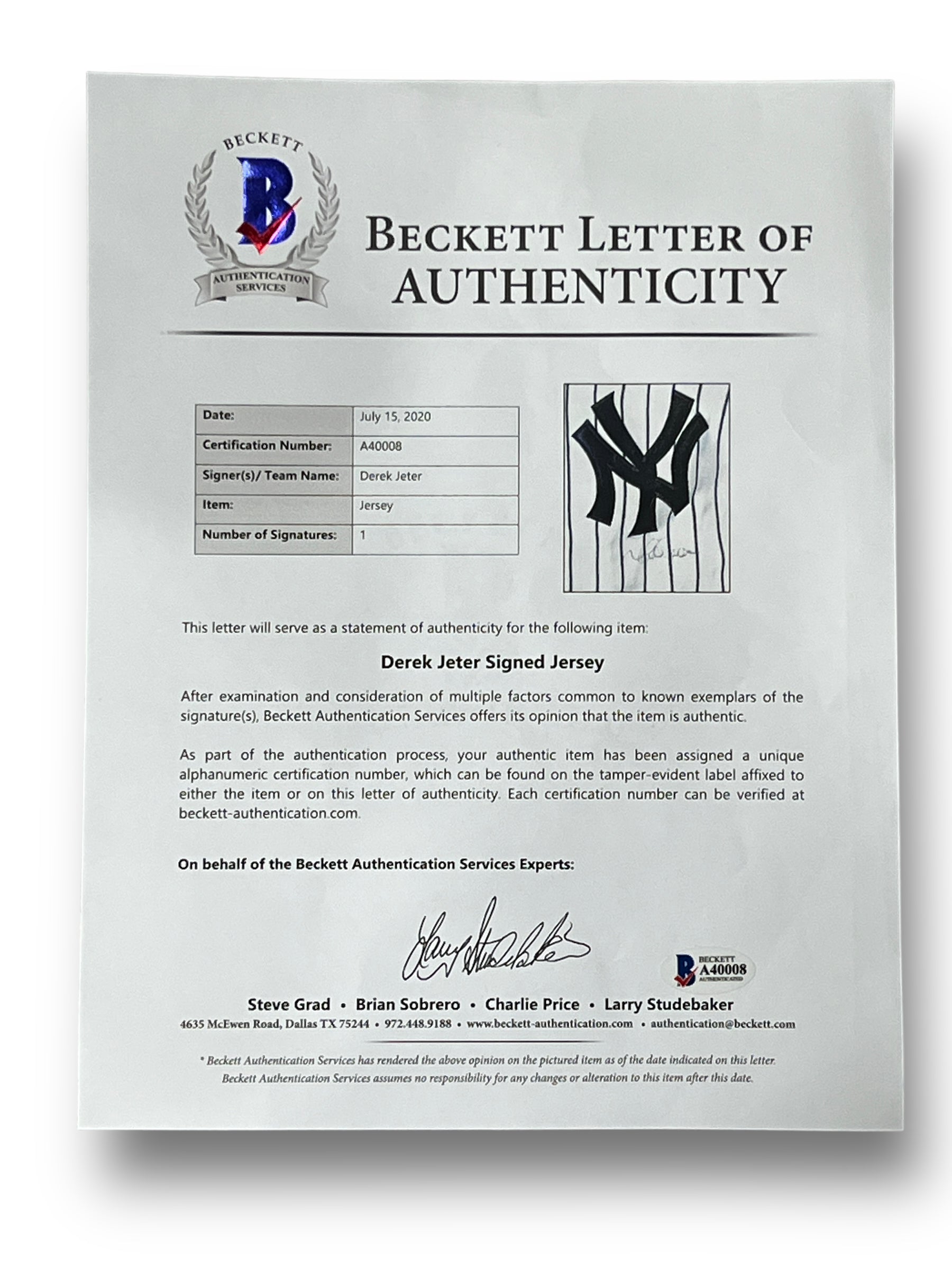 Jersey en color blanco autografiado por el jugador de los Yankees DEREK JETER certificado por la empresa STEINER.