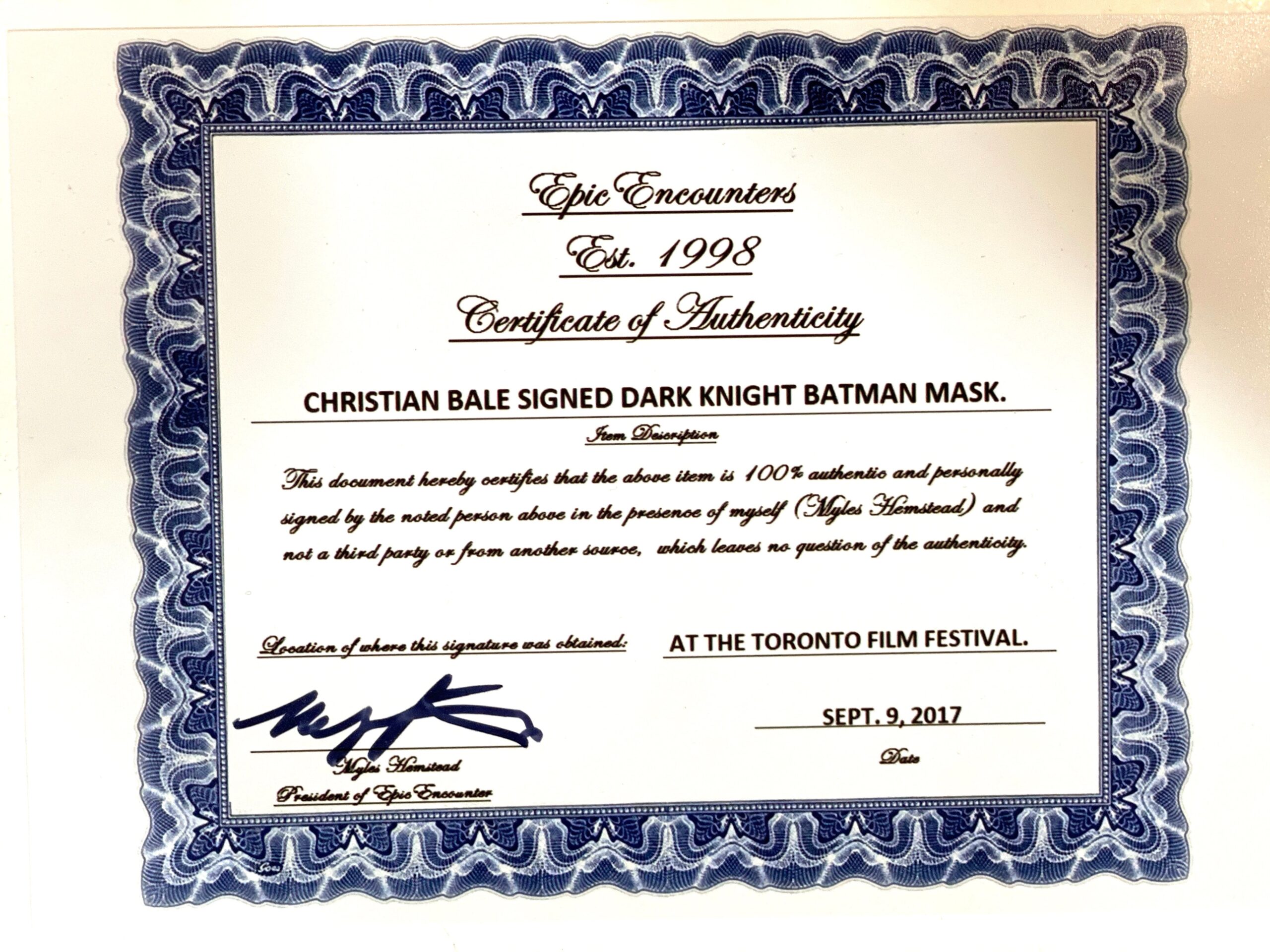 Mascara firmada por el actor de cine Christian Bale quien dio vida a Batman en la pelicula The Dark Knight