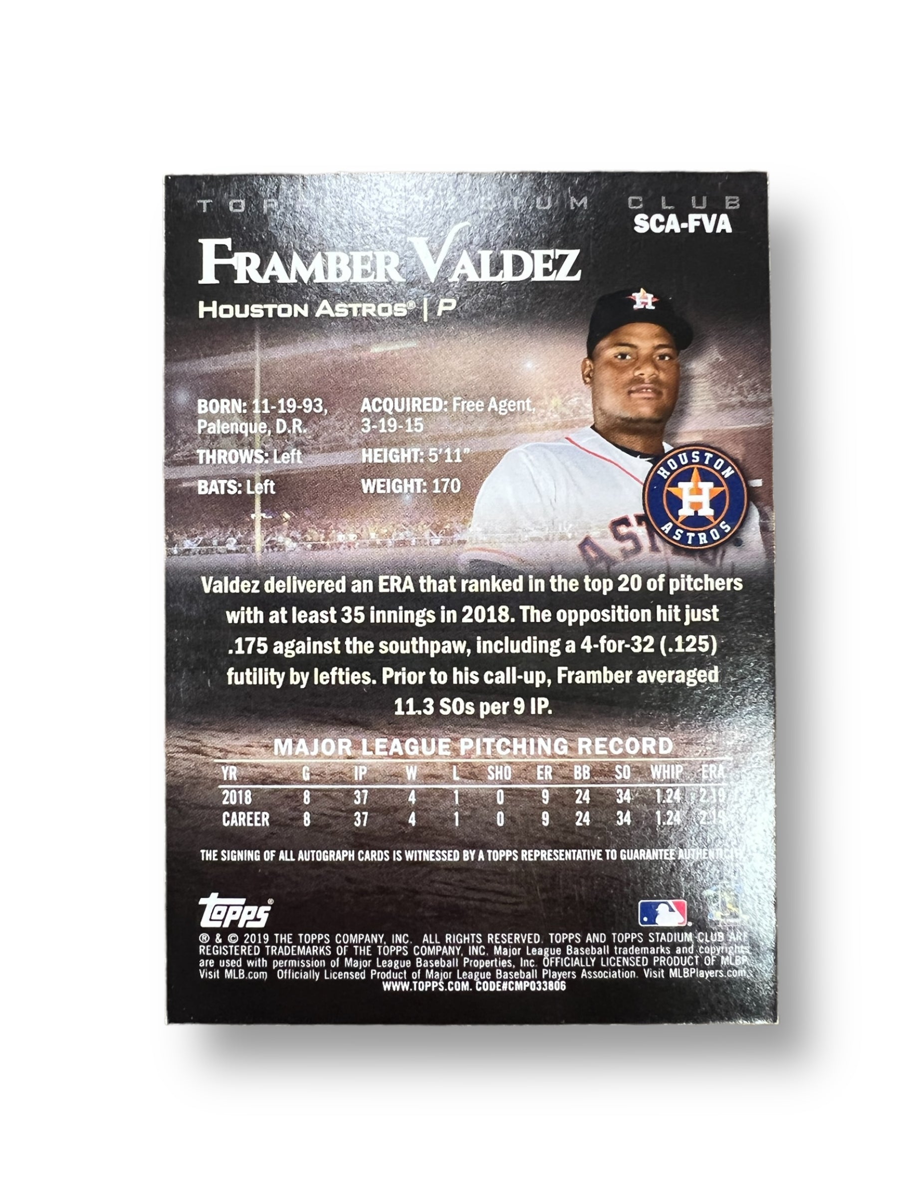Framber Valdez es un lanzador de béisbol profesional dominicano de los Astros de Houston de la Major League Baseball. Valdez firmó con los Astros como agente libre internacional en 2015 e hizo su debut en la MLB en 2018