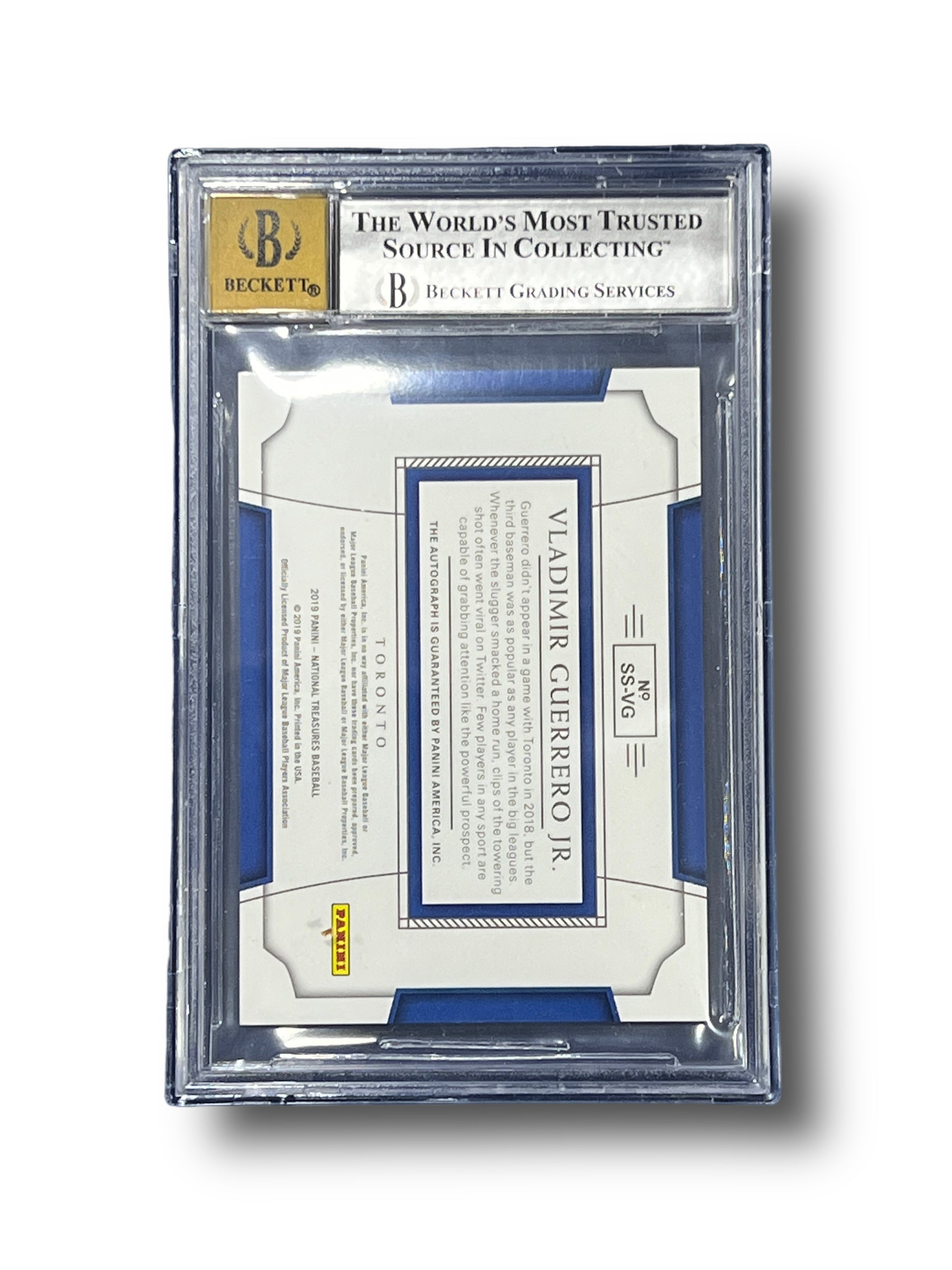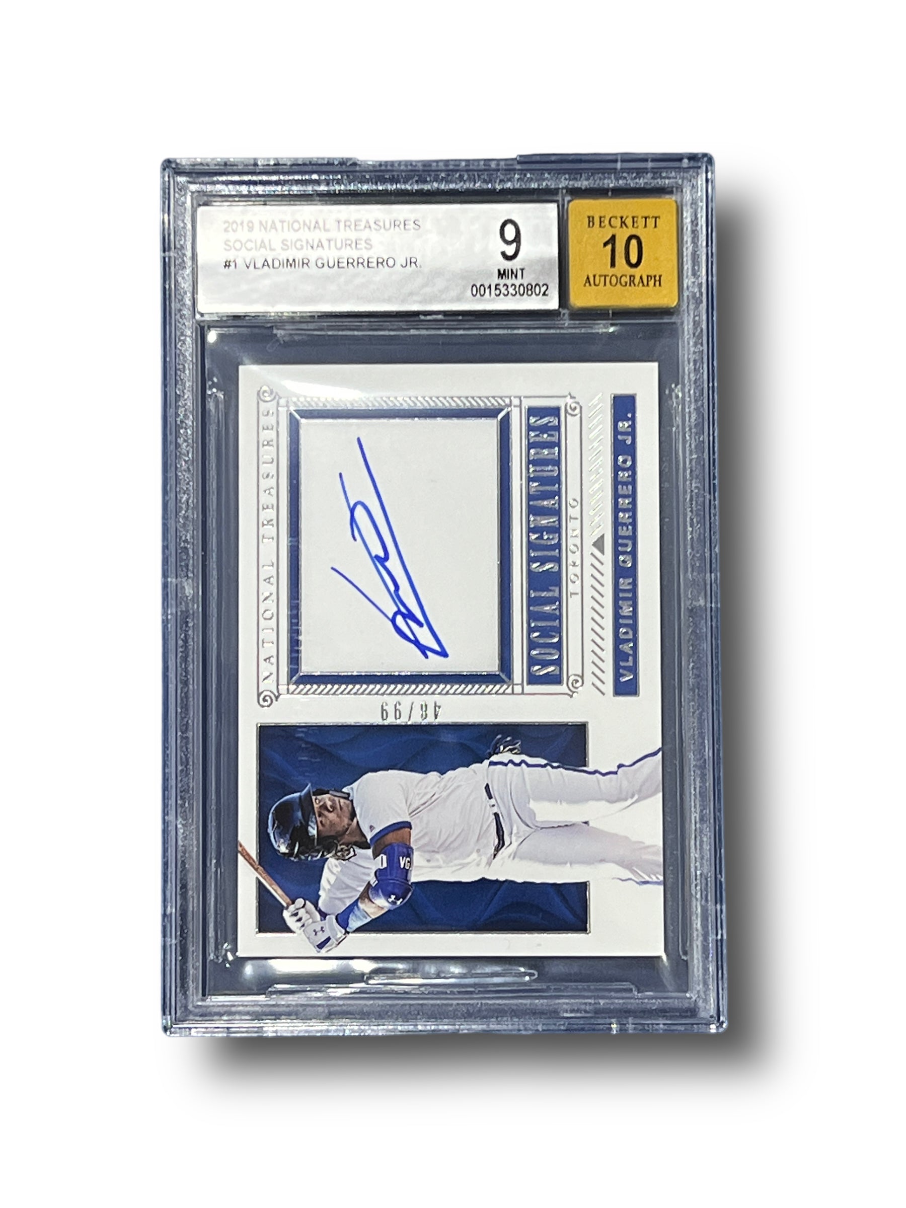 Tarjeta del jugador Vladimir Guerrero grado 9/10, autografo, parche usado en juego, limitada a 99 piezas. 2019 National Treasures