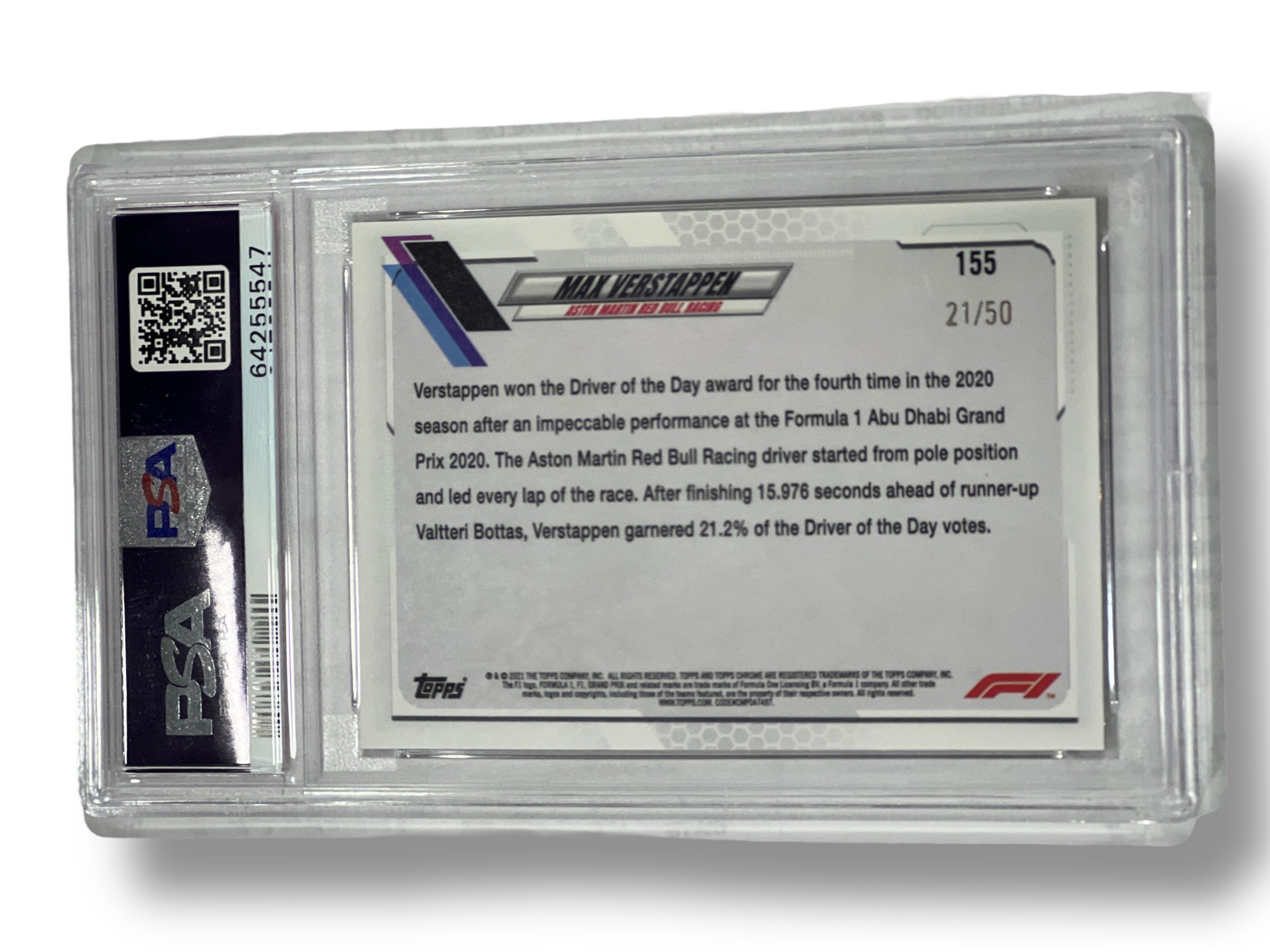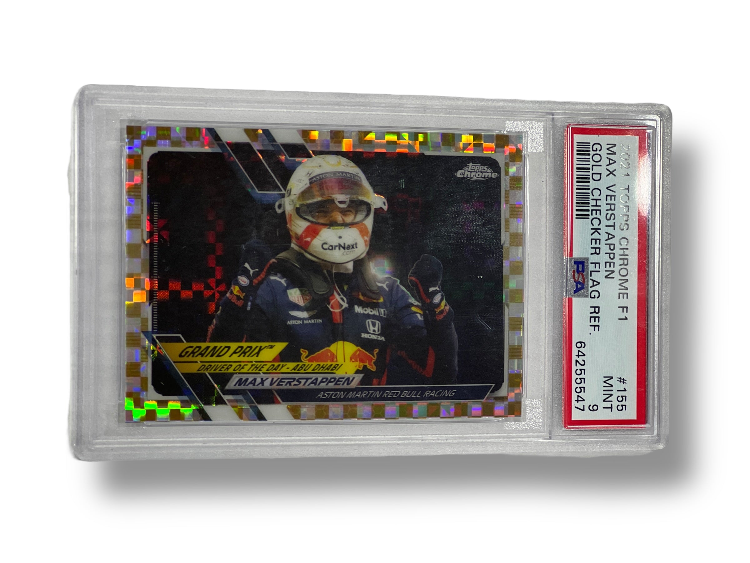 Tarjeta Panini Gold Checker de Max Verstappen, Grado 9.  (Red Bull)