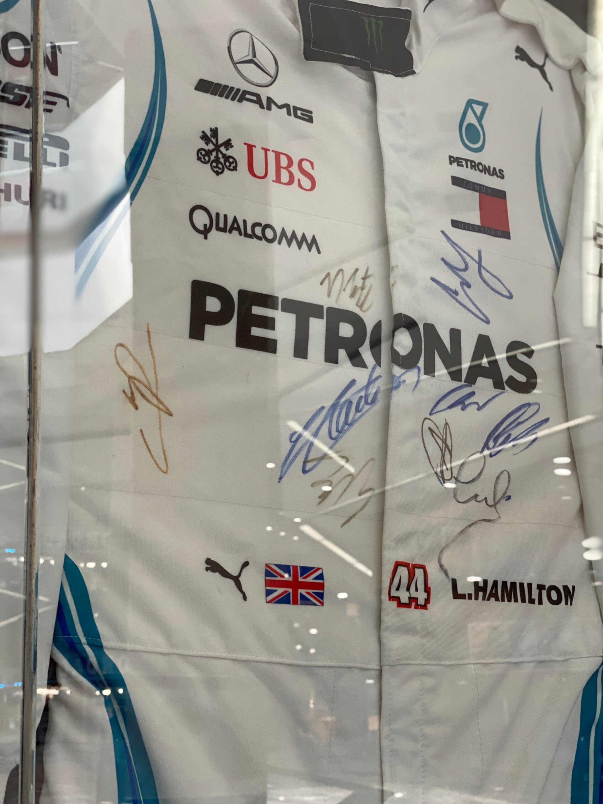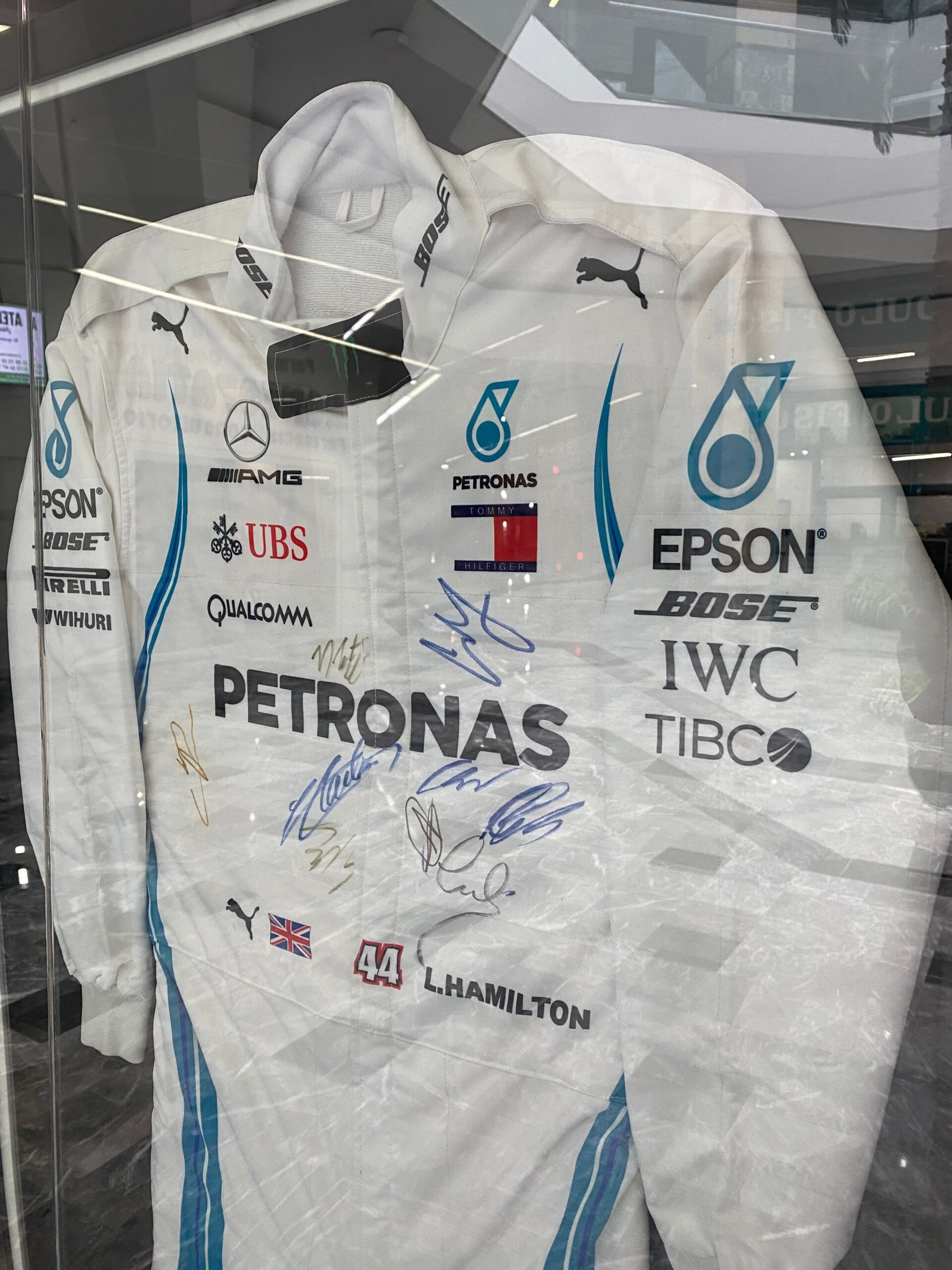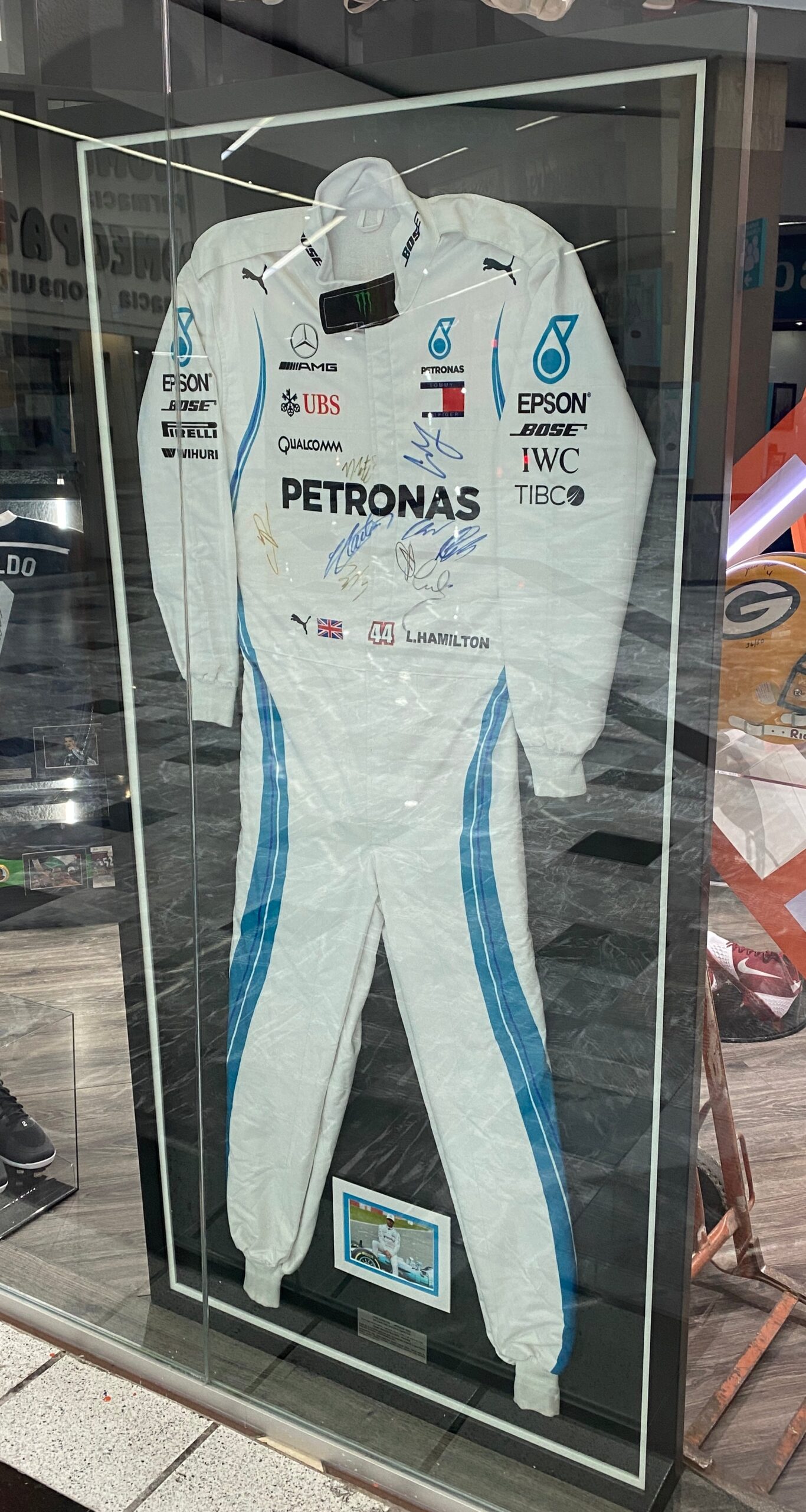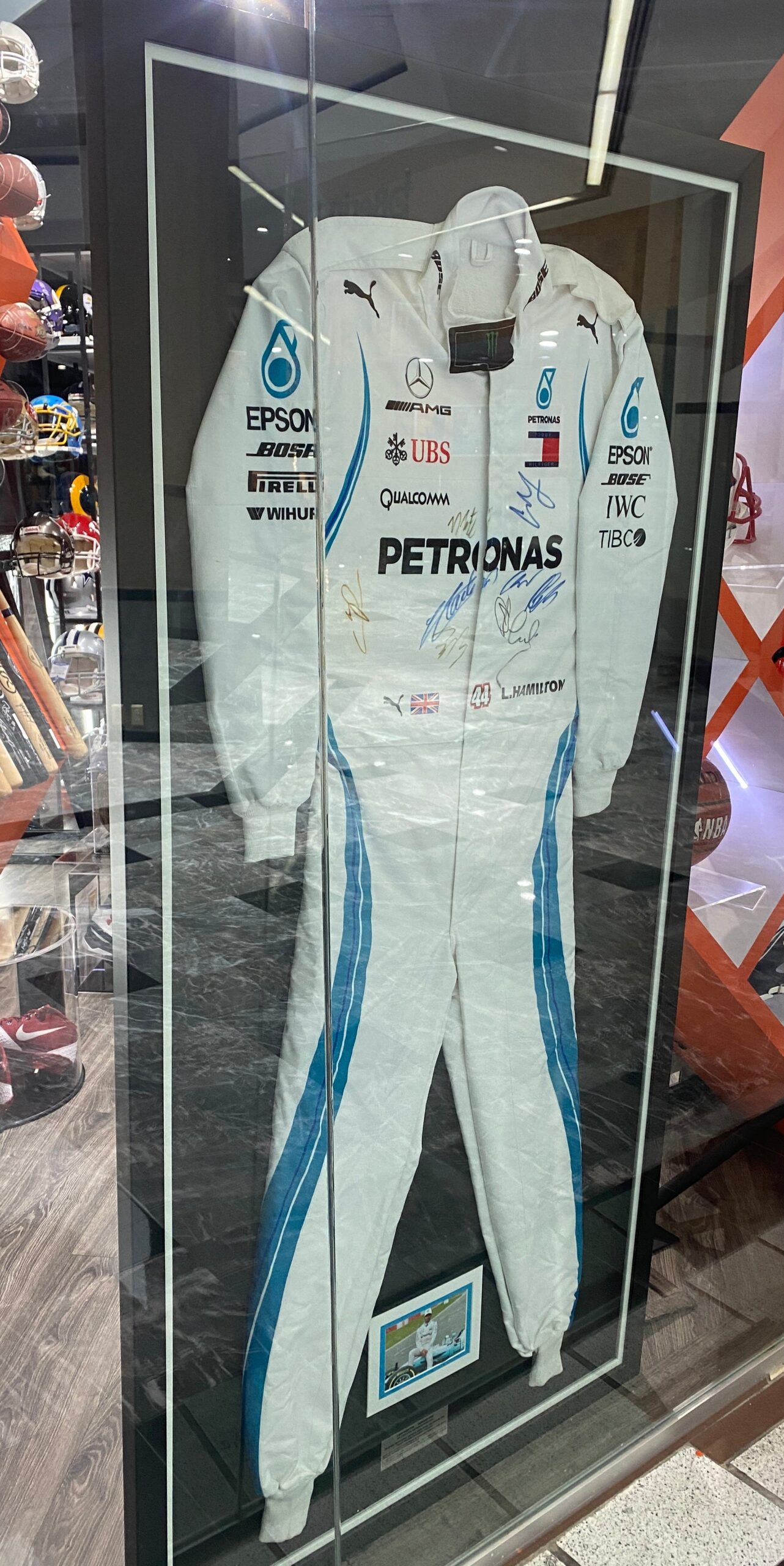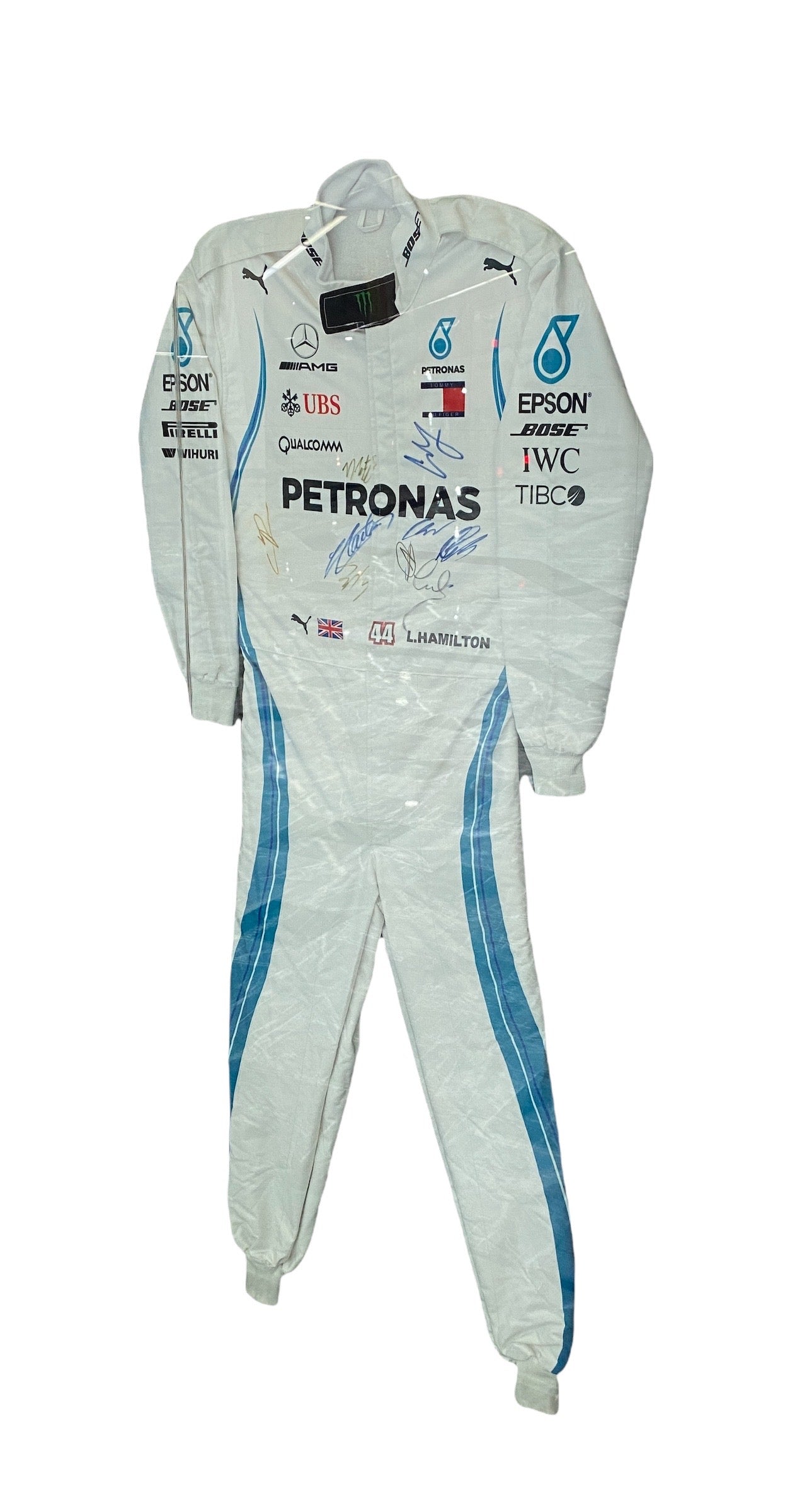 Traje Mercedes Benz Team autografiado por el piloto de la F1 Lewis Hamilton, Charles Leclerc, Carlos Sainz Jr., George Russell, Checo Pérez, Esteban Gutierrez, Antonio Giovinazzi, Callum Llott y Nicholas Latifi.